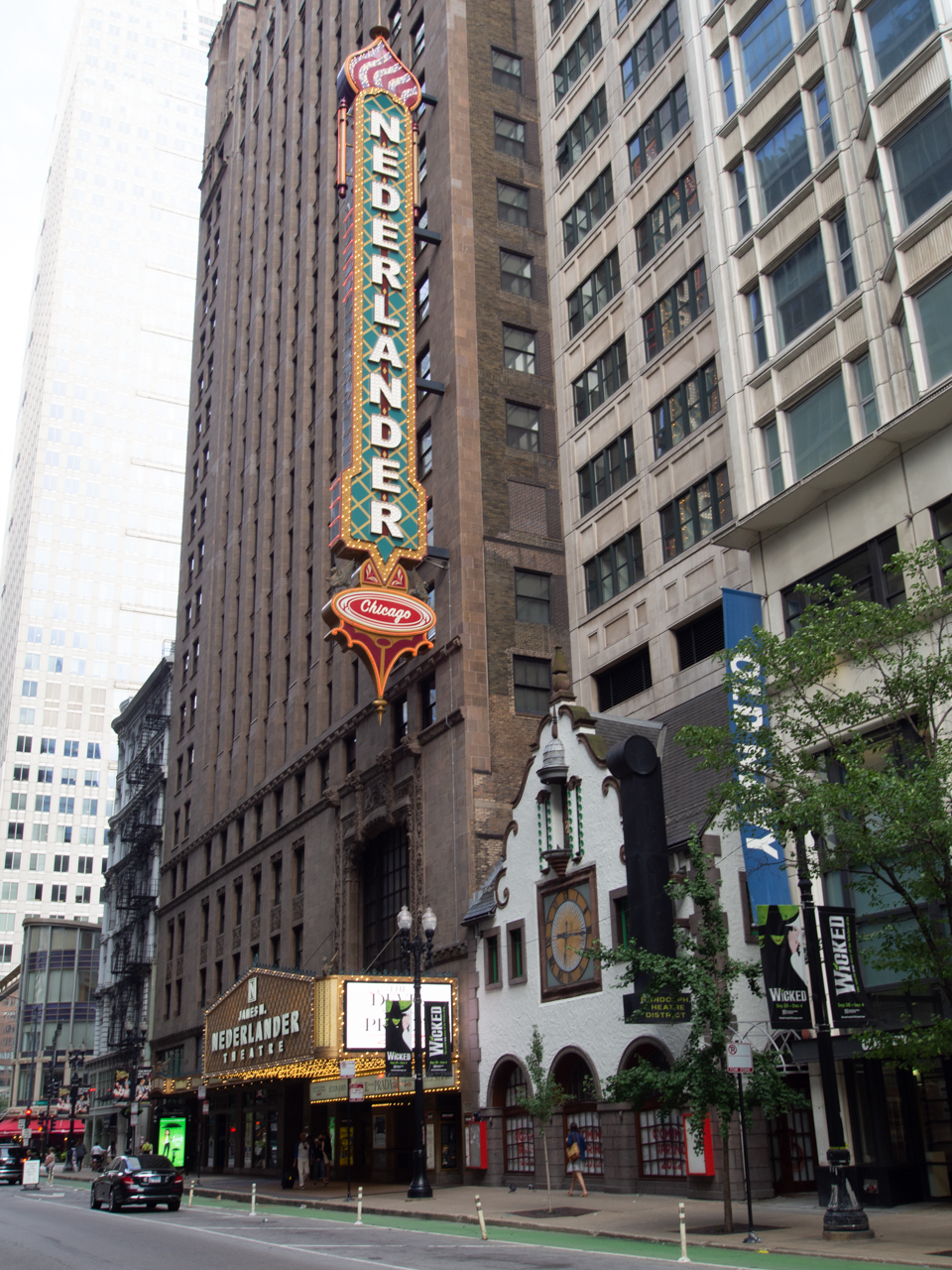 Le Chicago Theater n’est pas le seul dans le Loop, bien qu’il soit une des icônes de la ville depuis 1921, à quelques blocs on peut voir la belle affiche du James M. Nederlander Theatre installé dans un vieux cinéma de 1926.