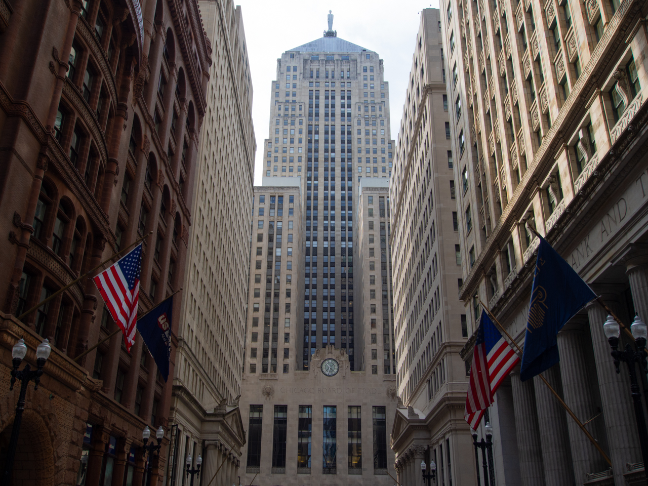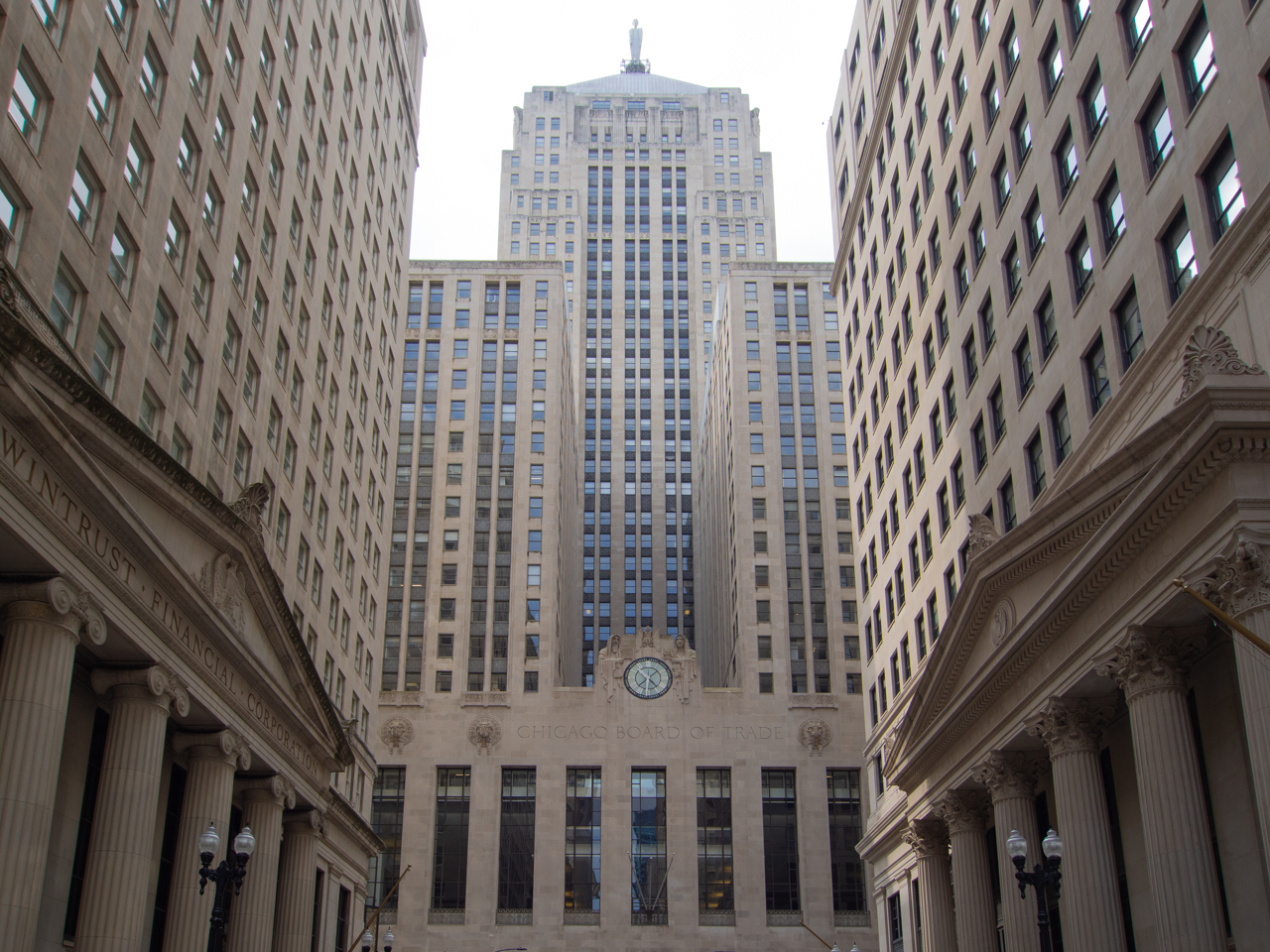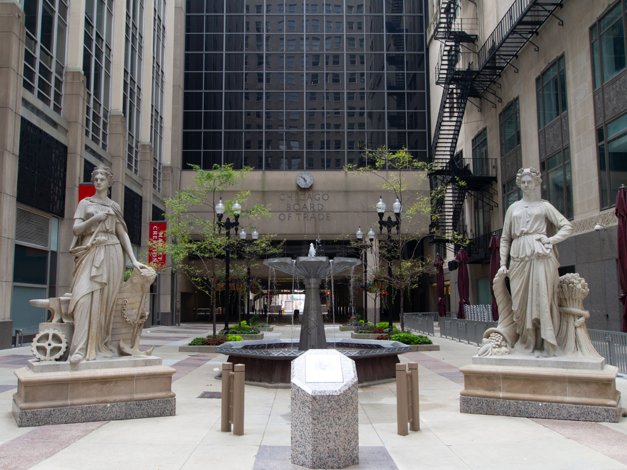 J’arrive dans le quartier financier de Chicago. Il faut savoir que Chicago a une place importante dans la finance mondiale, notamment pour les produits agricoles. La tour du Chicago Board of Trade ferme la rue et à ses pieds on retrouve les statues qui étaient installé en lieu et place de son prédécesseur.