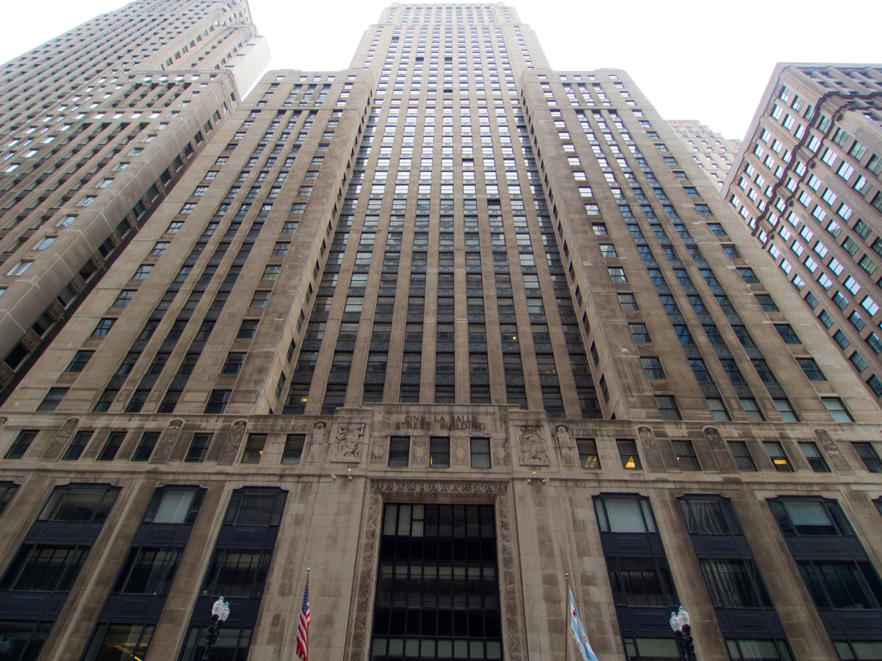 L’ancien bâtiment de la bourse avait du être détruit pour être construit en plus grand, ce fut d’ailleurs le plus haut building de Chicago pendant une trentaine d’année. Sur le toit du bâtiment on peut voir une immense statue art déco. Le quartier est vide en ce Dimanche, c’est tant mieux pour en admirer la grandeur avec des édifices qui rivalisent d’opulence et de prestance.