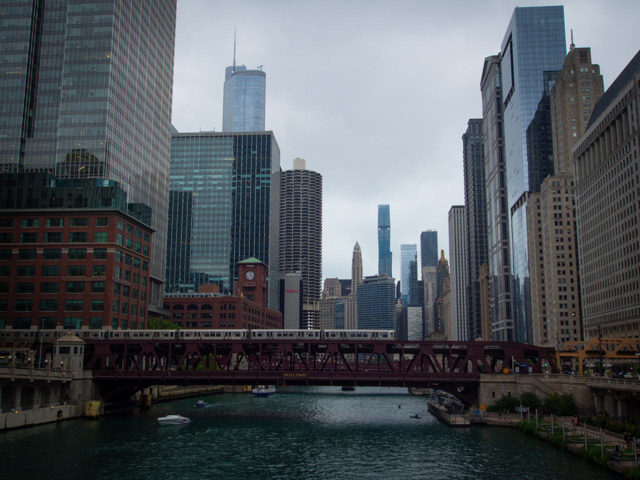 Malheureusement, les deux après midi de ce week-end n’ont pas offert un temps idéal pour la découverte de Chicago, heureusement que je me suis levé pour profiter un peu du soleil présent le matin. Cette ville est très intéressante et cela doit être super de pouvoir ajouter une journée à la plage sous les buildings mais aussi d’obtenir un ticket pour un match de baseball, de football ou encore mieux pour un enfant né dans les années 80, assister à un match de basket des Bulls, l’équipe de basket la plus mythique de NBA. Avant de retourner à l’aéroport en cette fin de week-end, je prends une dernière photo depuis le dernier pont avant la jonction de la Chicago River, j’attends que le métro passe pour capturer un dernier cliché de Chicago.
