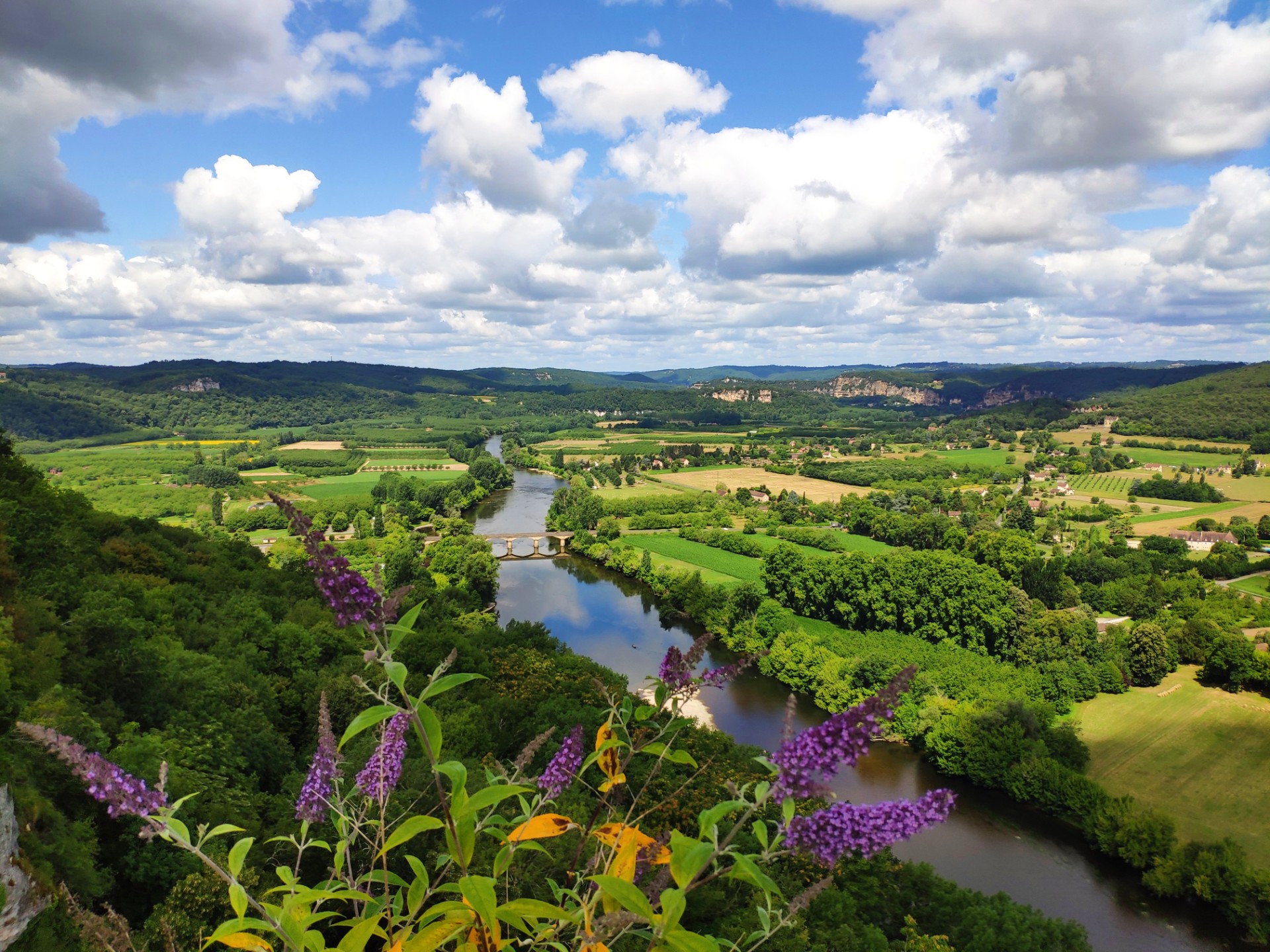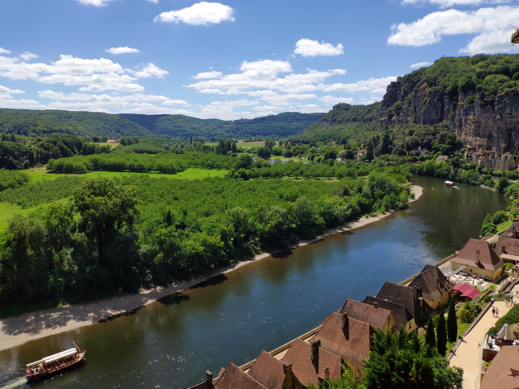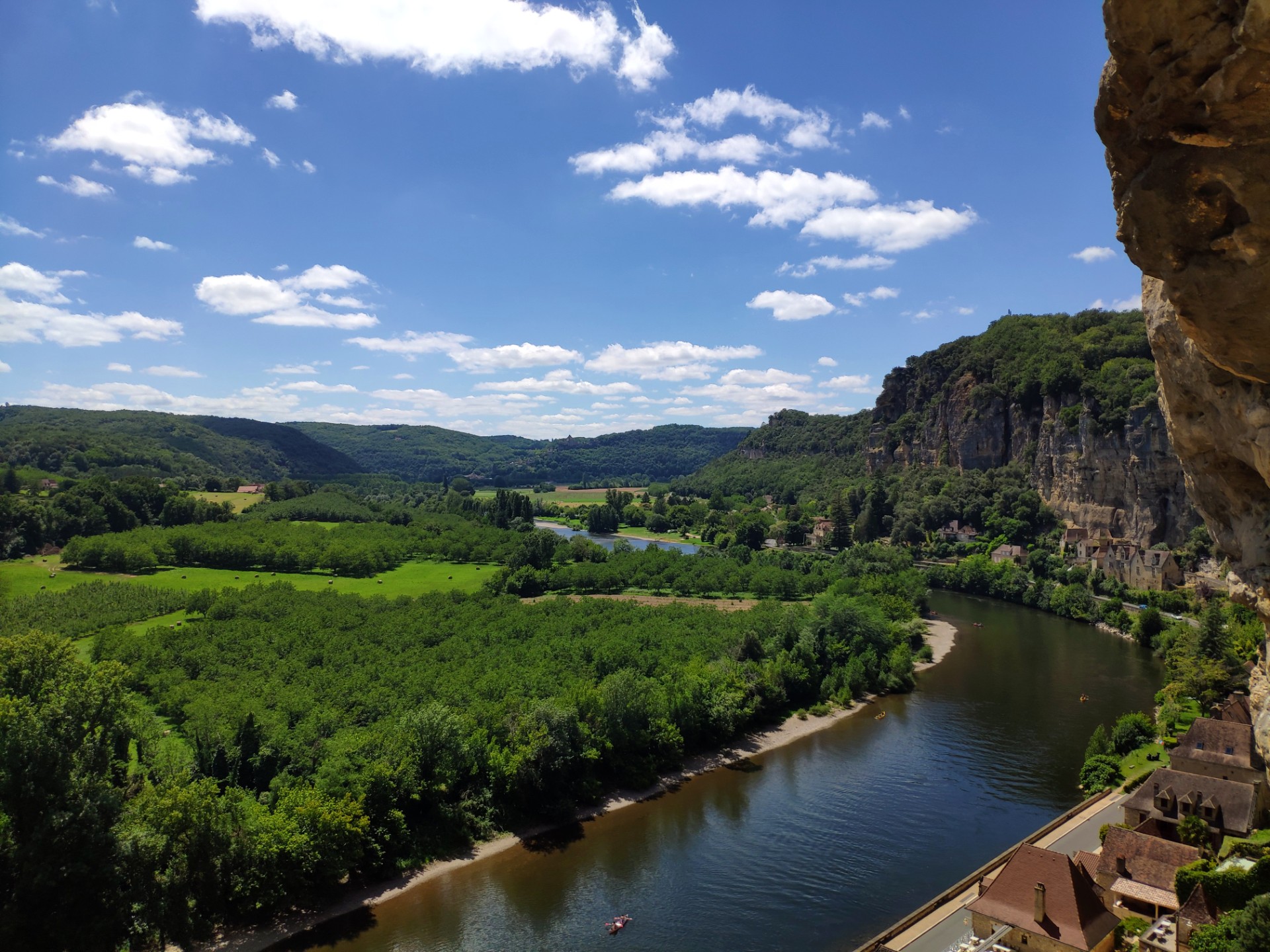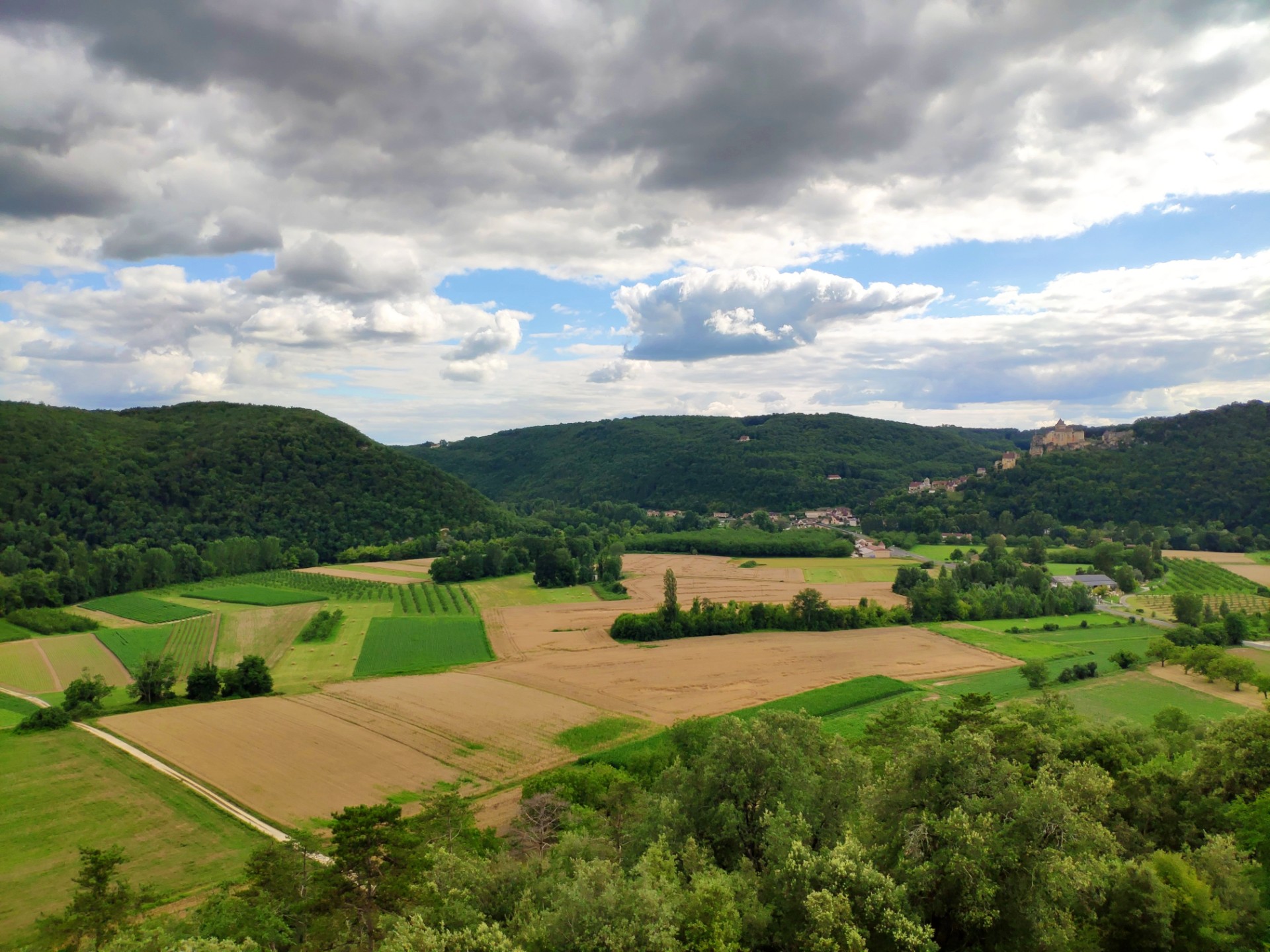 Depuis le promontoire, on domine la vallée de la Dordogne et sa campagne. Au loin les chateaux de Beynac et Castelnaud, le village de la Roque Gageac, et les méandres de la rivière. Quelle vue incroyable avec les nuages qui créent des jeux d’ombres sur la verdoyante campagne.