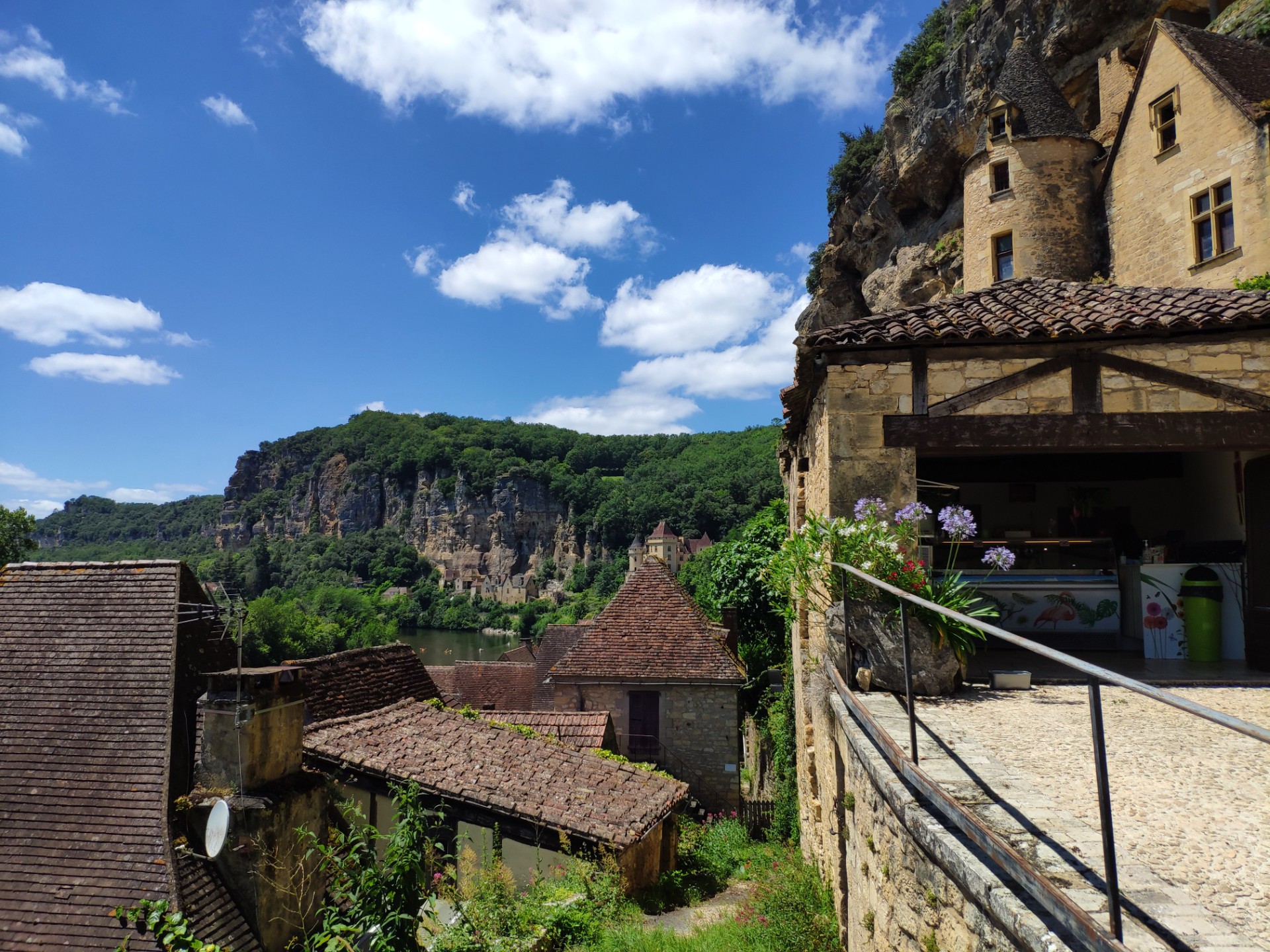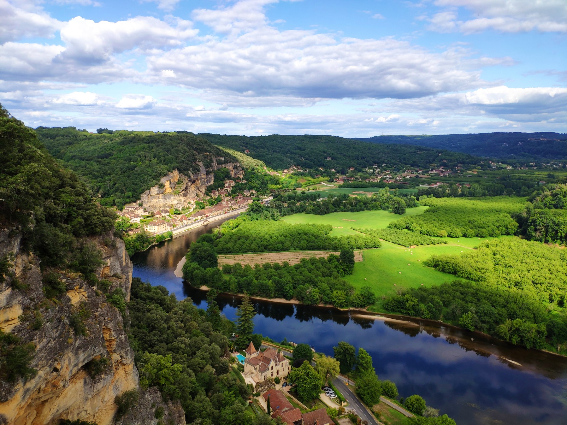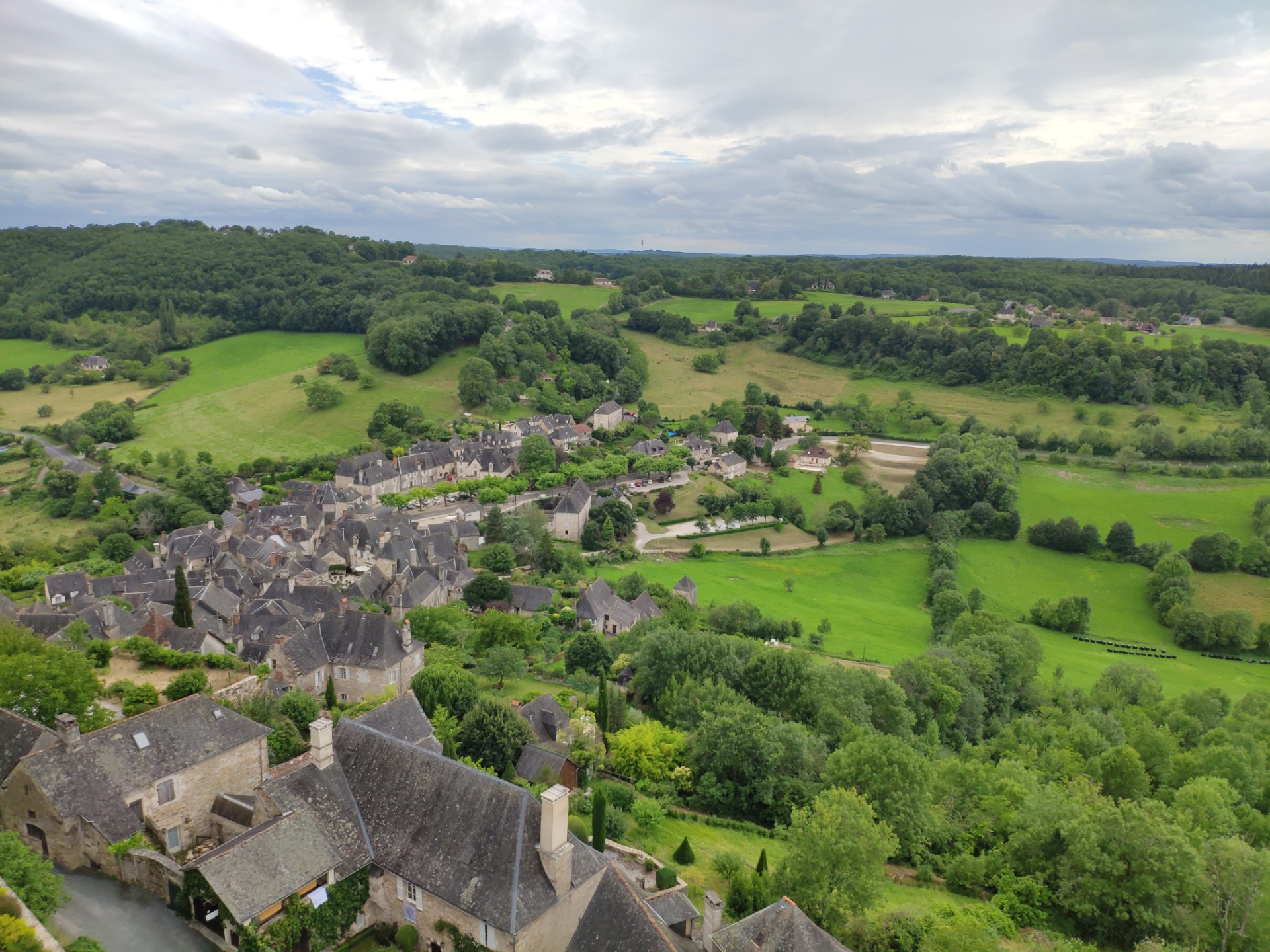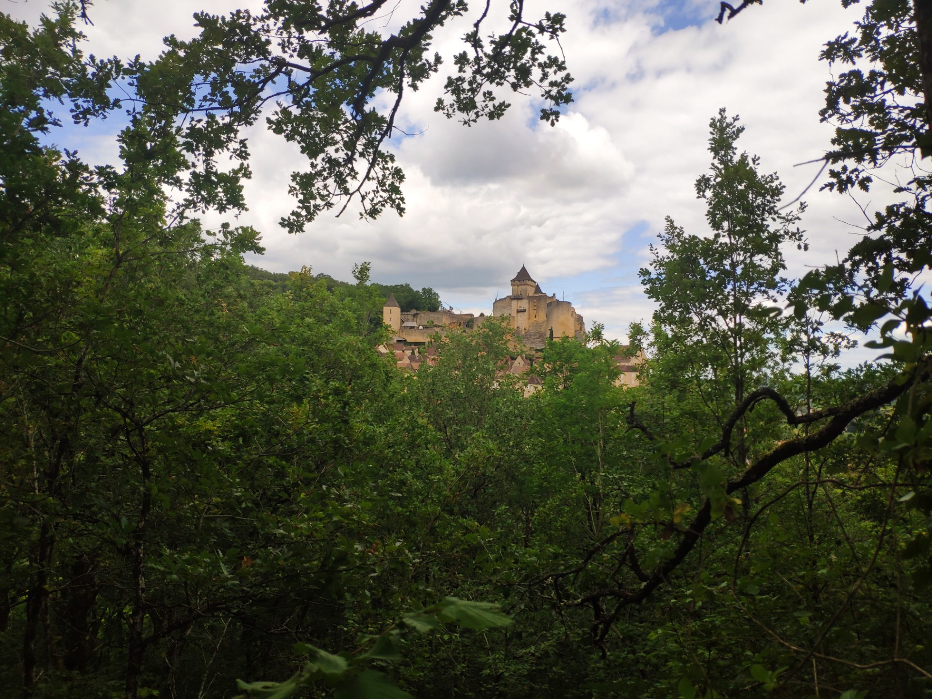 Depuis le promontoire, on domine la vallée de la Dordogne et sa campagne. Au loin les chateaux de Beynac et Castelnaud, le village de la Roque Gageac, et les méandres de la rivière. Quelle vue incroyable avec les nuages qui créent des jeux d’ombres sur la verdoyante campagne.