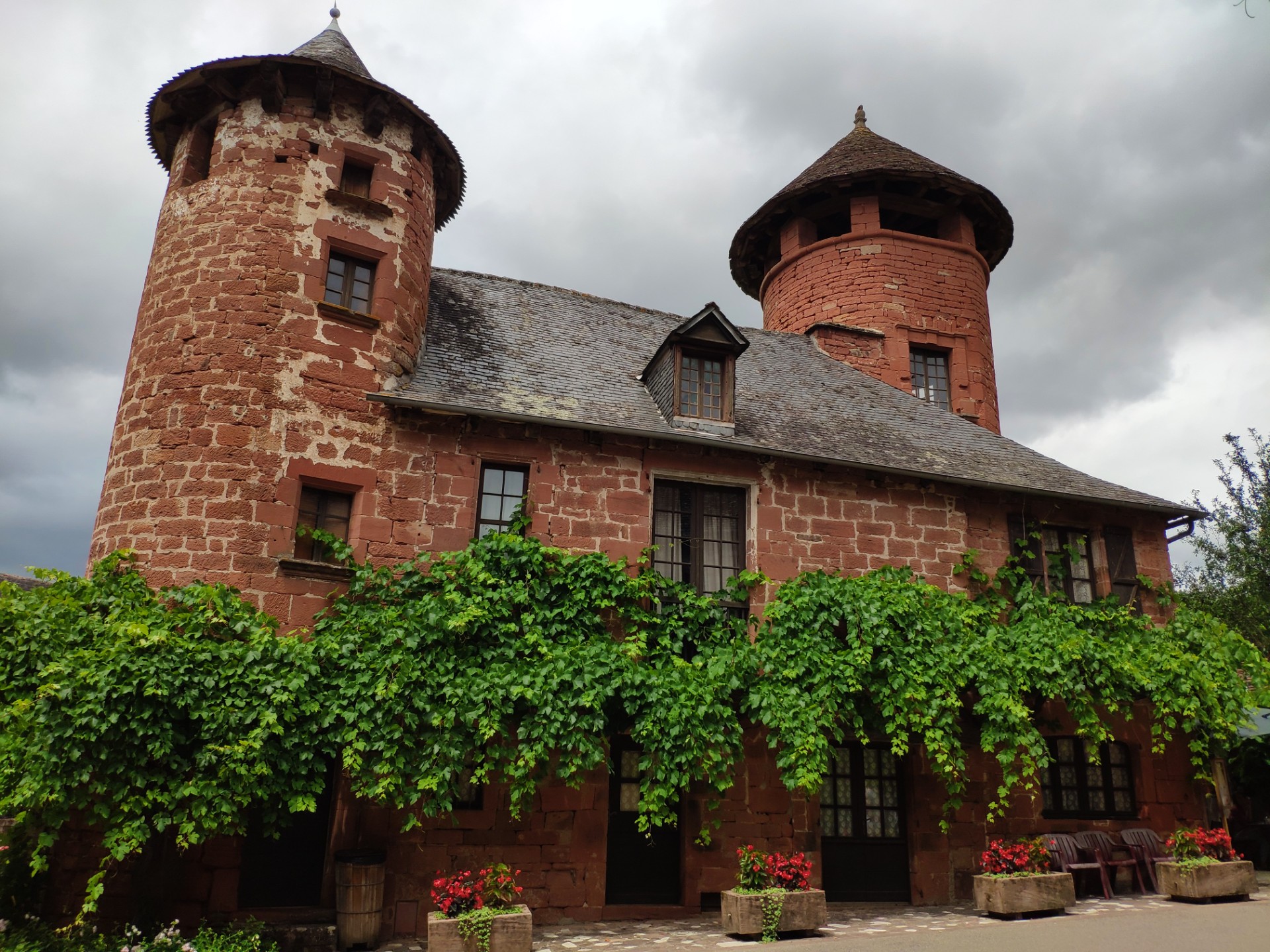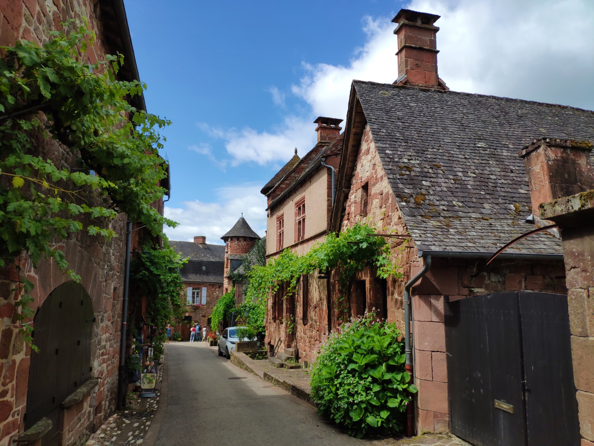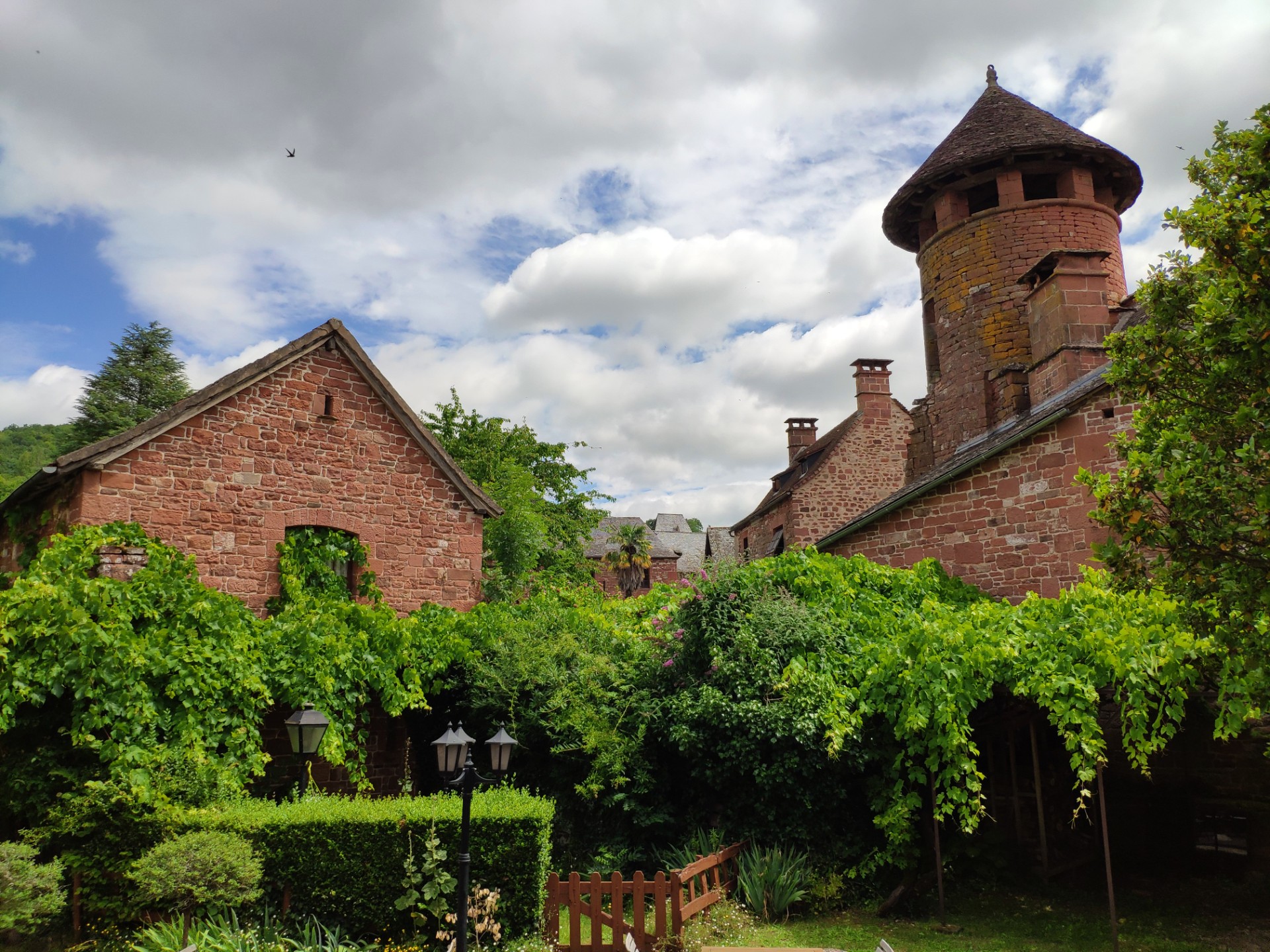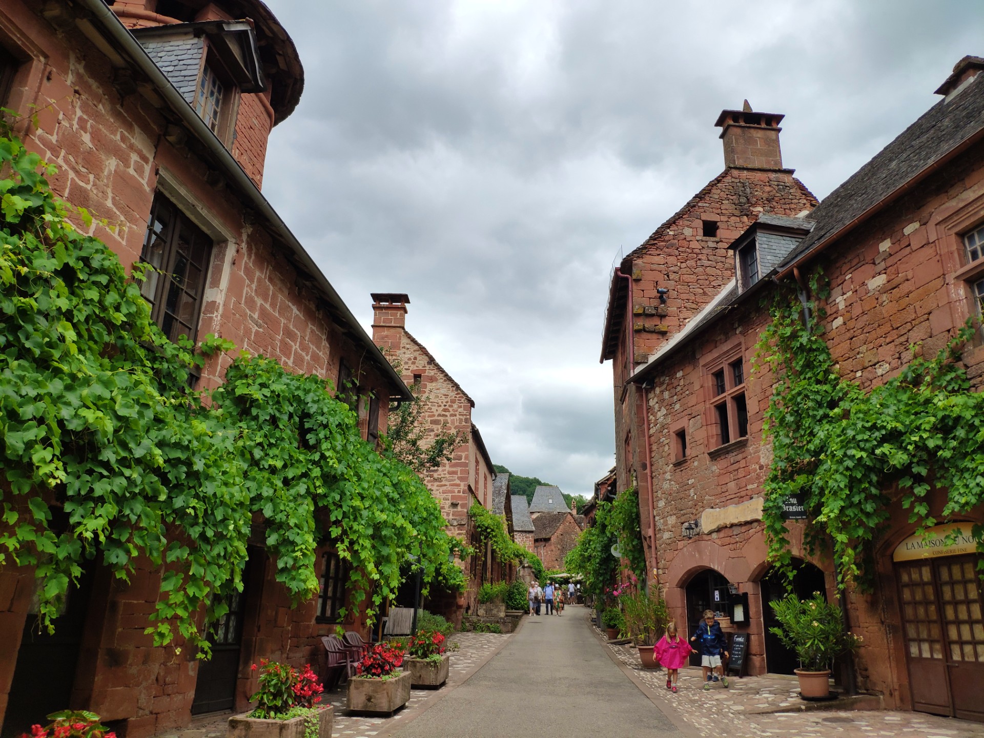 Le temps n’est pas terrible ces jours-ci alors on décide de partir un peu plus de loin de Sarlat, en direction du département de la Corrèze, en espérant trouver un temps moins maussade. C’est le premier village classé parmi les plus beaux villages de France qui nous attire dans cette région, le célèbre village de Collonges La Rouge. Après une heure de voyage sur les sinueuses routes de campagne du Périgord, nous arrivons à destination sur le parking à l’entrée du village, il n’y a pas beaucoup de voitures garées par rapport à la capacité de stationnement, on se sent un peu privilégié de venir dans ces conditions.