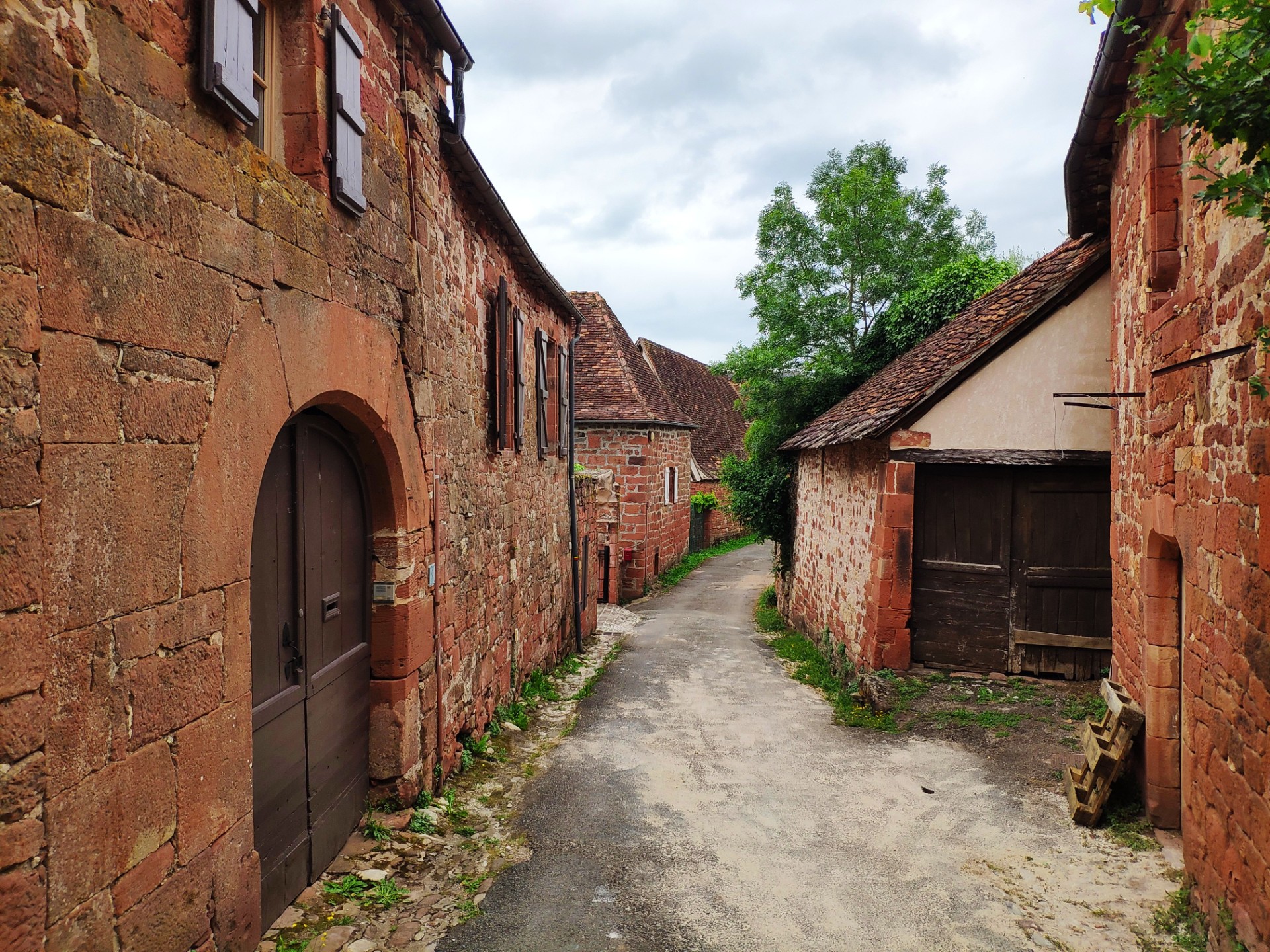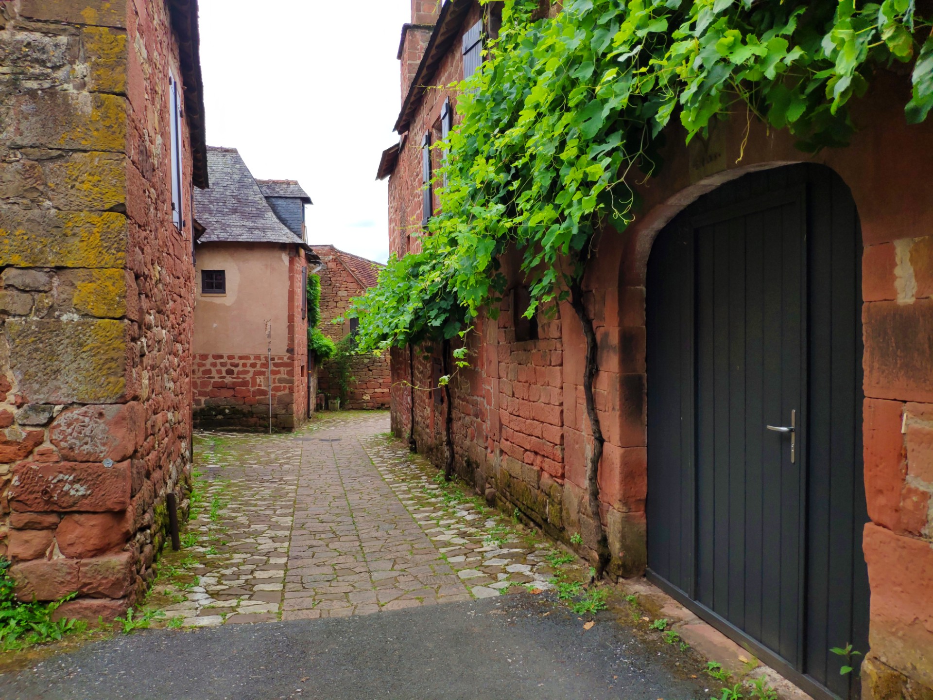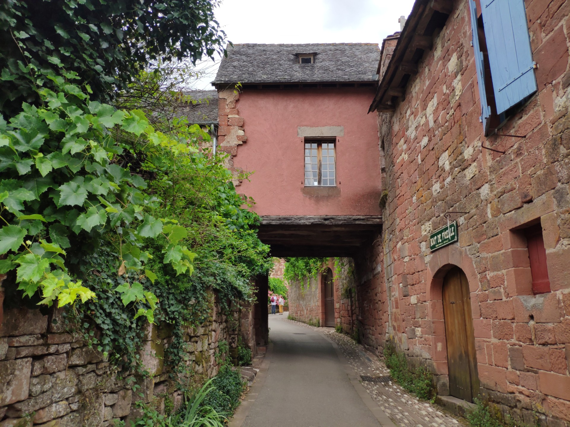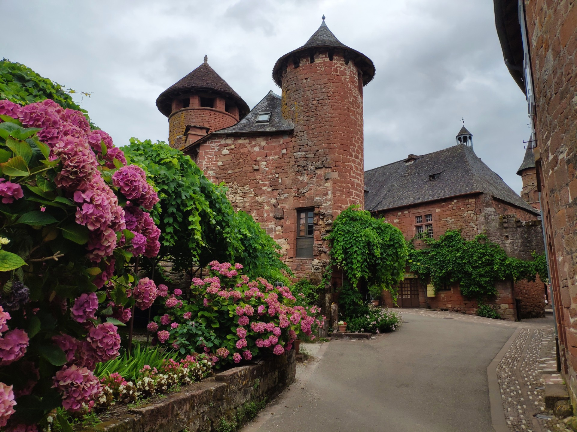 Le temps n’est pas terrible ces jours-ci alors on décide de partir un peu plus de loin de Sarlat, en direction du département de la Corrèze, en espérant trouver un temps moins maussade. C’est le premier village classé parmi les plus beaux villages de France qui nous attire dans cette région, le célèbre village de Collonges La Rouge. Après une heure de voyage sur les sinueuses routes de campagne du Périgord, nous arrivons à destination sur le parking à l’entrée du village, il n’y a pas beaucoup de voitures garées par rapport à la capacité de stationnement, on se sent un peu privilégié de venir dans ces conditions.