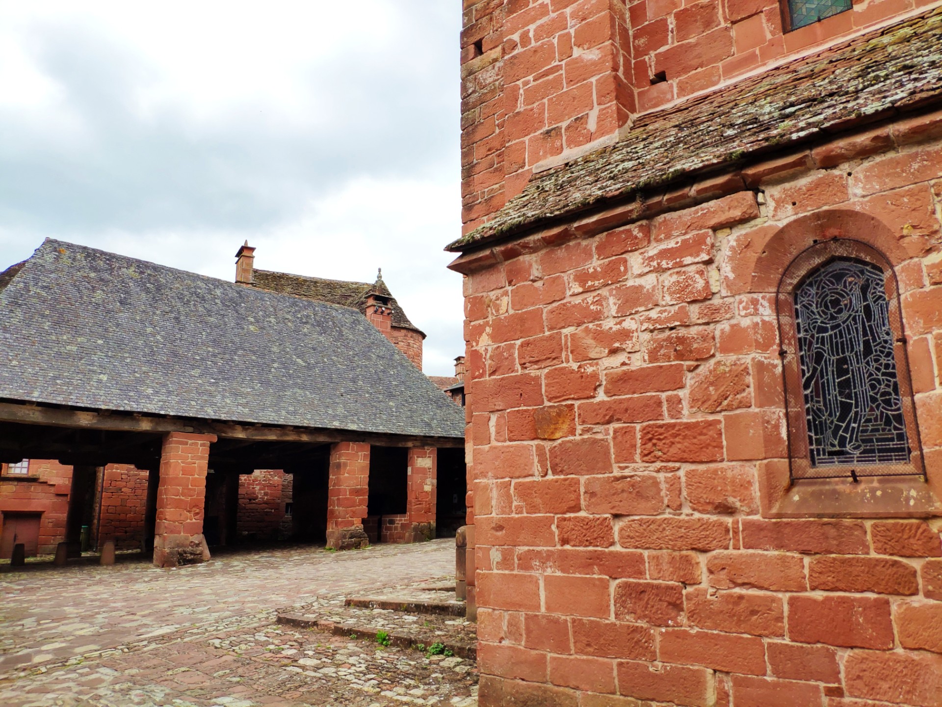 Sur la place principale au centre du village, on trouve un marché couvert fait de colonnes de pierre rouges elles aussi, qui jouxte l'église de la même teinte