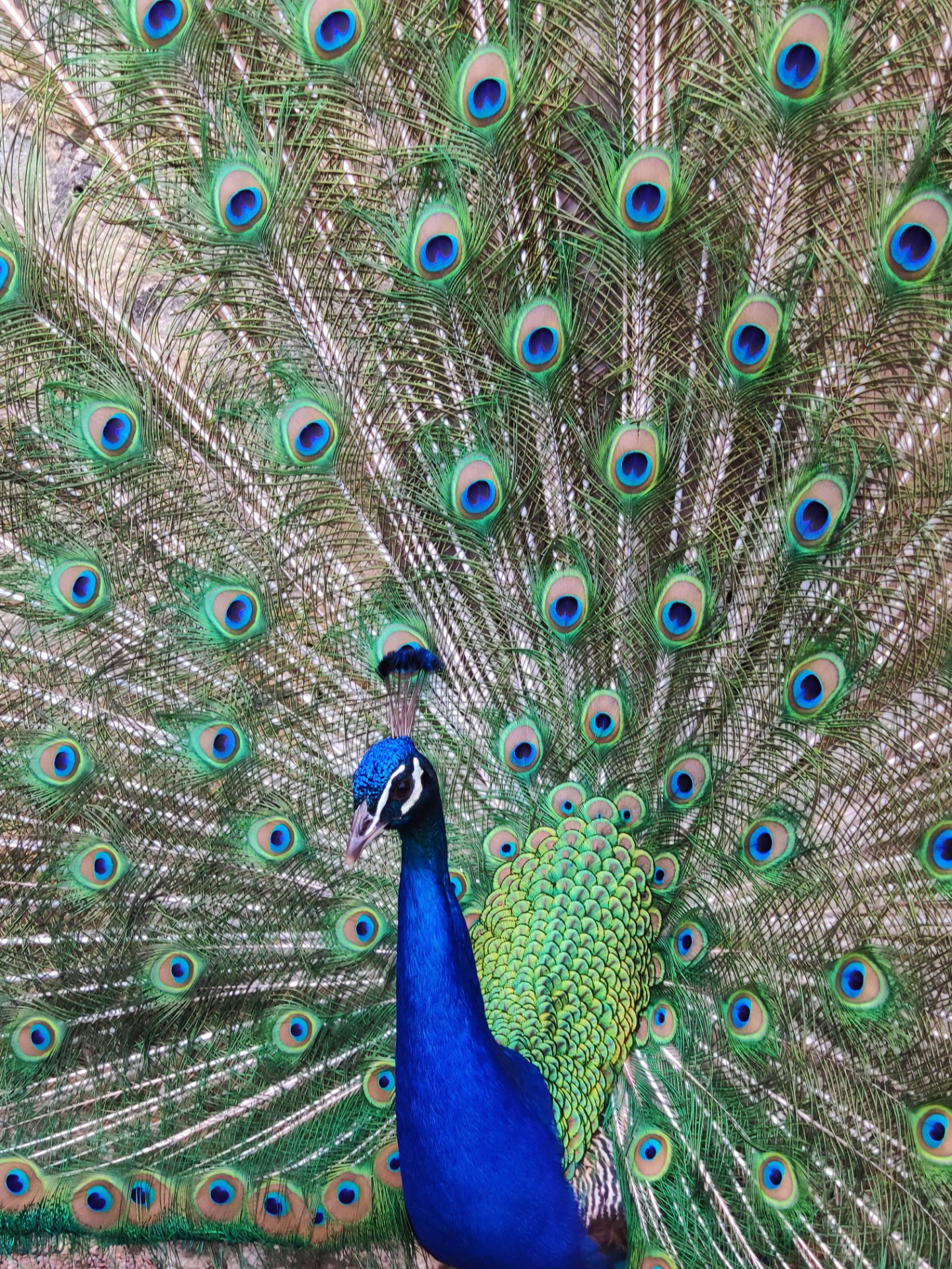 On est conquis par le lieu, des paons en liberté se promènent entre les bosquets et nous font de superbes roues.