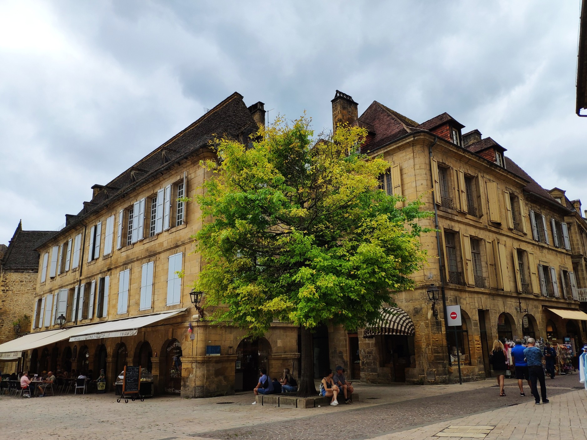 Sur la place principale de Sarlat, on trouve ce magnifique arbre qui tranche avec les pierres blondes.
