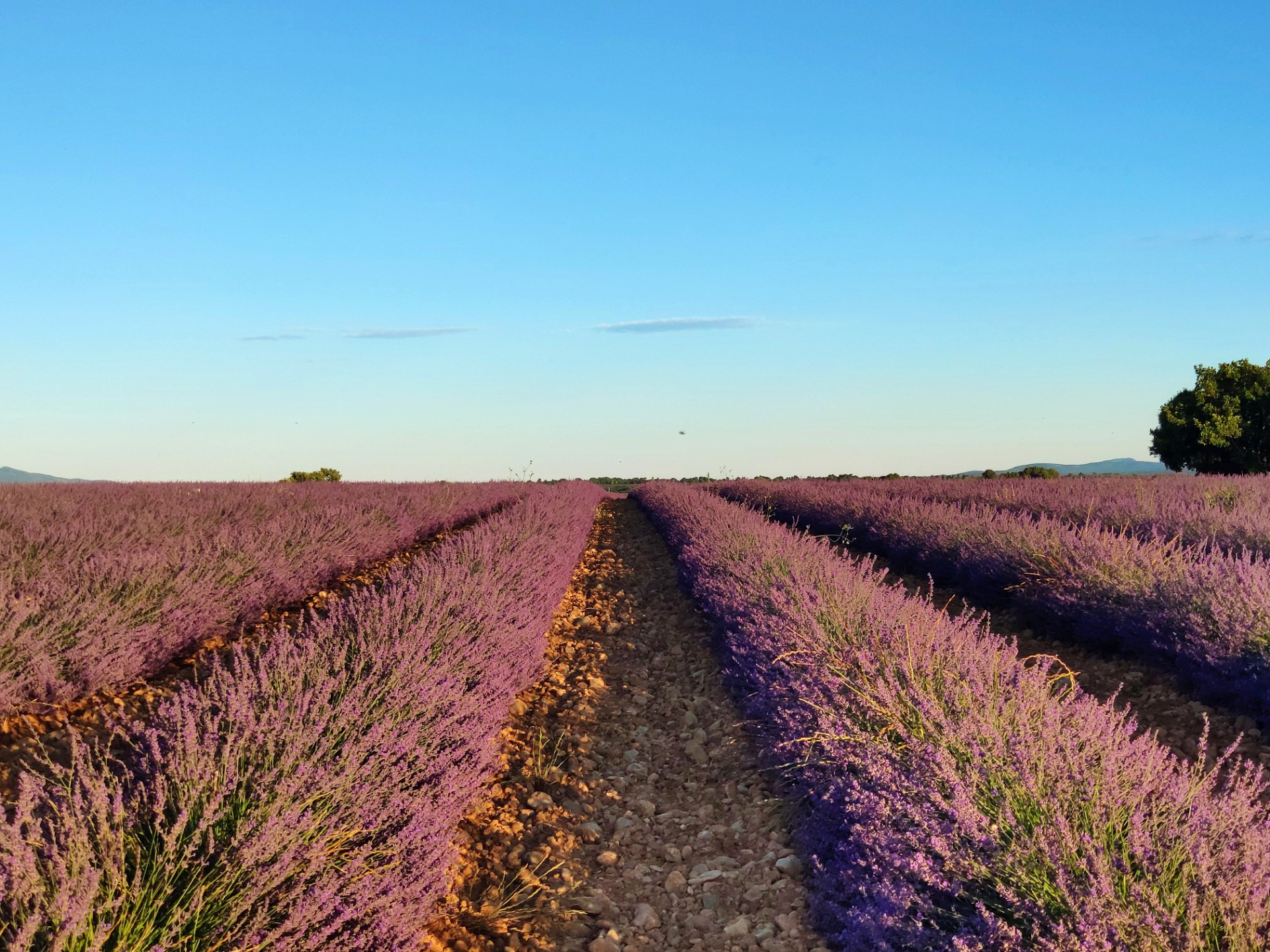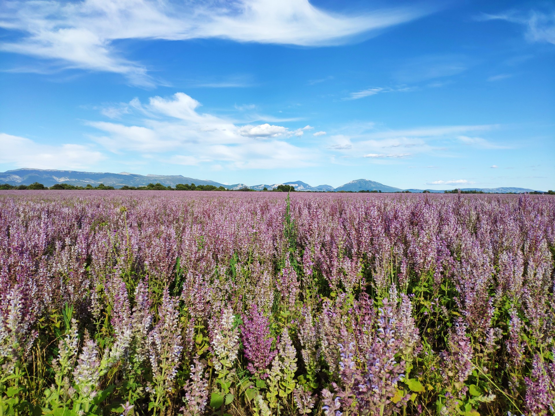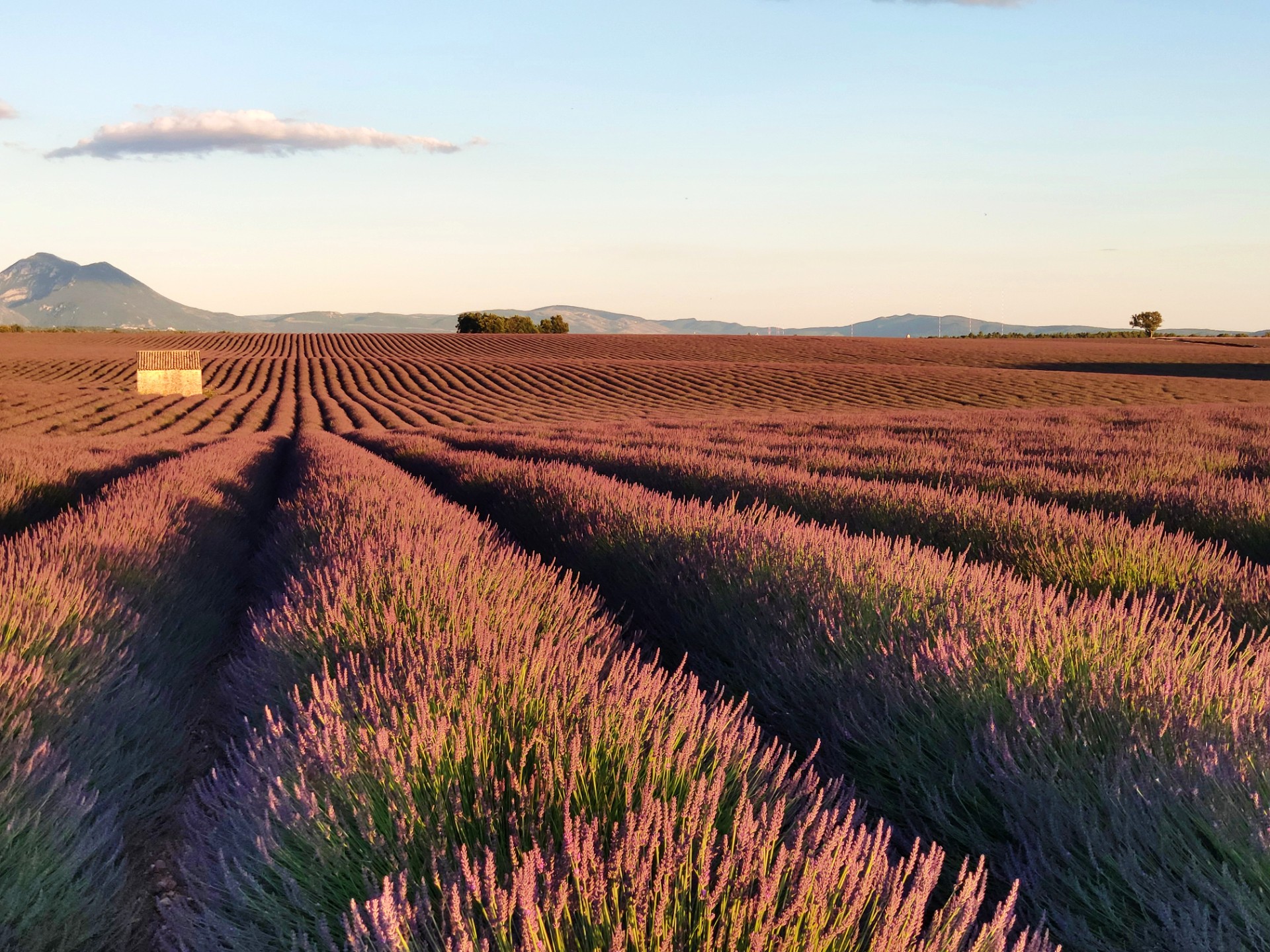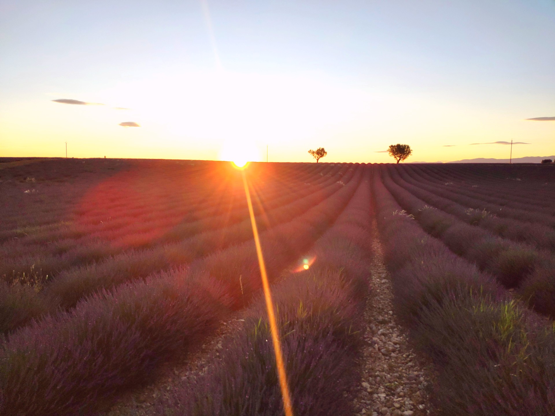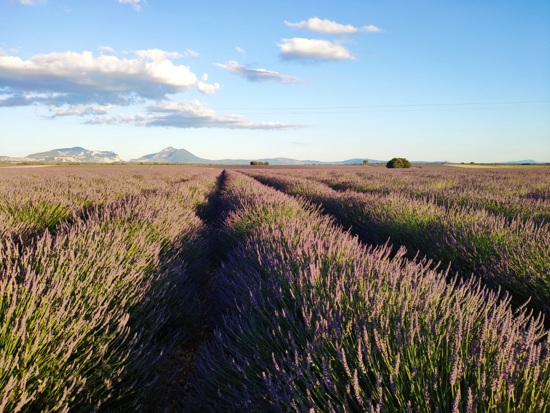 Ce qui est idéal avec les voyages fin Juin, c’est qu’il fait jour très tard, on peut donc d’autant plus profiter de nos journées. Nous arrivons à Valensole en début de soirée, dès la fin de la montée sur le plateau, on est accueilli par des champs de lavande à perte de vue. Mais pas que, on trouve aussi des immenses champs de blé et de sauge à perte de vue.