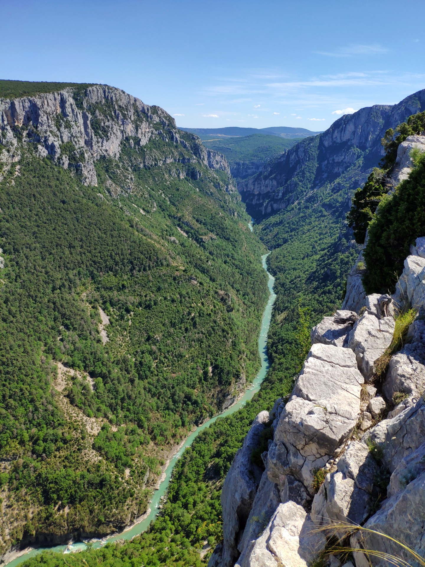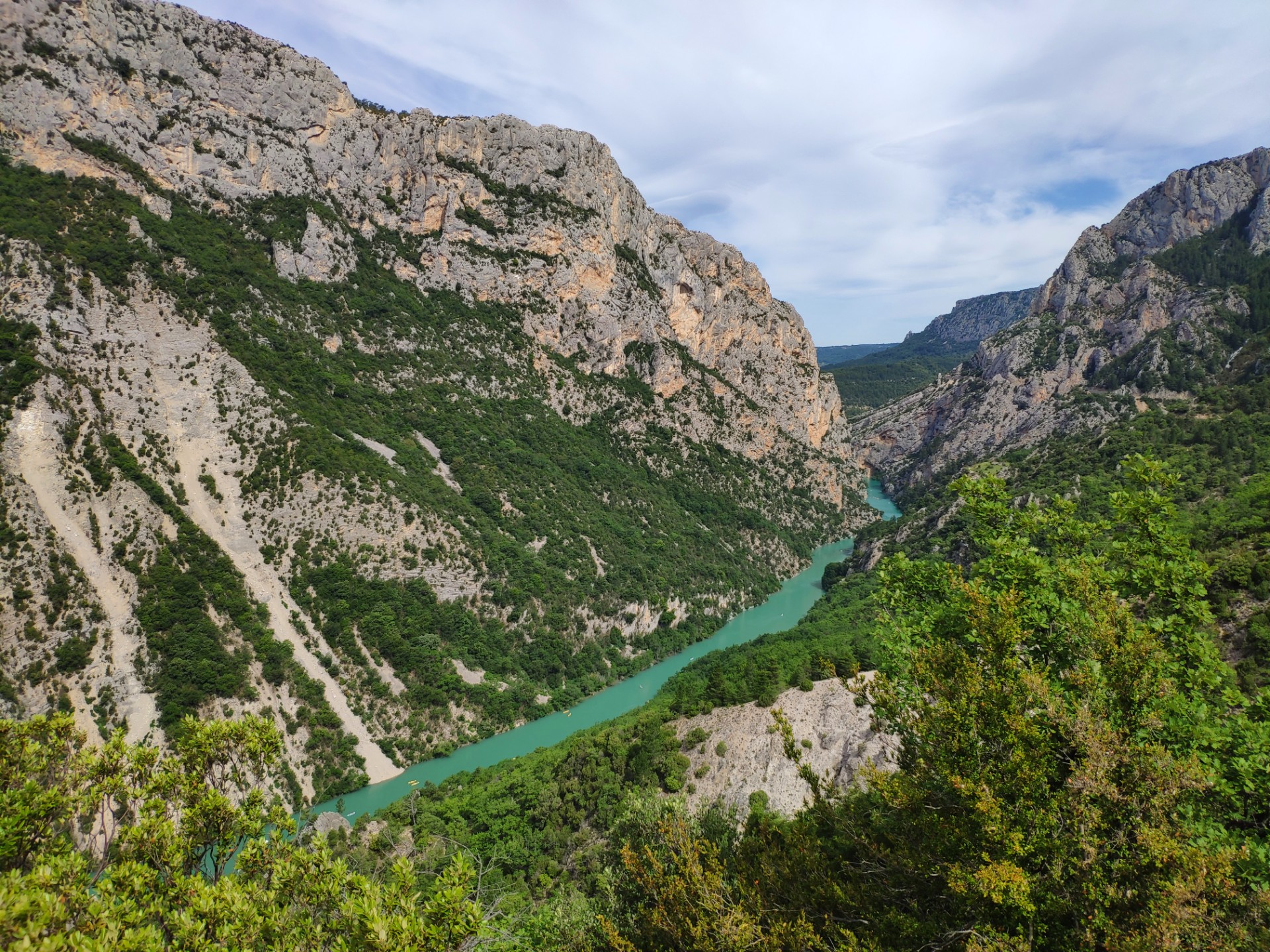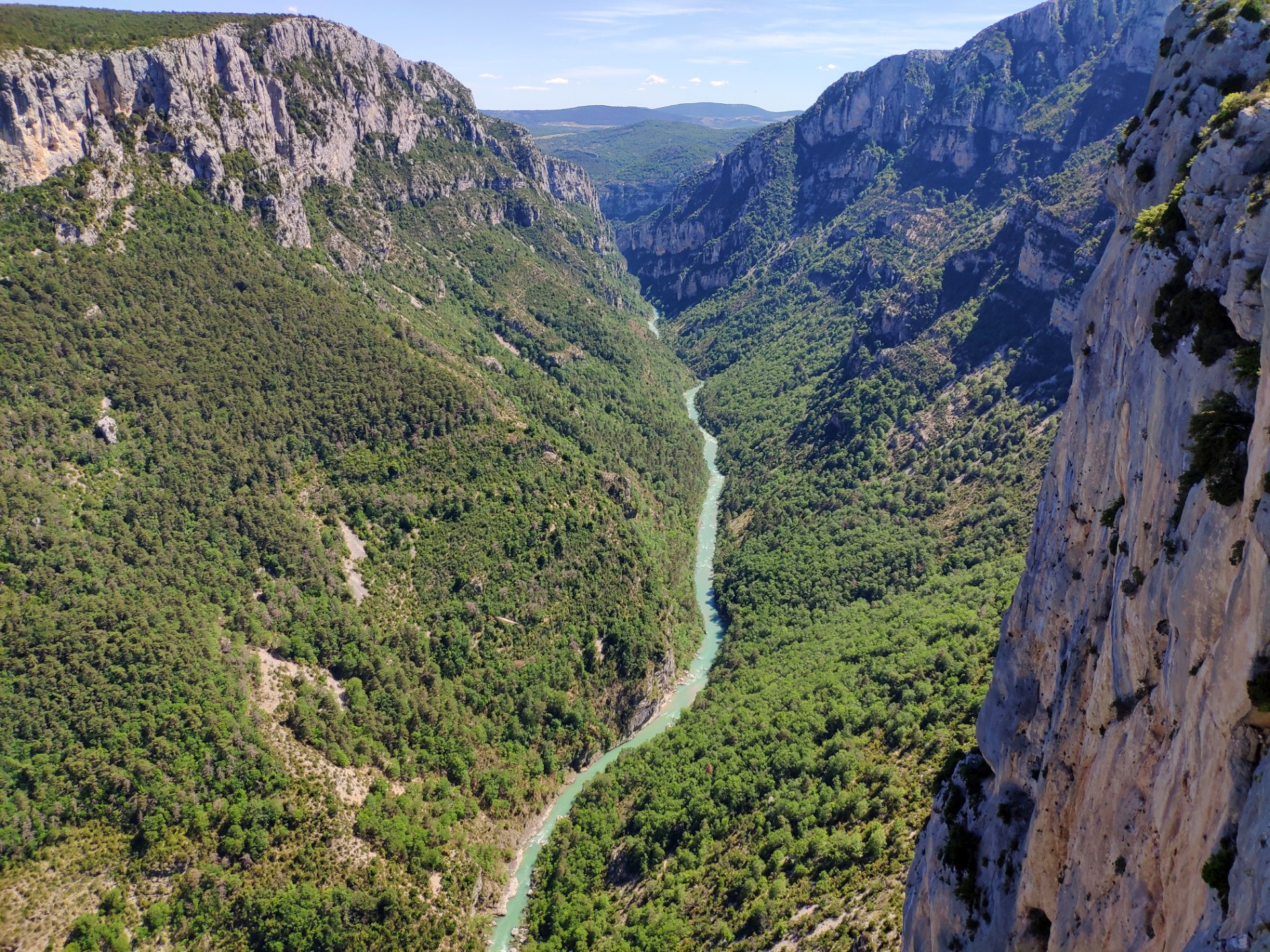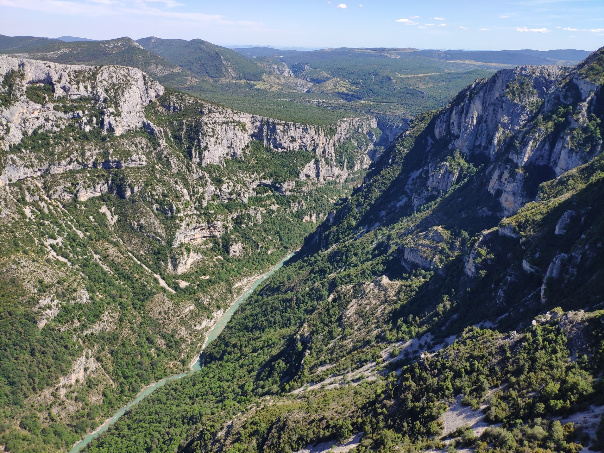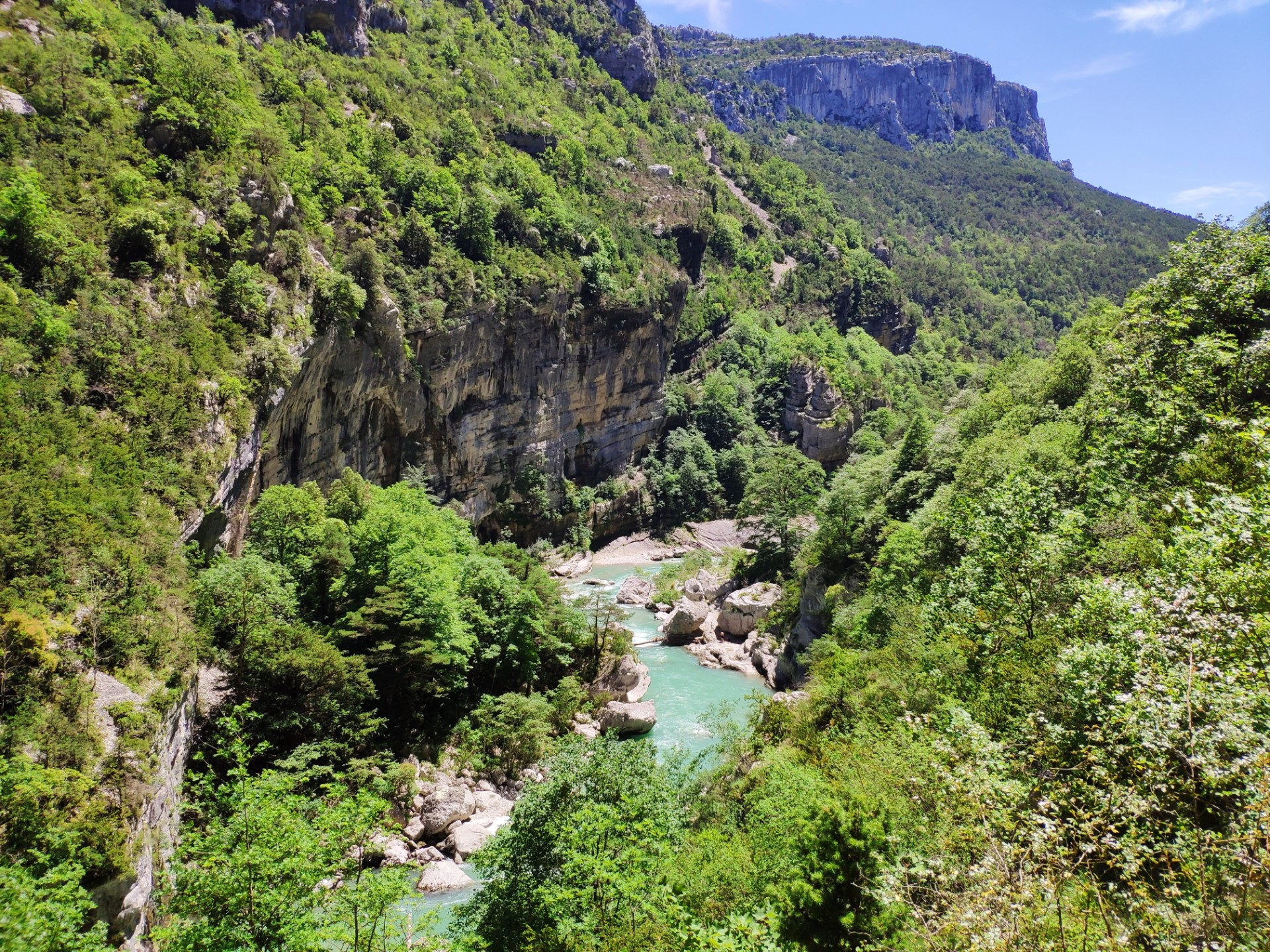 Puis on redescend vers le Lac Sainte Croix, non sans un dernier arrêt face à une autre gorge qui vient se jeter dans le Verdon, d’ici on voit la rivière serpenter au fond de la roche calcaire.