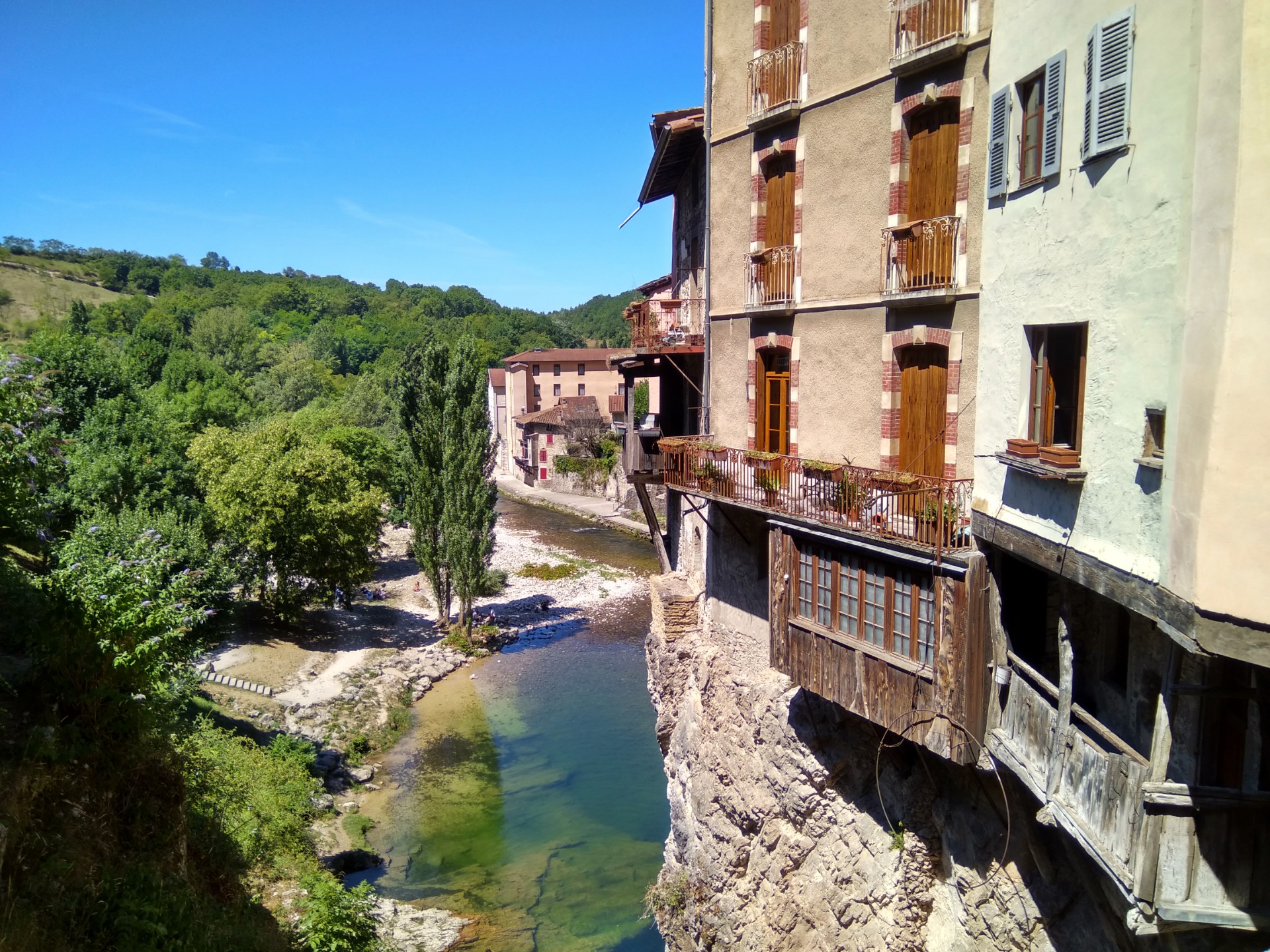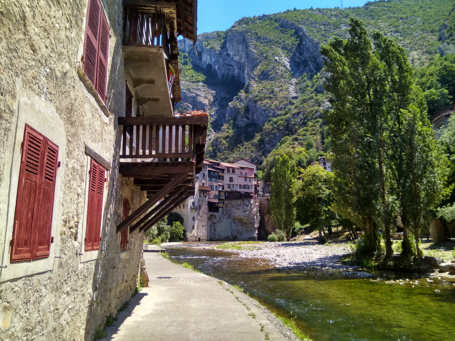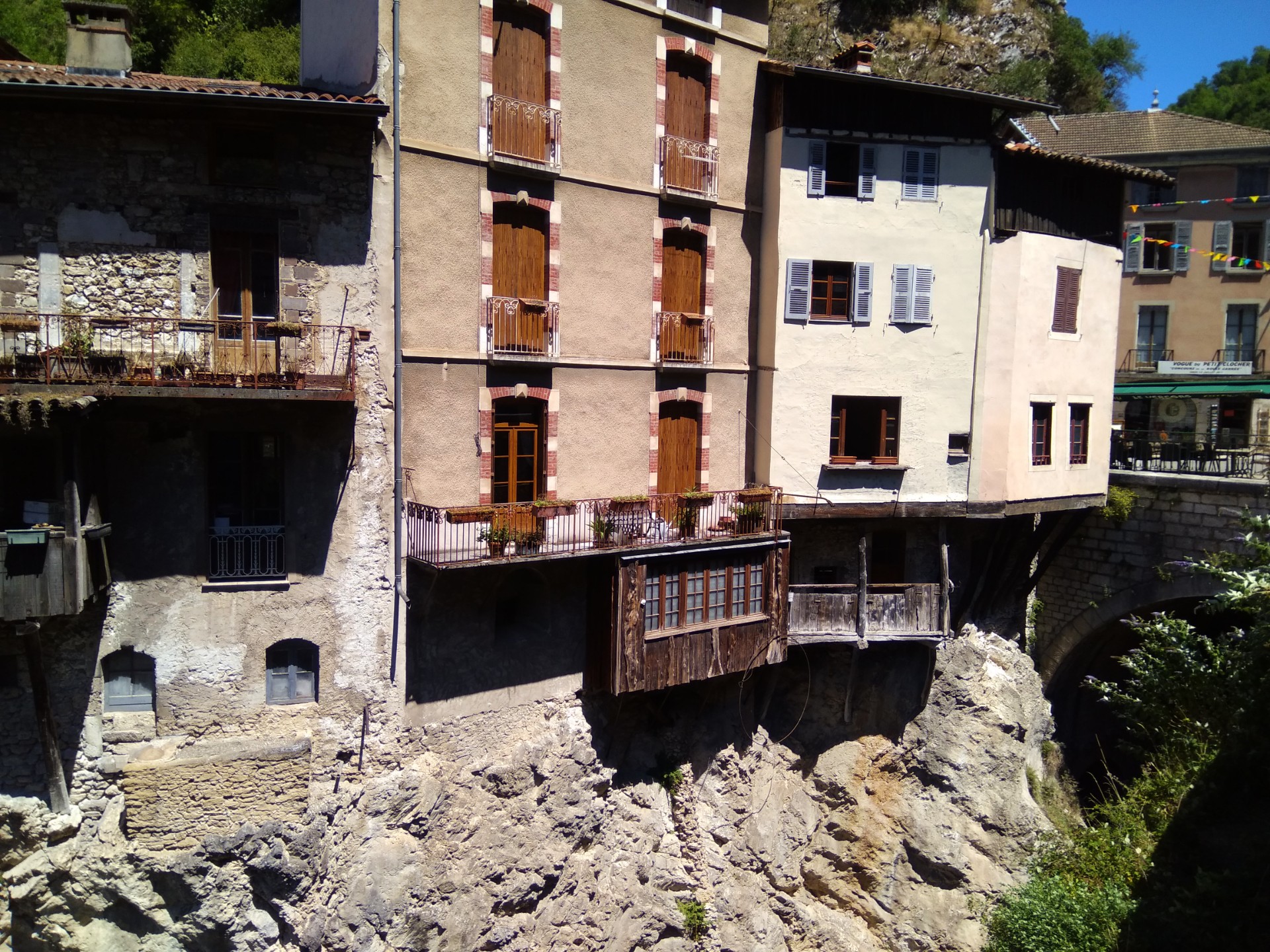 Depuis le pont de Pont en Royan, on enjambe la Bourne et on a une vue panoramique sur les maisons suspendues dont certains balcons semblent littéralement suspendus au-dessus du vide.