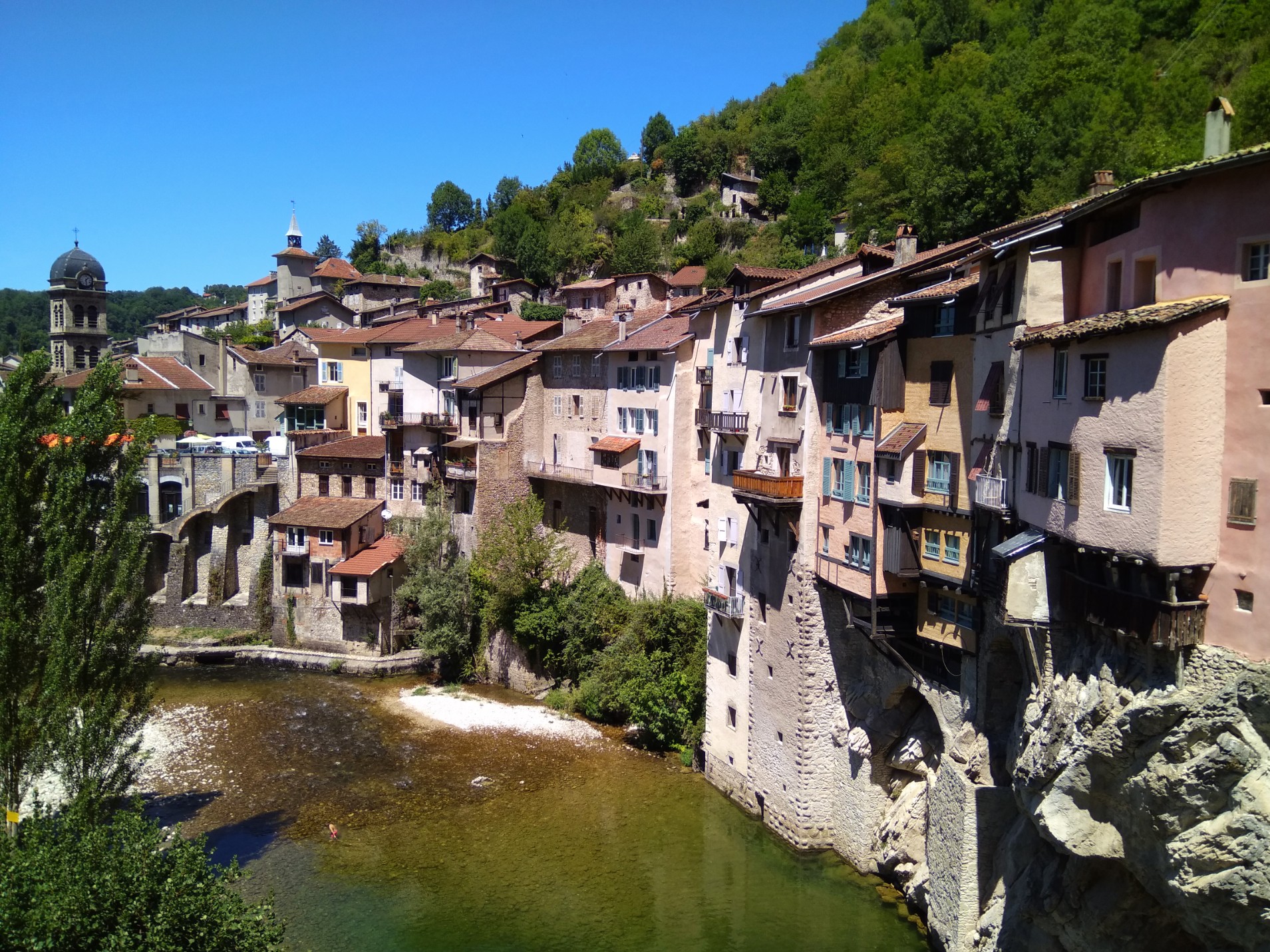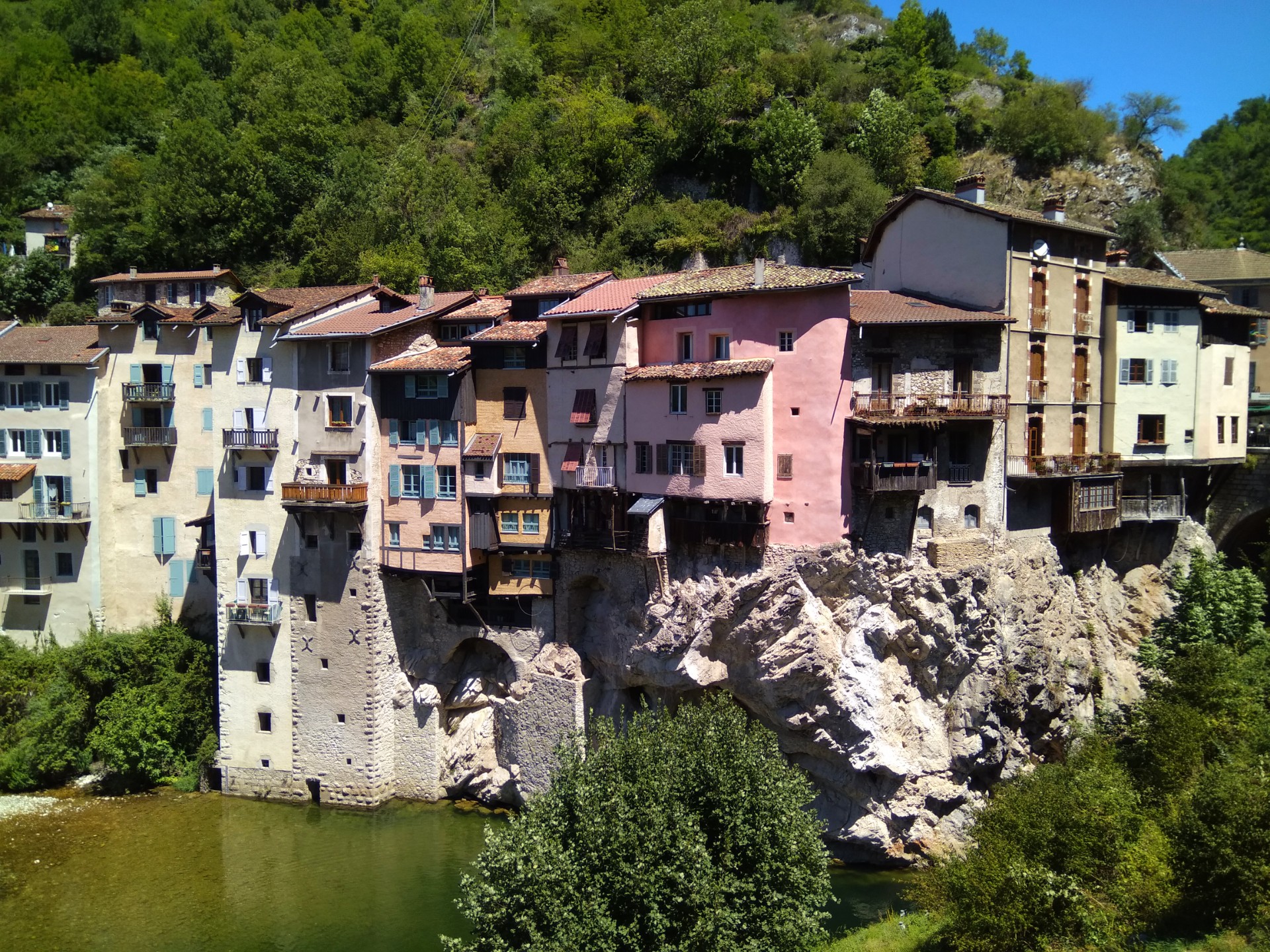 Pont en Royan est une belle étape sur la route du Sud, situé à proximité de Valence et au contreforts du Massif du Vercors. Ce village s’est installé dans un passage étroit traversé par le torrent de la Bourne, et comme son nom l’indique, c’est donc ici qu’avait été construit un pont pour permettre de franchir le cours d’eau. Sa renommée vient de ses charmantes maisons suspendues colorées construite tout en hauteur au-dessus de l’eau.