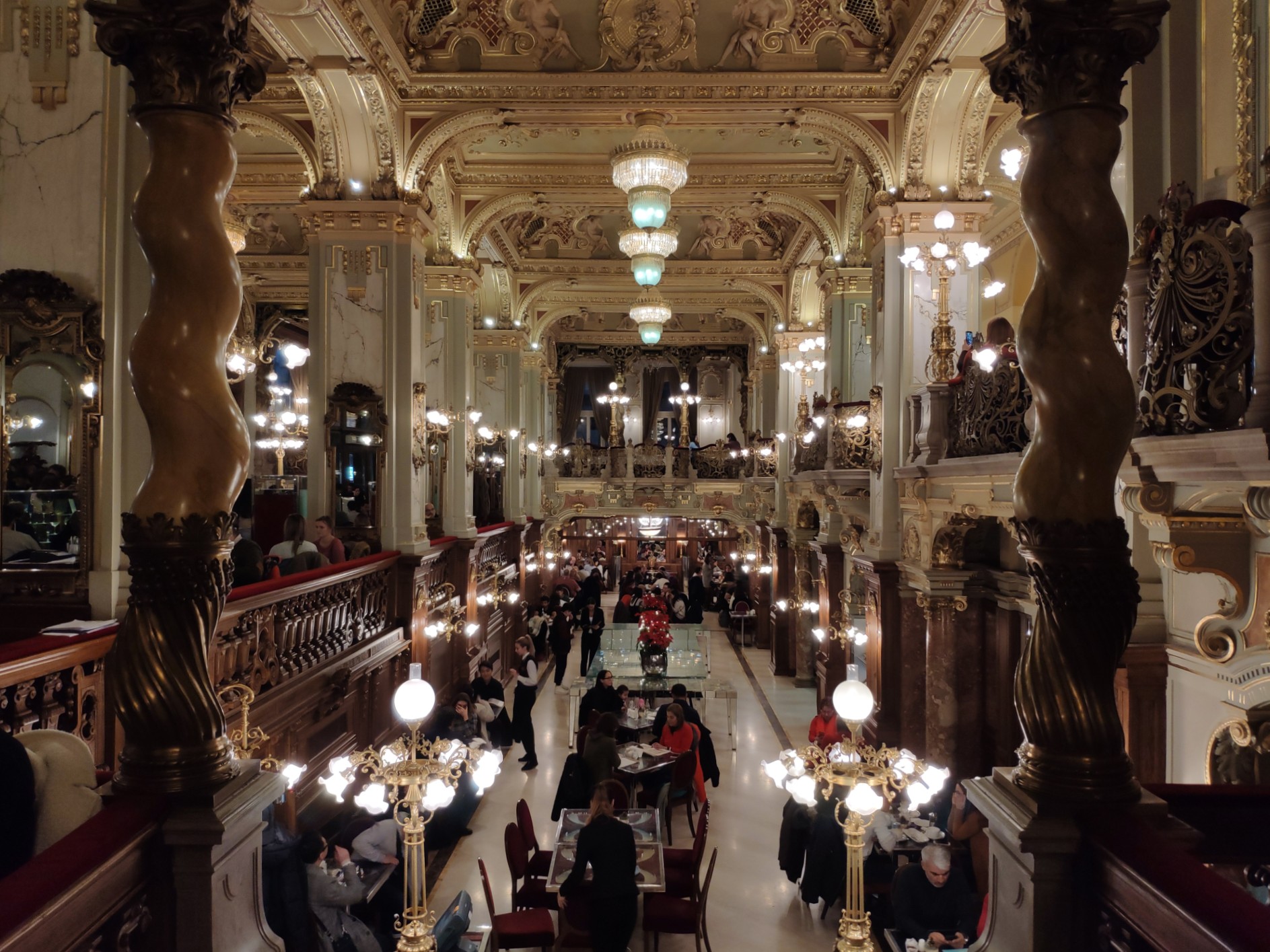Le marché est bondé avant les fêtes de Noel et les touristes comme nous. On arrive à trouver un endroit pour se restaurer rapidement à l’étage. Puis on reprend le tramway jusqu’au célèbre Café New York avec ses pâtisseries, son service et ses dorures d’un autre temps.