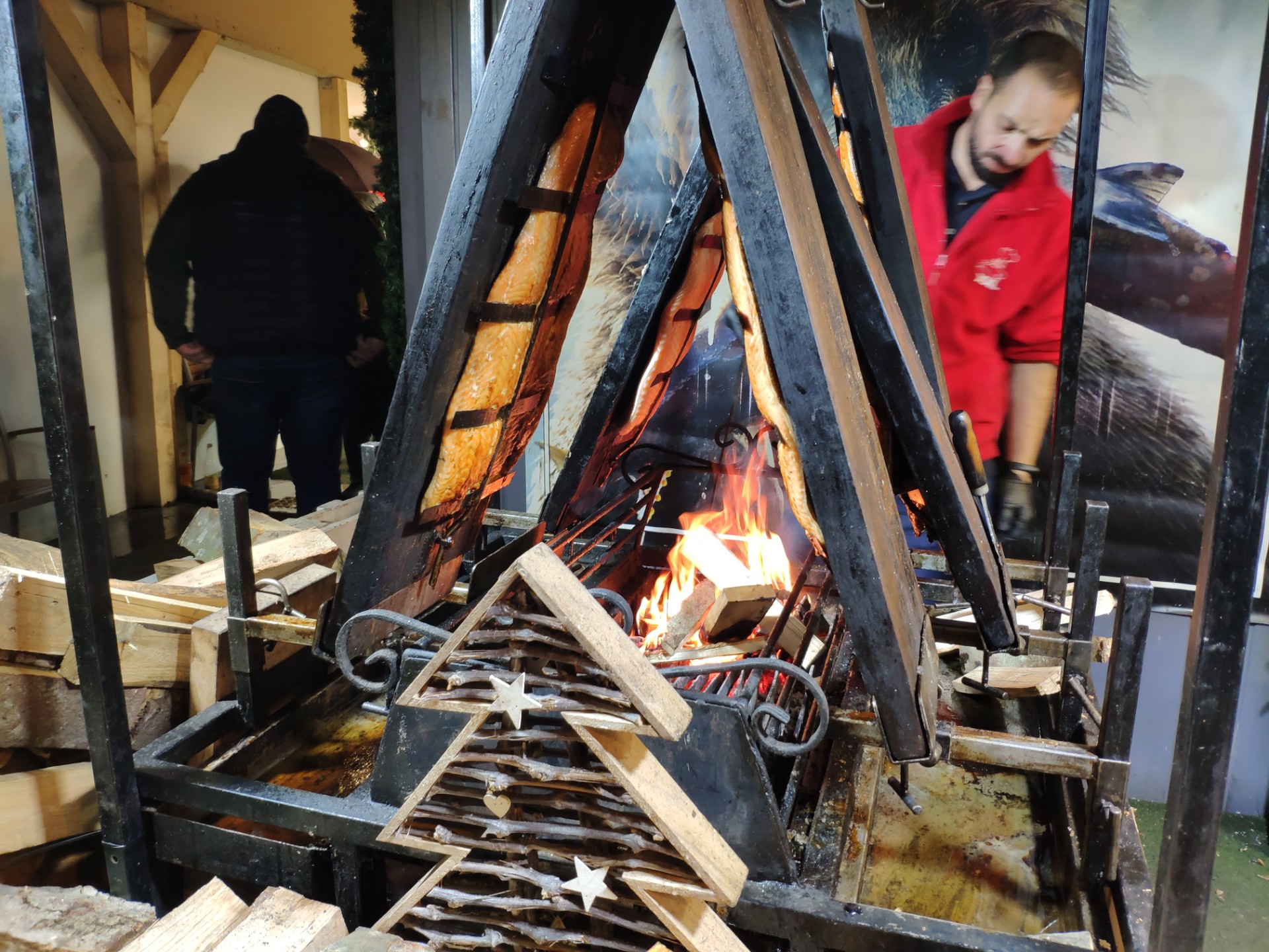 La pluie tombe maintenant fortement, on se rabat vers un marché de Noel, et on emprunte le métro de Budapest que l’on trouve fascinant. Des vieilles stations avec des poteaux en acier, des murs recouverts d’armures en bois, une vieille rame jaune s’arrête. Ce soir, on mange un saumon fumé au de de bois cuit sous nos yeux.
