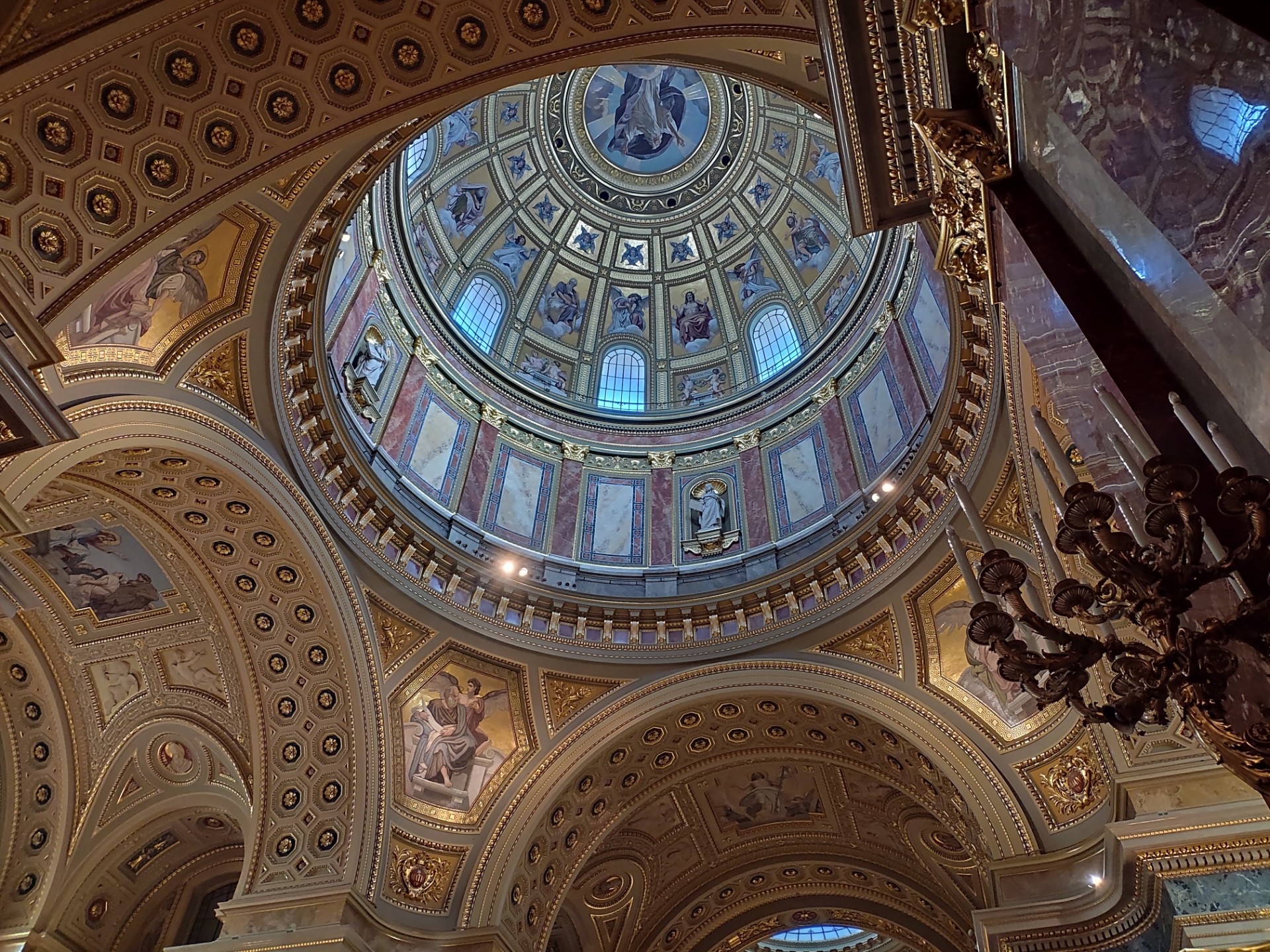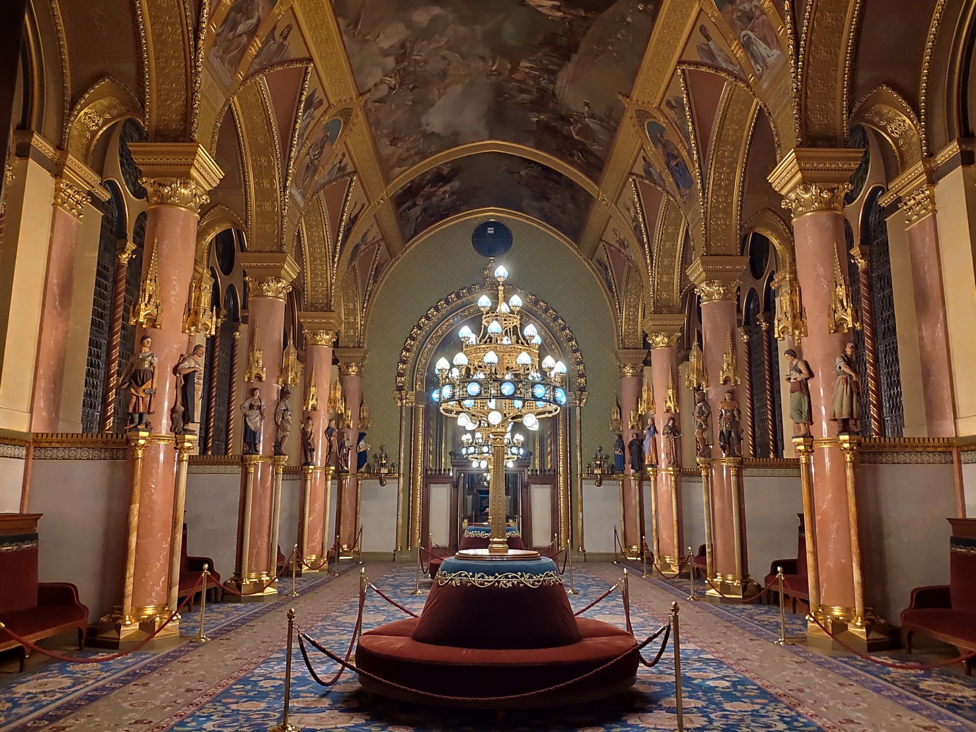 Sous la coupole principale, on nous demande de ranger les appareils photos et téléphones, on y trouve un des symboles de la monarchie hongroise, la couronne de Saint Etienne. La pièce est encore une fois impressionnante dans ses dimensions.
