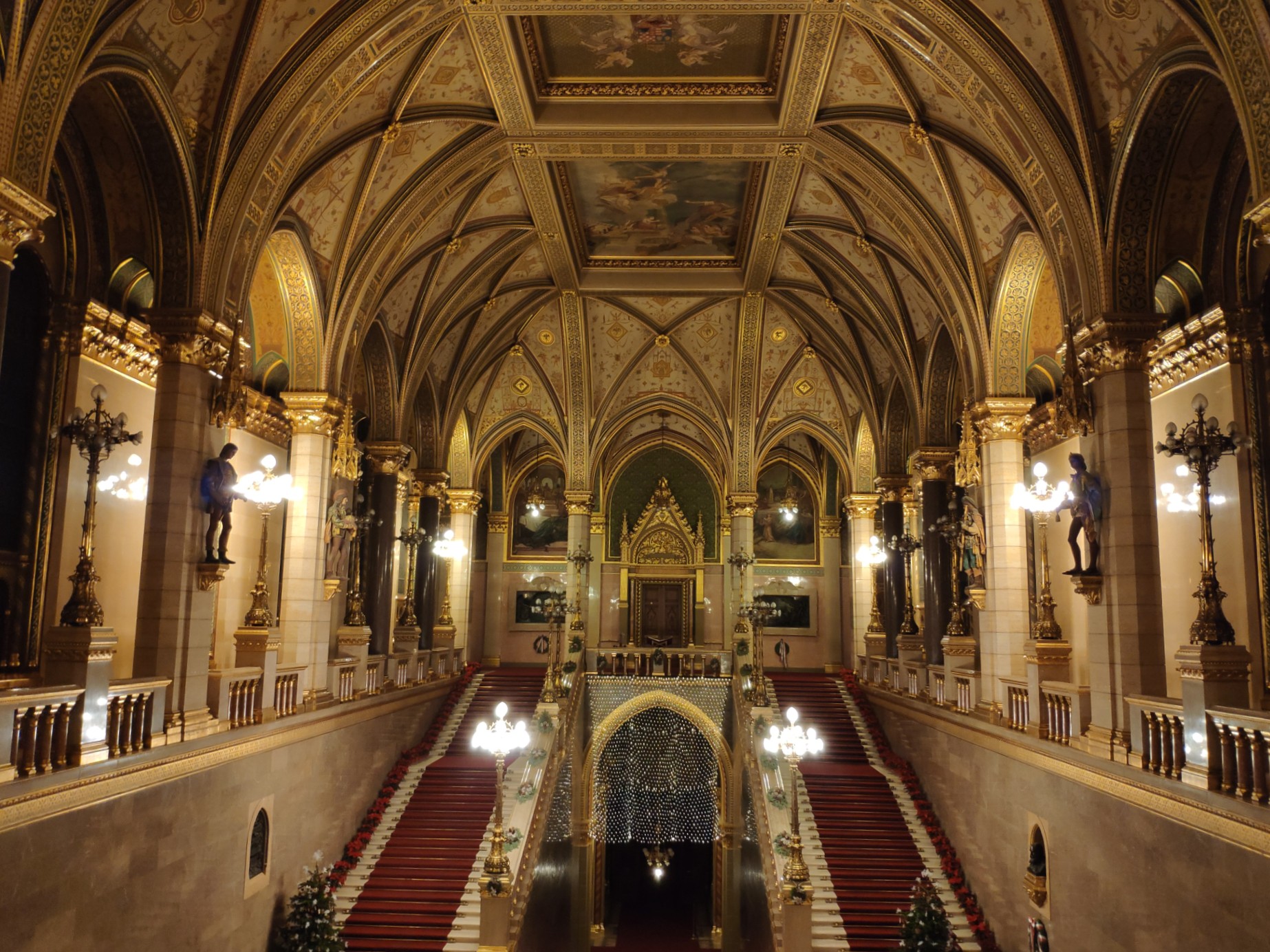 En effet, pour entrer dans le Parlement de Hongrie, il faut intégrer une visite en groupe, pour cela il est indispensable de réserver en avance sur le site internet, car la première fois que l’on est allé se renseigner, il n’y avait plus de places le jour même. Le Parlement est considéré comme un des bâtiments les plus beaux du monde, grandiose à l’extérieur et splendide à l’intérieur. La guide nous conte la richesse des matériaux et de la décoration, entre or, marbre et pierres précieuses. L’escalier monumental qui s’ouvre sur la porte principale amène à une immense pièce pleine de dorures.