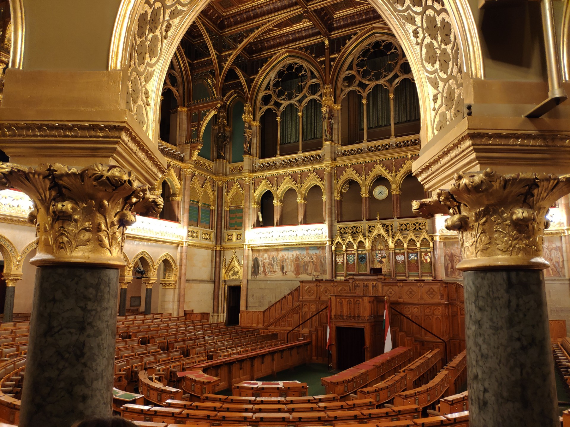 On traverse un large couloir pour se rendre dans la salle où se réunit le parlement hongrois.