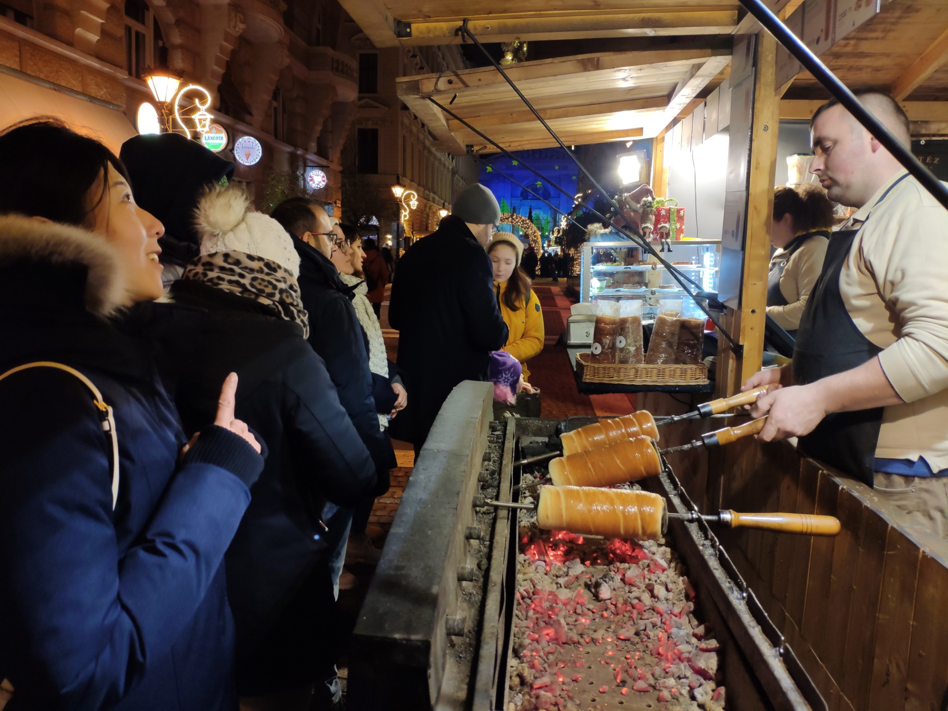 On retourne faire un marché de Noël pour gouter une des spécialités, dont je ne connais pas le nom. C’est un cylindre de pâte sucrée qui est tourné au-dessus d’un brasier, c’est très bon, et suffisamment calorique pour nous donner des forces pour continuer la promenade jusqu’à l’endroit que l’on avait repéré pour diner.
