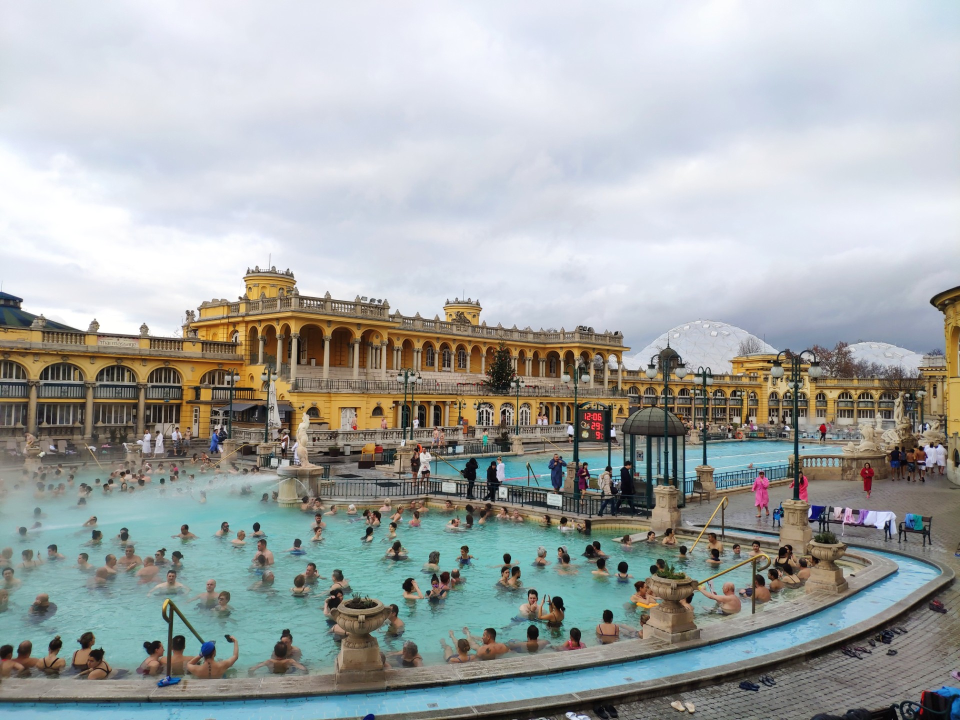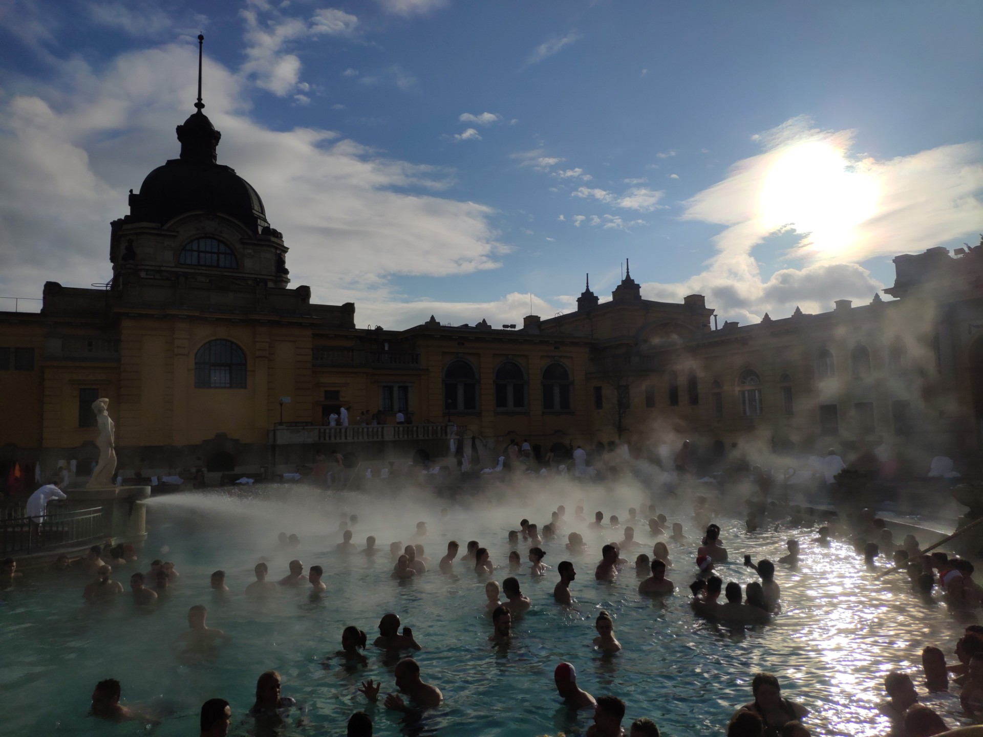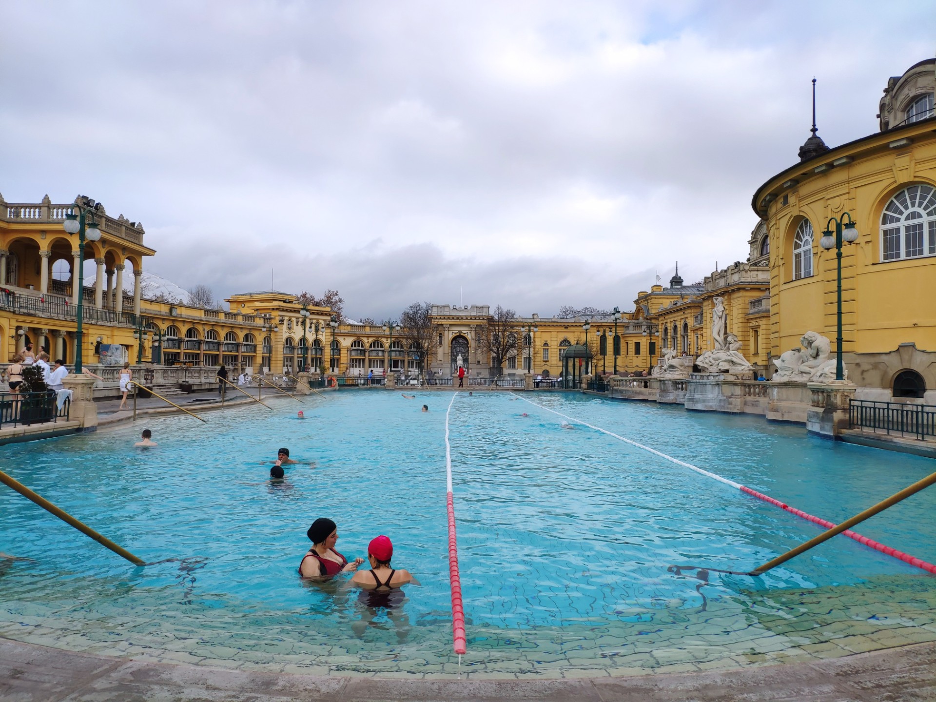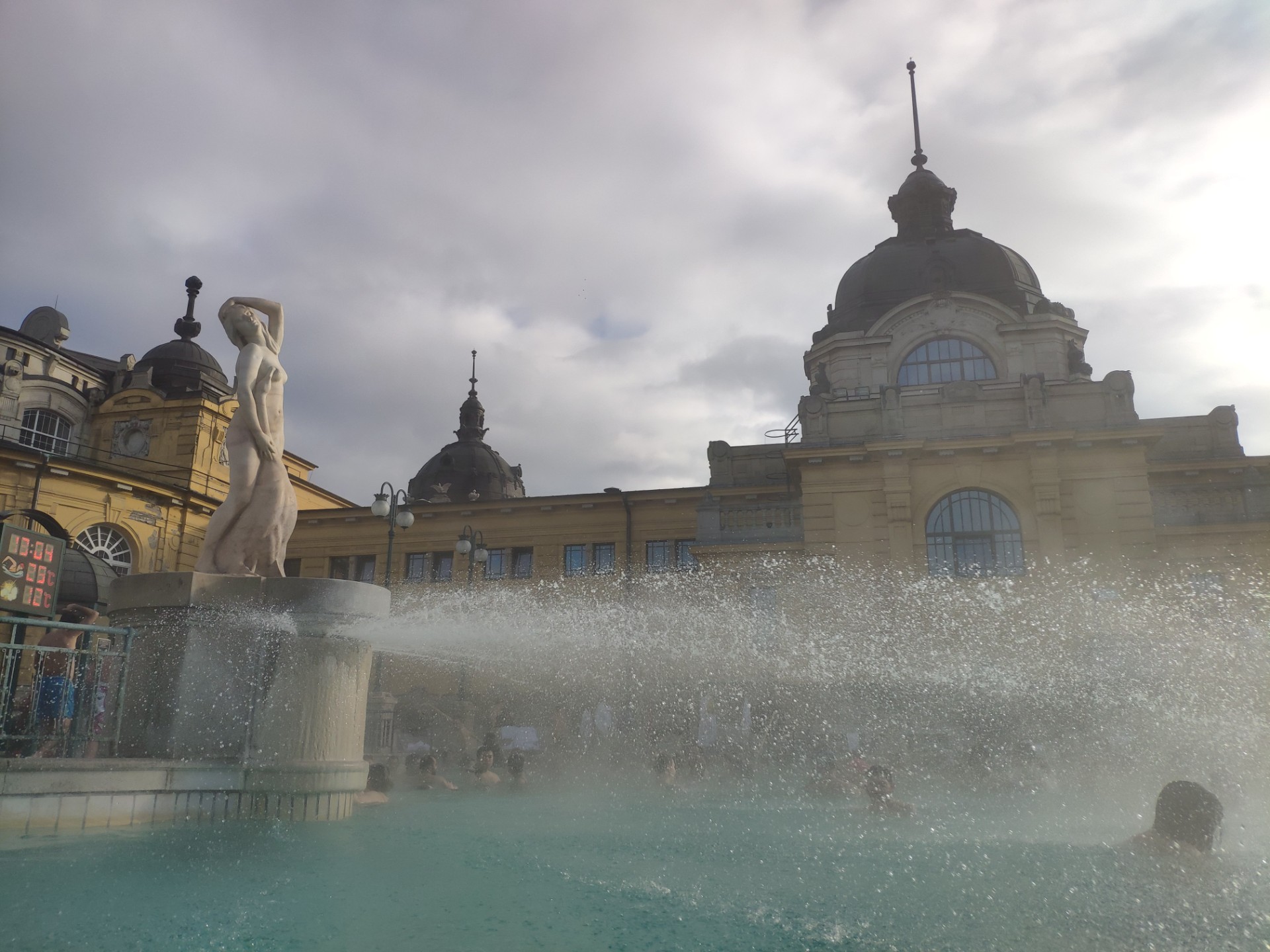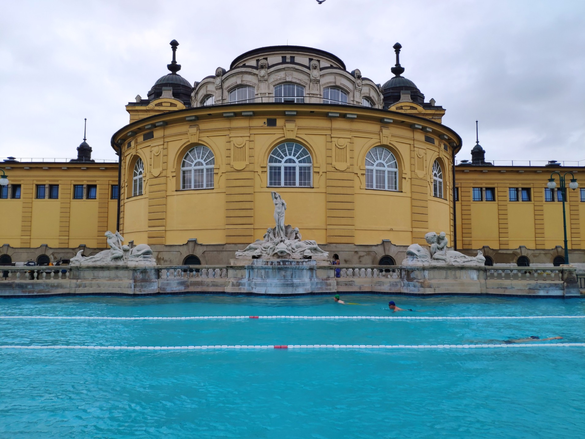 Notre matinée à Budapest, on se lève tôt pour se rendre dans les fameux Thermes Széchenyi. On range nos affaires et faisons le check-out, on prend nos valises avec nous dans l’espoir d’avoir un endroit où les poser aux thermes. Ce matin, il y a un monde fou, on fait la queue au moins une heure avant de pouvoir enfin arriver au guichet. Comme nous voulons ranger nos valises, il faut choisir un vestiaire cabine, qui se ferme à clé, c’est vraiment bien organisé et pratique. Les bains sont vraiment magnifiques avec une grande piscine chauffée et des bassins qui fument au-dessus de statues et de bâtiments peints en jaune.