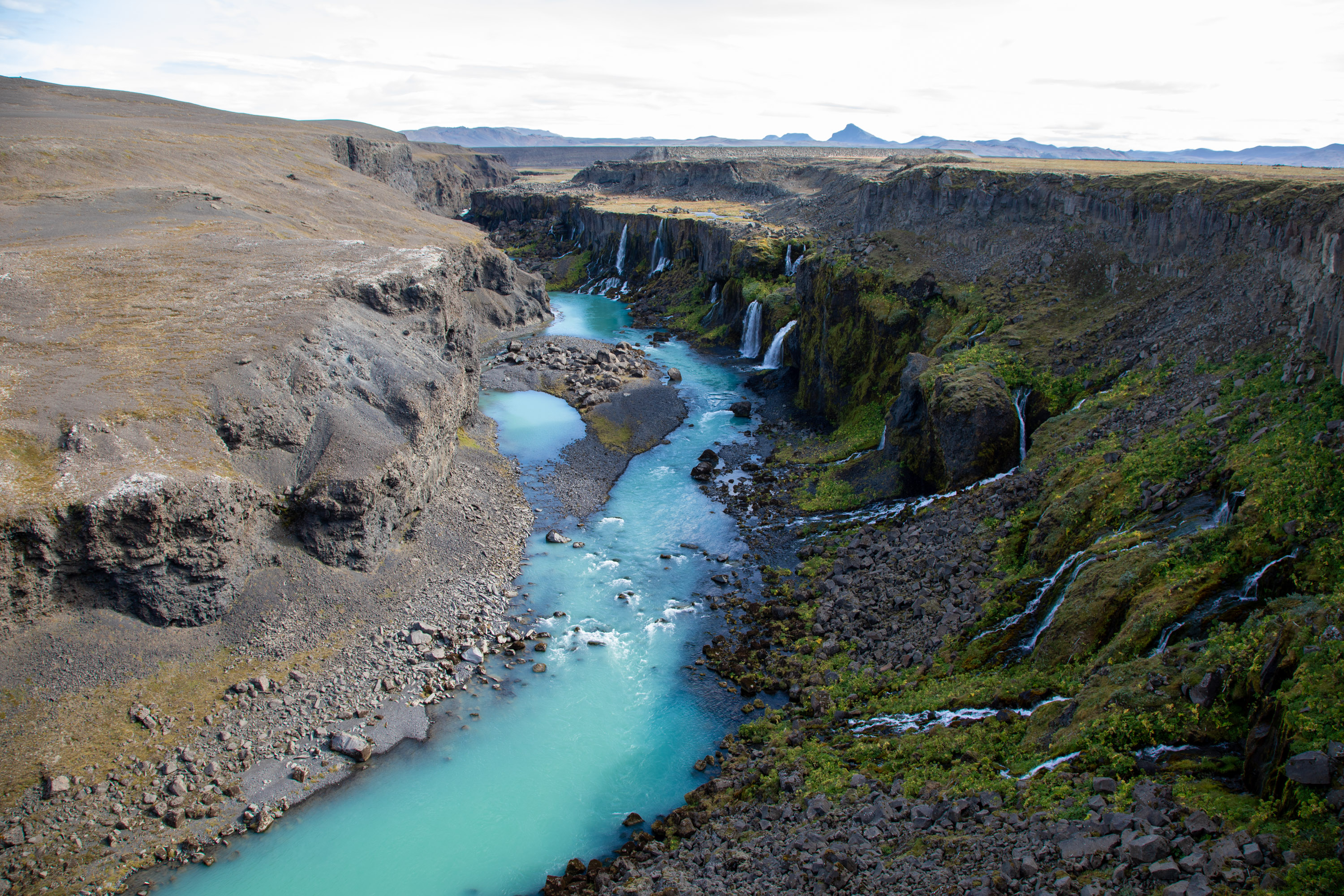 La route est très facile jusqu’à une retenue d’eau puis le bitume laisse la place à une route en cailloux. Il faut rouler avec précaution mais ça passe largement mieux que l’on imaginait. On toune en direction du Canyon de Sigöldugljúfur où de nombreuses cascades coulent et le cours d’eau de jolies couleurs bleues turquoises. Magnifique endroit à une centaine de mètres de la F road pour le Landmannalaugar. Par contre les centaines de mètres se font sur des cailloux et il faut aimer être bien secoué. On peut aussi s’arrêter un petit parking et marcher, mais on ne l’a vu qu’en repartant.