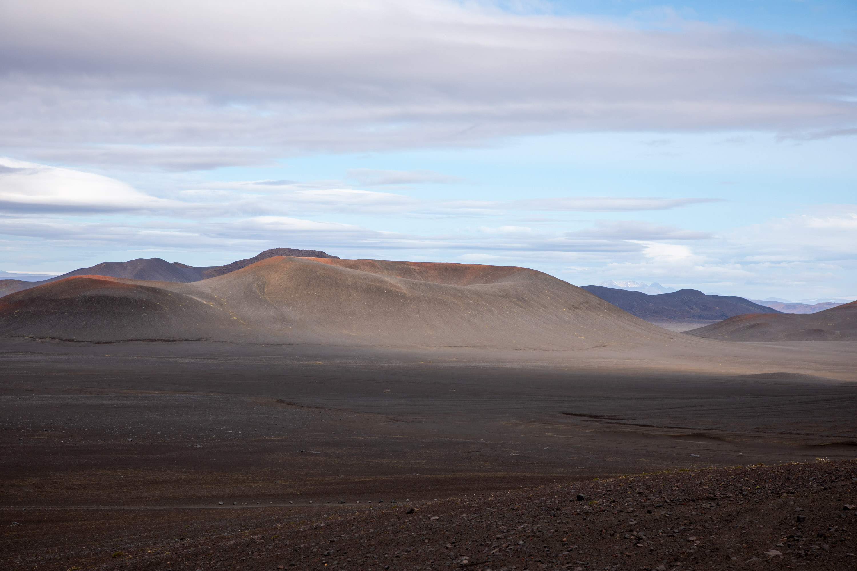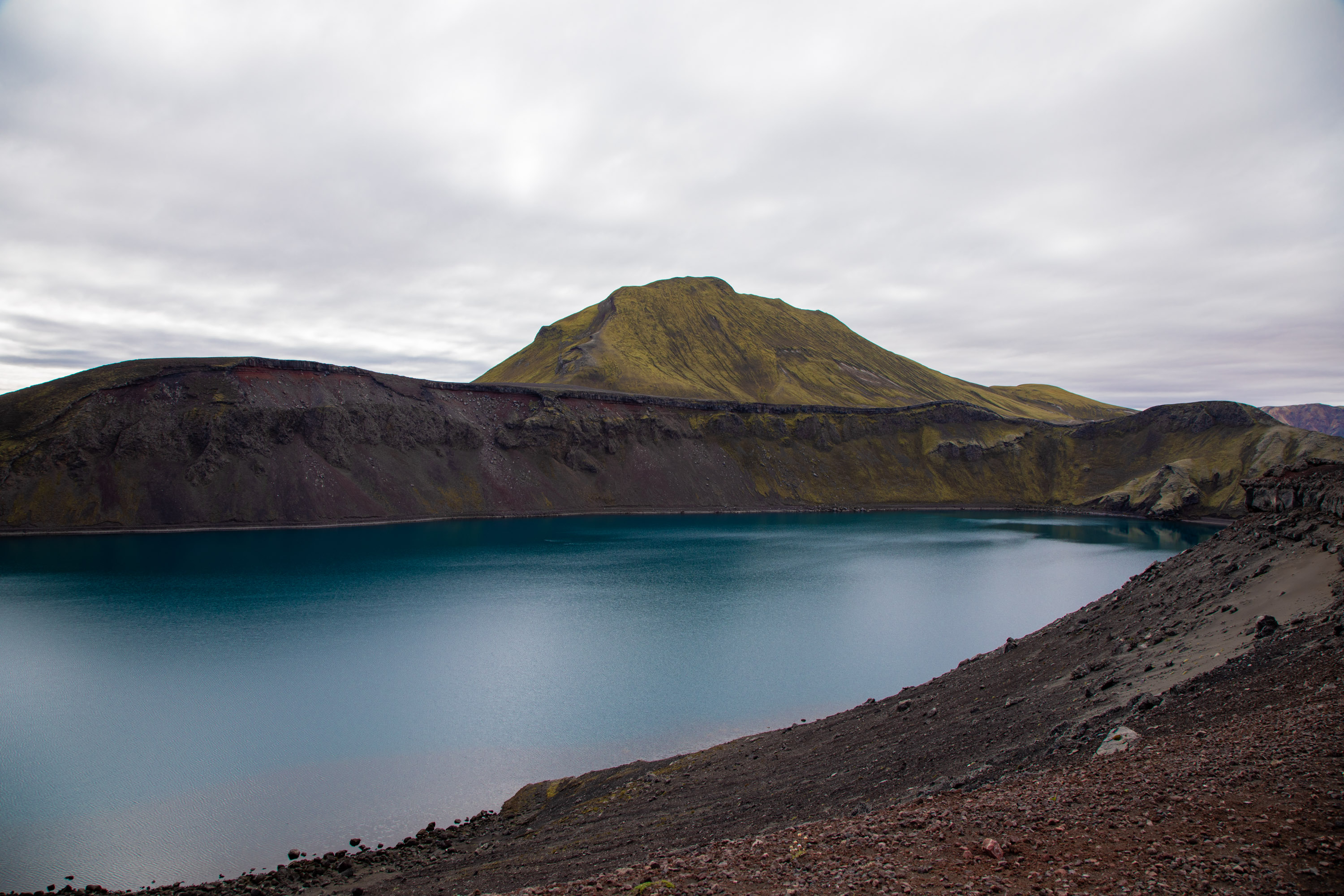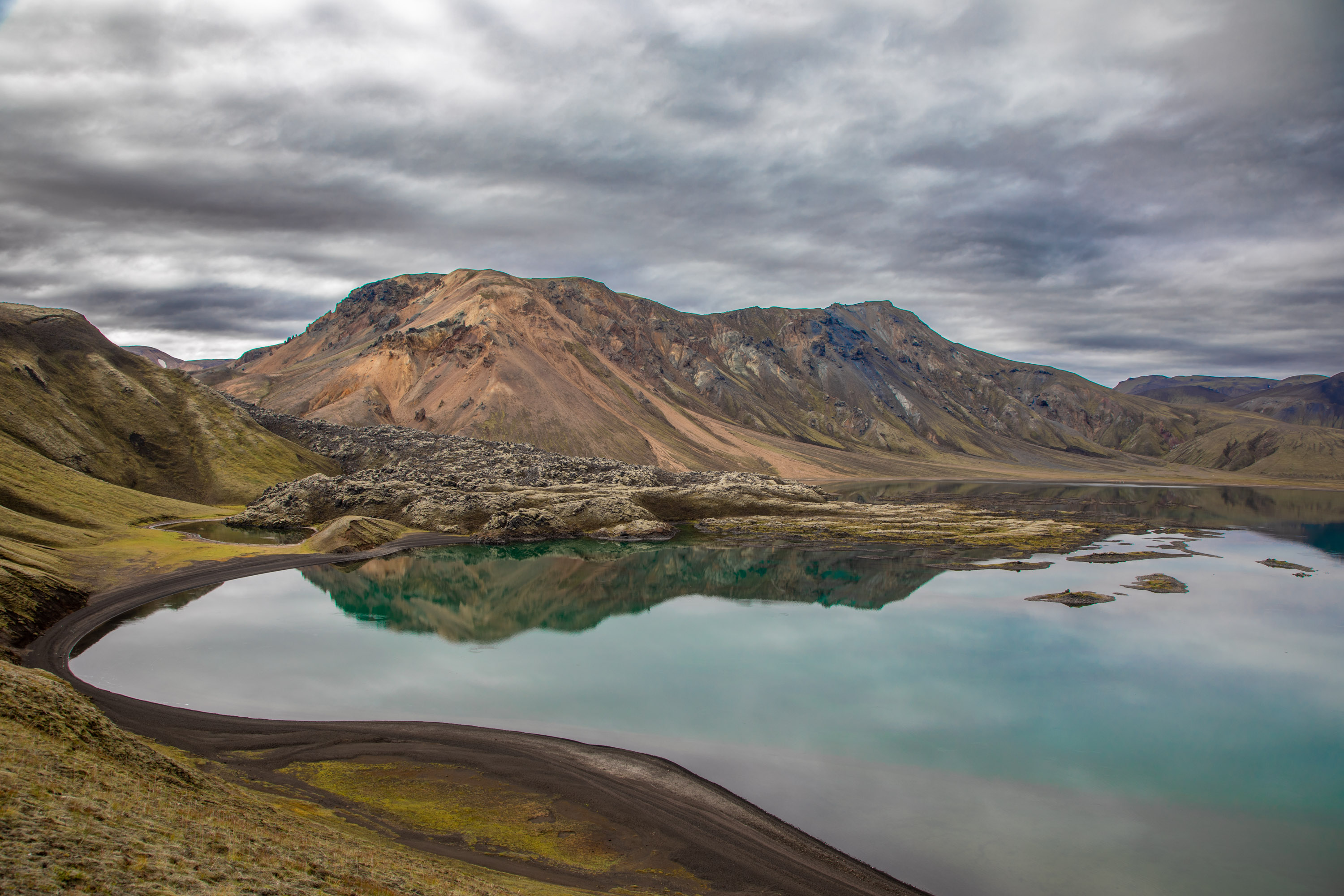 Ici il y a des volcans éteints, de la mousse a repoussé à certains endroits, ce qui donne un contraste de couleurs saisissant. Certains cratères sont maintenant devenus des lacs avec une eau très bleue, malgré les nuages sombres qui ajoutent à l’ambiance sombre de ces paysages. Le Cratère de Bláhylur fait une pause idéale car on est en hauteur et on domine le paysage vide, mis à part cette piste qui traverse au milieu du sable volcanique noir.