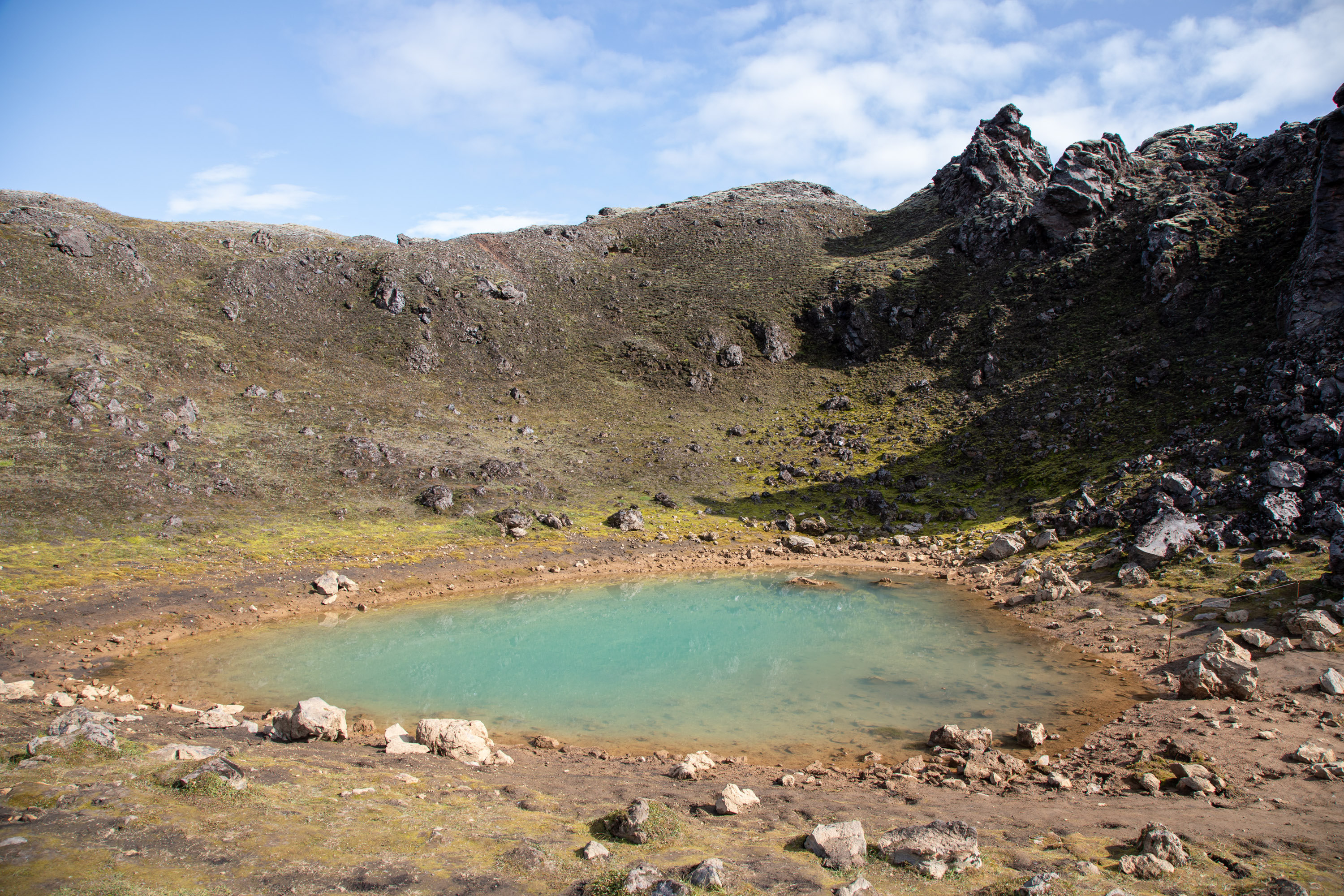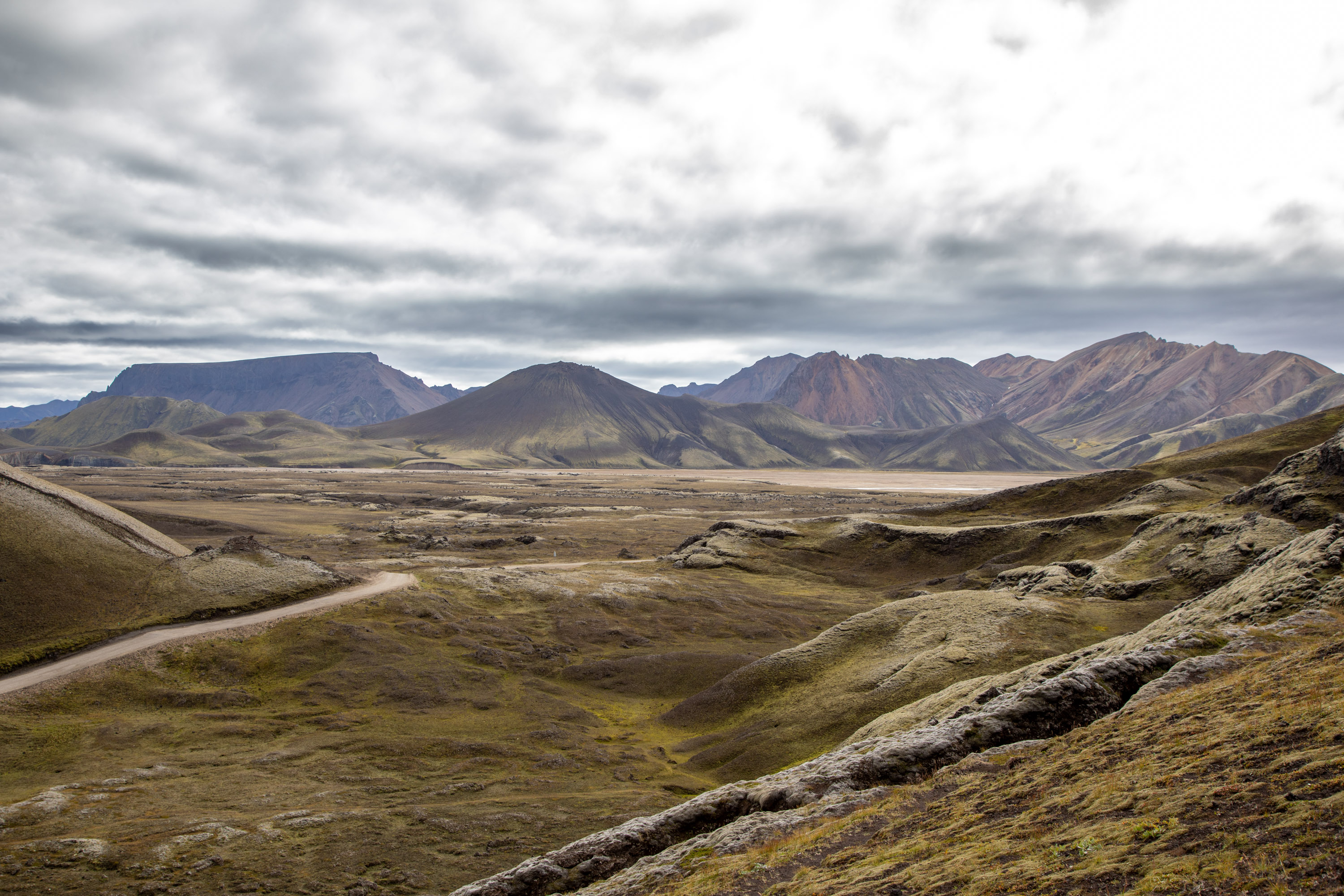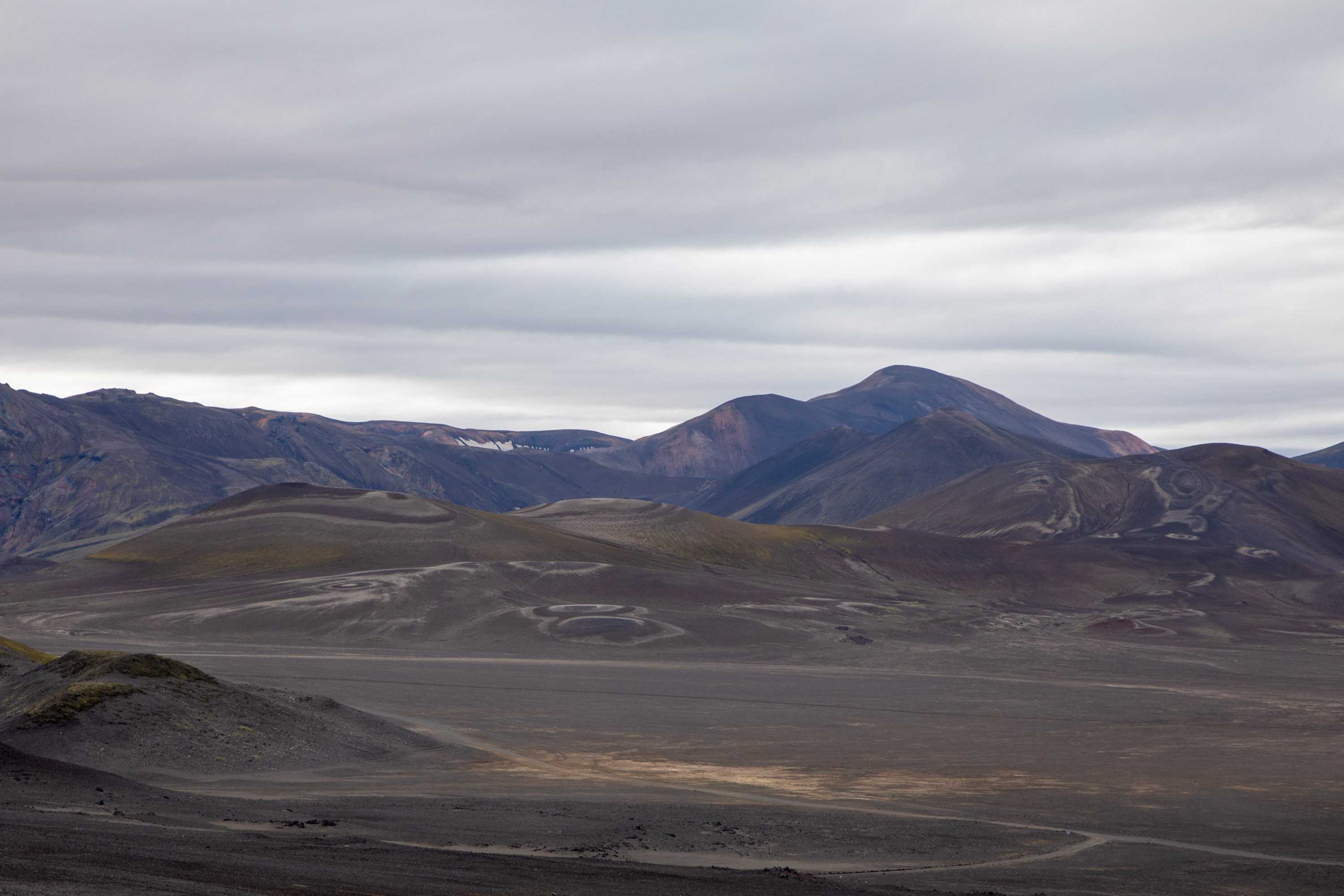 Ici il y a des volcans éteints, de la mousse a repoussé à certains endroits, ce qui donne un contraste de couleurs saisissant. Certains cratères sont maintenant devenus des lacs avec une eau très bleue, malgré les nuages sombres qui ajoutent à l’ambiance sombre de ces paysages. Le Cratère de Bláhylur fait une pause idéale car on est en hauteur et on domine le paysage vide, mis à part cette piste qui traverse au milieu du sable volcanique noir.