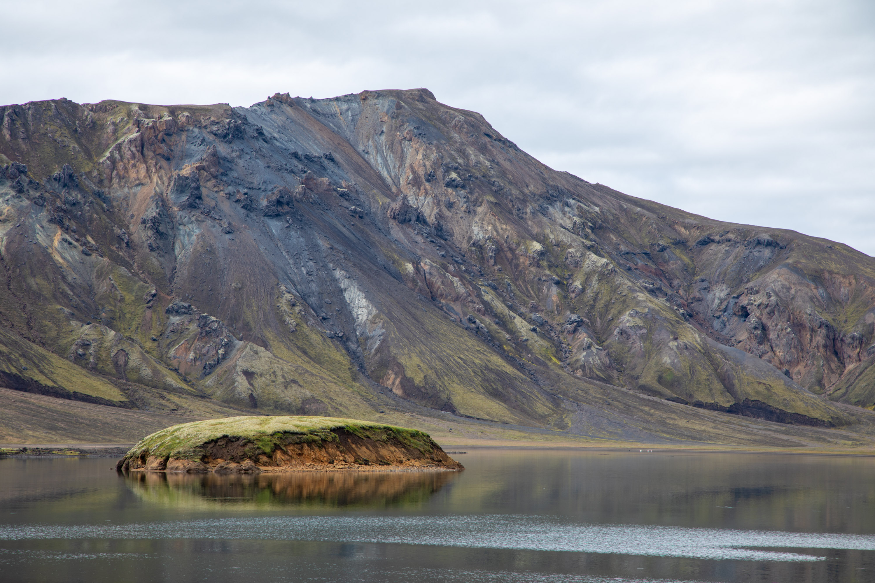 On arrive à un point de vue au-dessous de la vallée volcanique. On domine une vue avec un lac qui reflète les couleurs vraiment bizarres de la montagne. Le Lac de Frostastadavatn se trouve de l’autre côté du Landmannalaugar, c’est superbe.