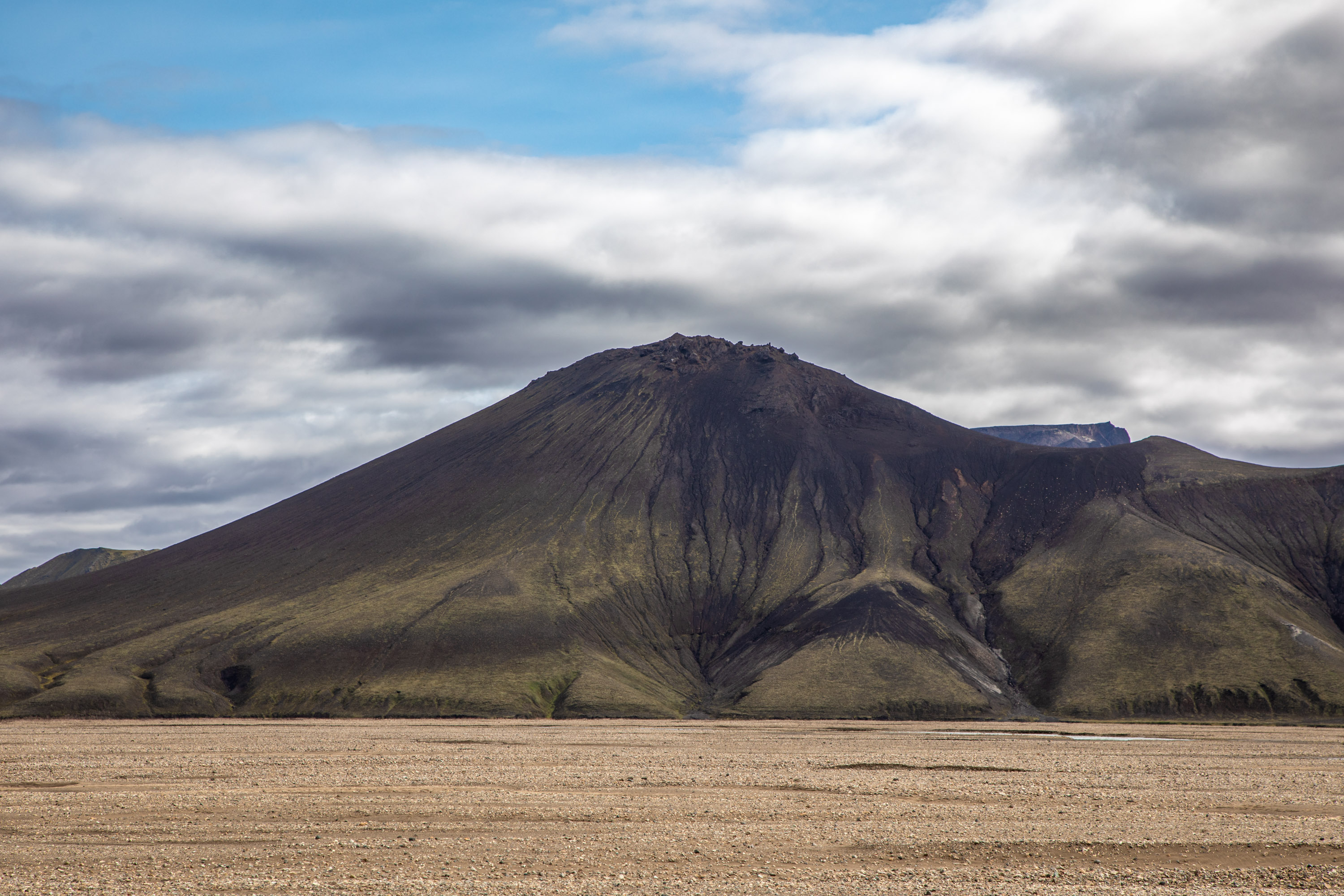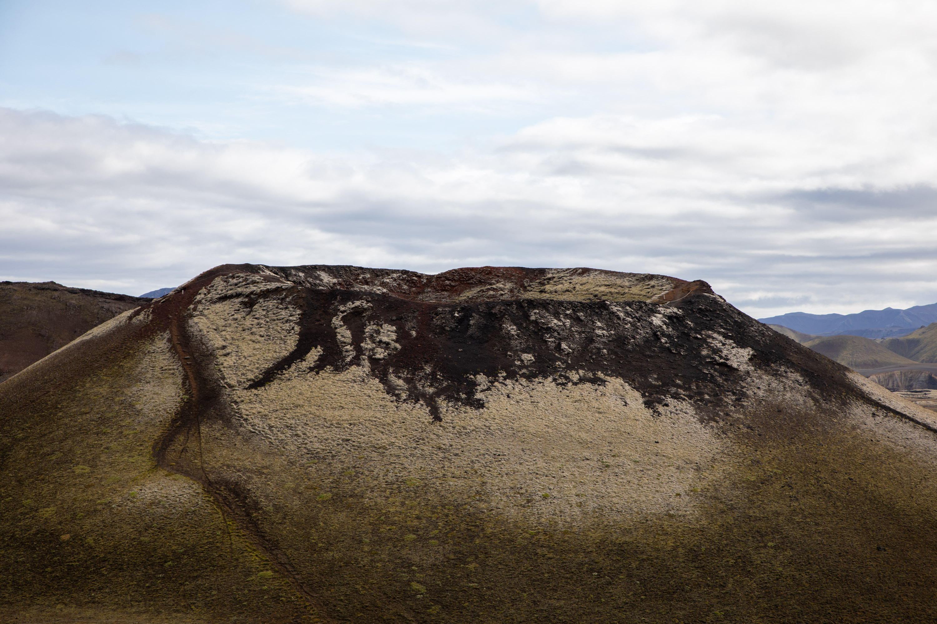 De l’autre côté ce sont des volcans recouverts de mousse. La piste traverse ce paysage extraordinaire et serpente au milieu des cônes. Le Cratère de Stútur a vraiment une forme particulièrement parfaite, avec le haut de son cône d’une couleur noire et ses pentes vertes recouvertes de mousse.