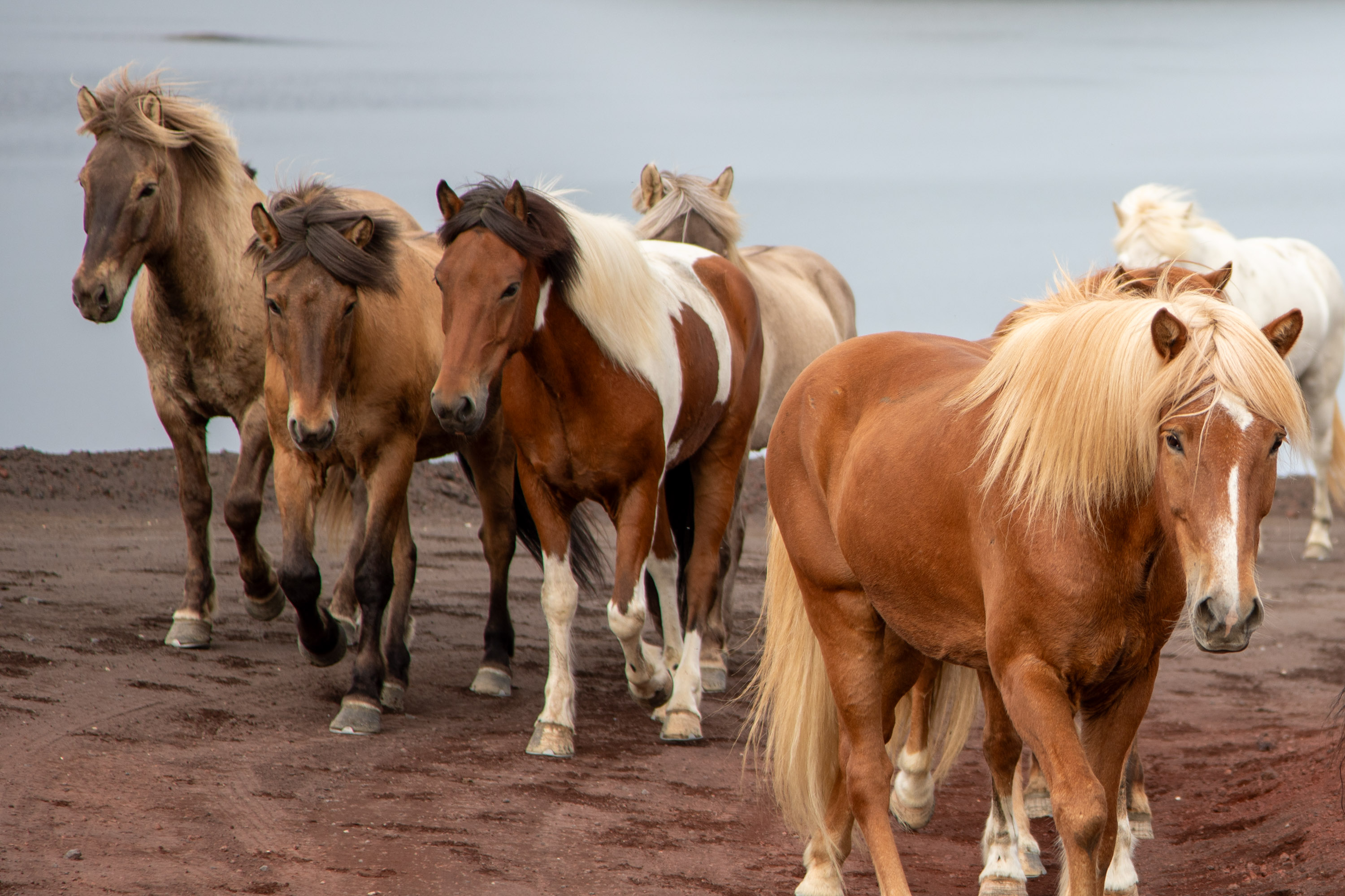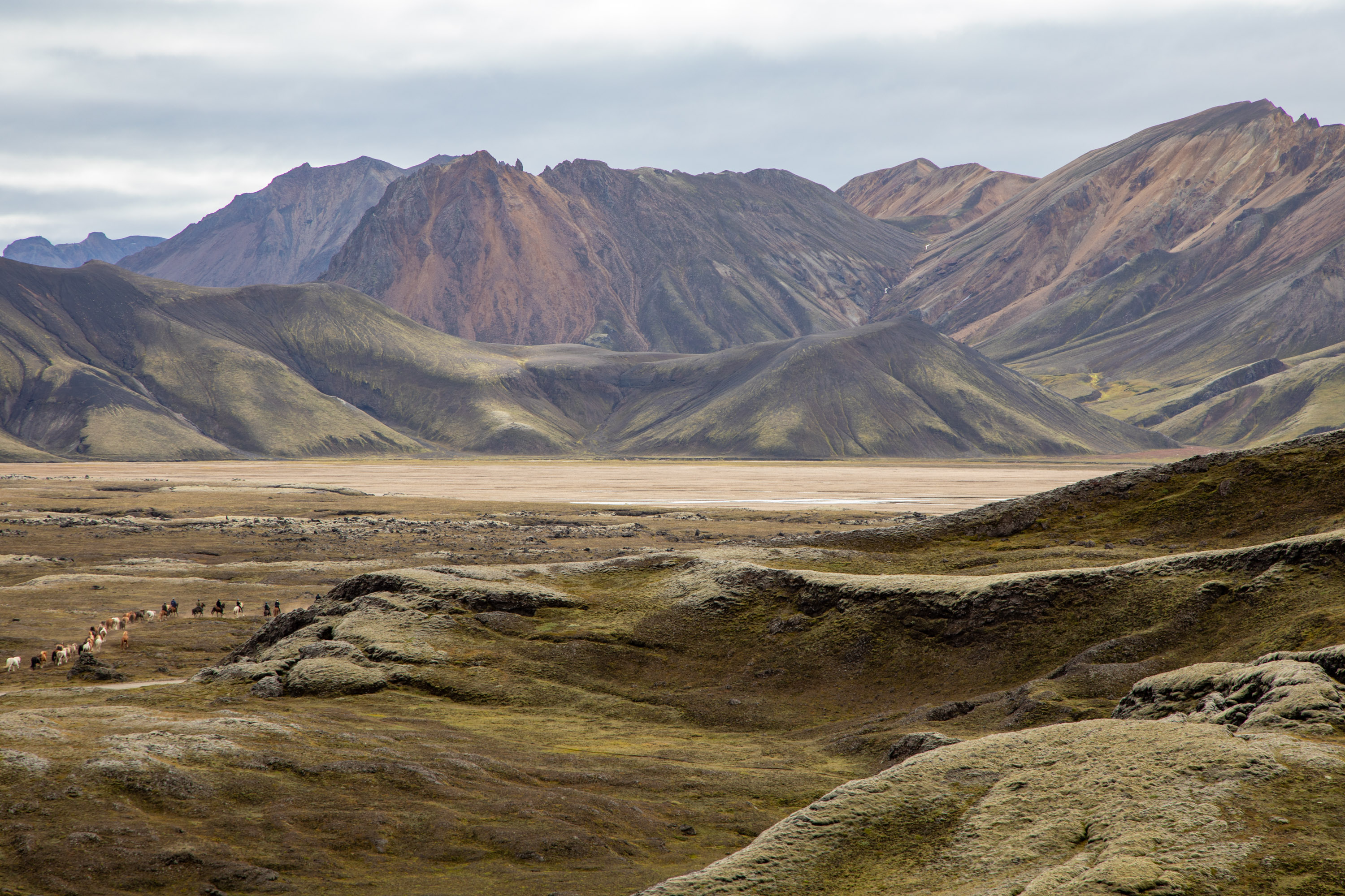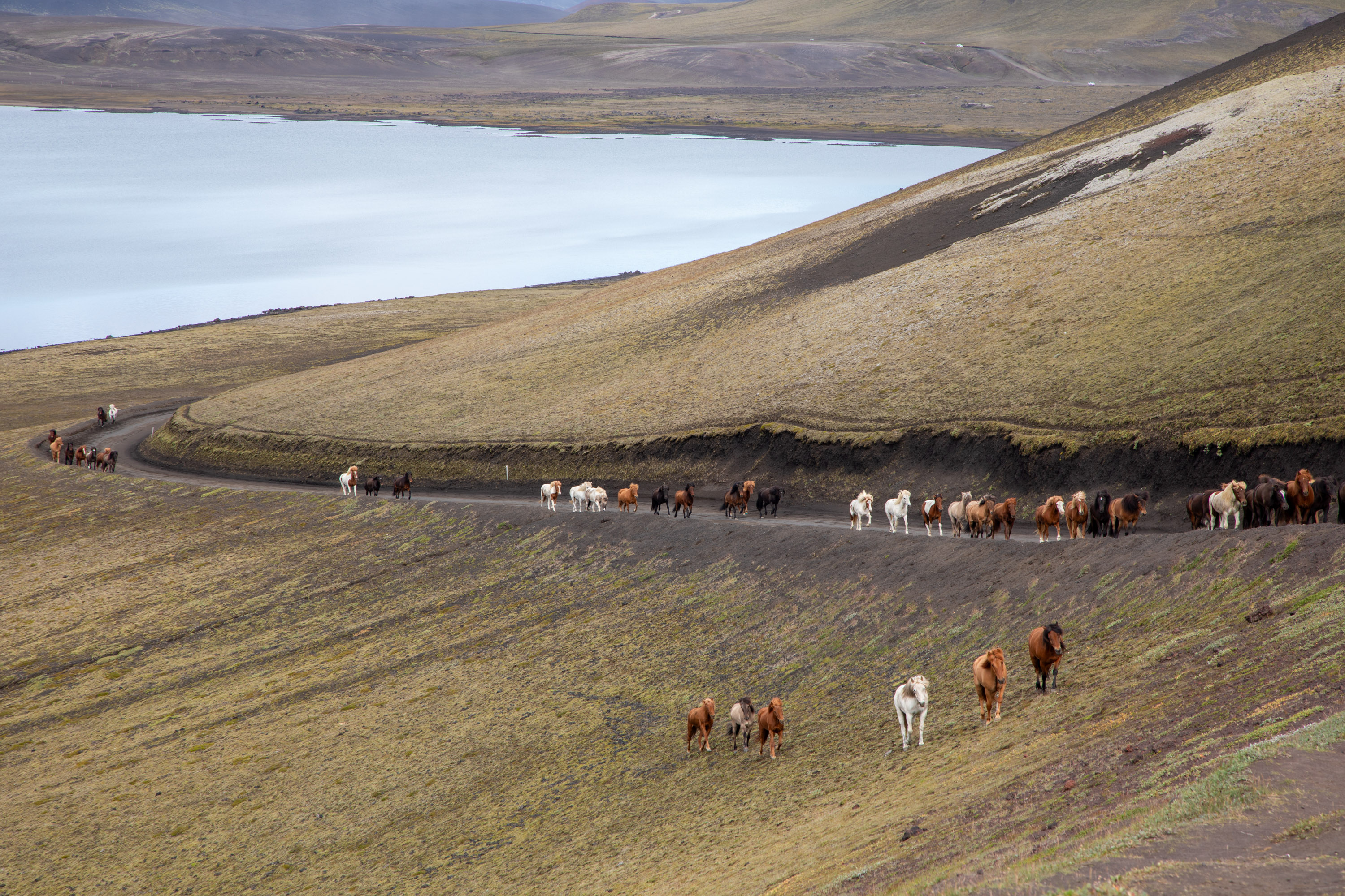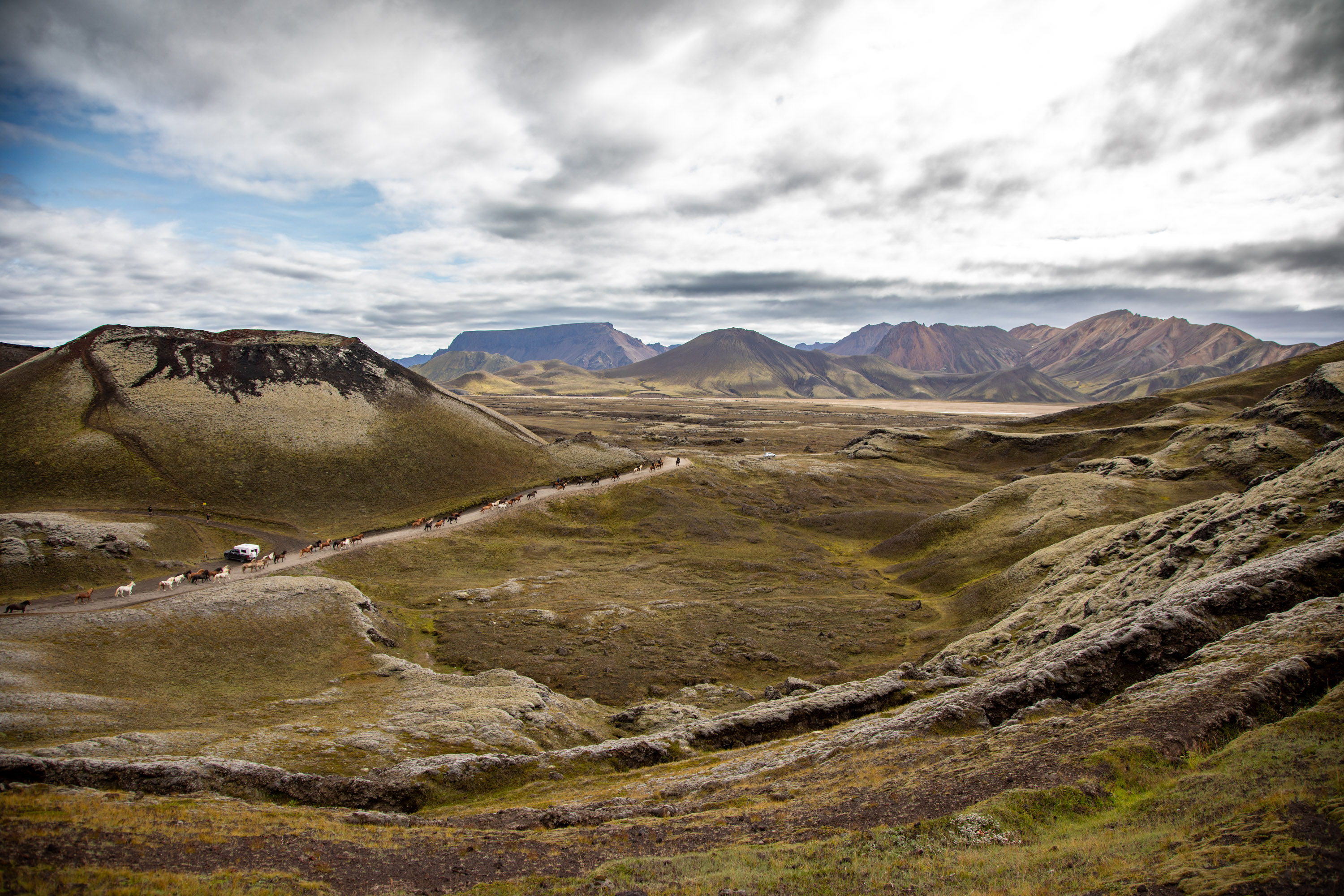 On laisse passer les chevaux et on remonte dans la voiture, on est la première voiture qui les suit. On leur laisse de l’espace car ils courent autour de la piste et les cavaliers leur laisse une certaine liberté. On a la chance de suivre la horde de chevaux jusqu’au Landmannalaugar, à un moment donné ils se trouvent à côté de la voiture et galopent dans la nature. Un moment vraiment unique. La route est partout où l'on regarde d'une beauté brute.
