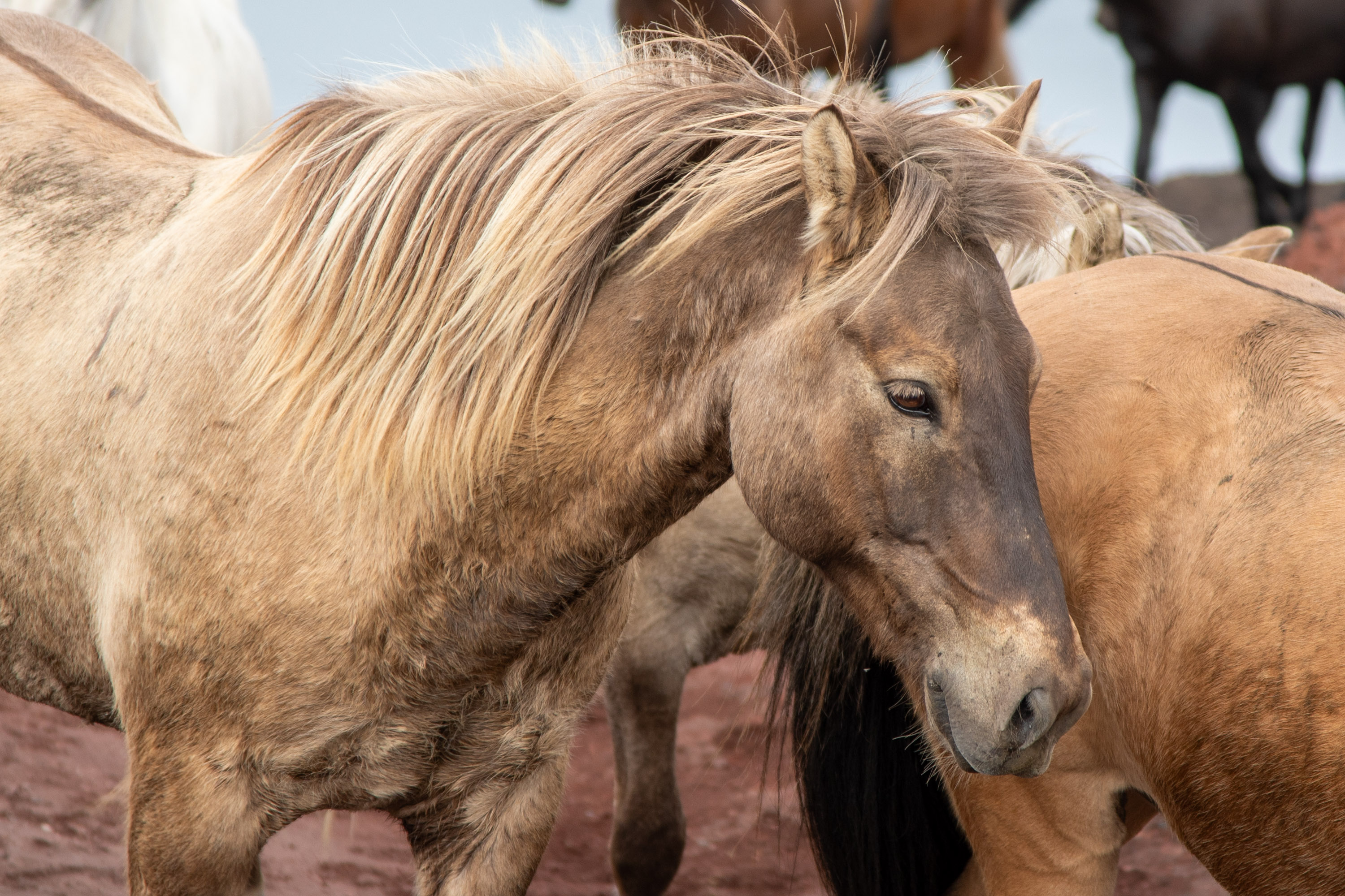 Un moment magique se déroule à présent sous nos yeux. Une horde de cavaliers accompagne une centaine de chevaux sur la piste. Ils sont très nombreux et on peut assister à leur cavale dans ce décor incroyable, c’est vraiment un moment fort de notre voyage.