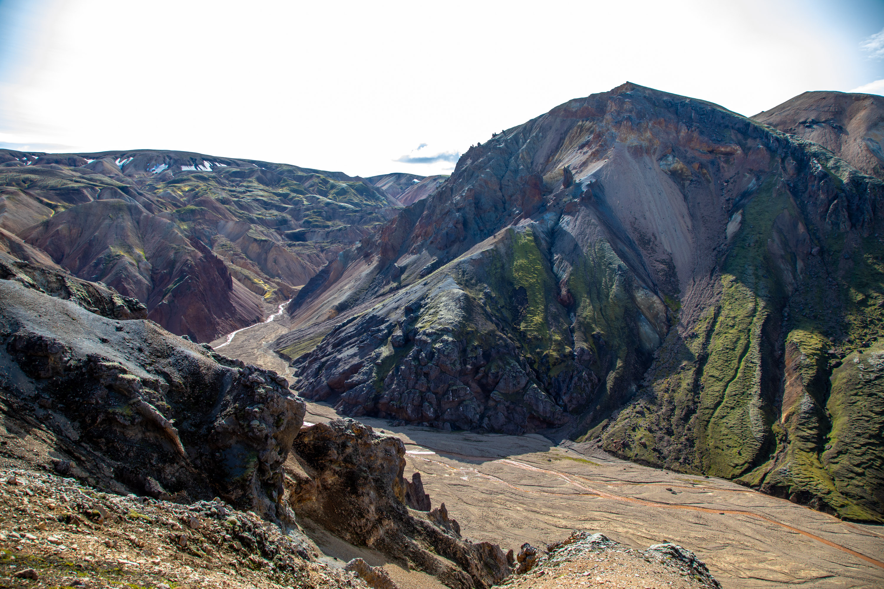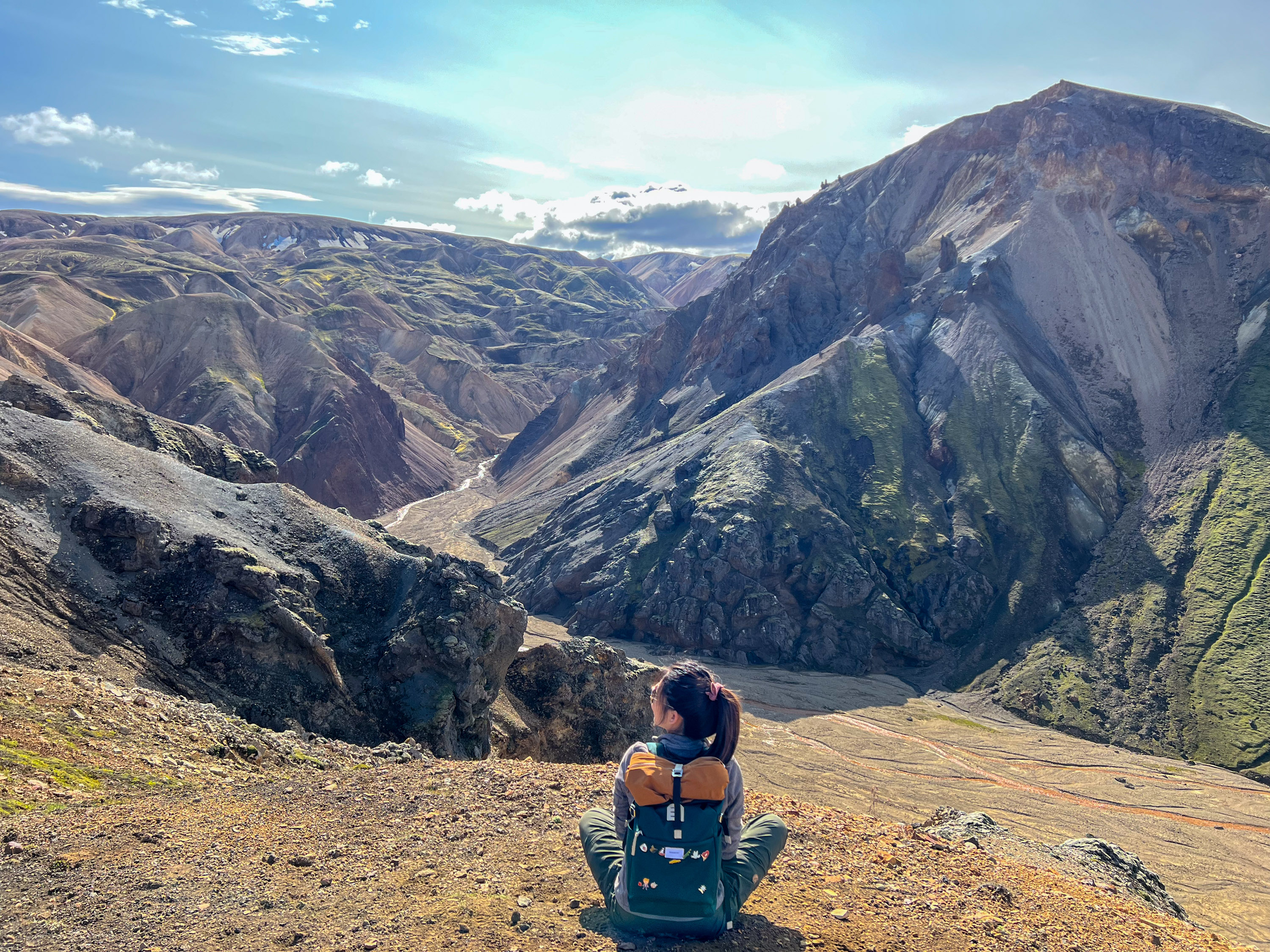 Au sommet, on a une vue sur tout le Landmannalaugar, l’endroit est idéal pour une pause et on s’assoit au bord pour profiter de ce moment. Un long moment.