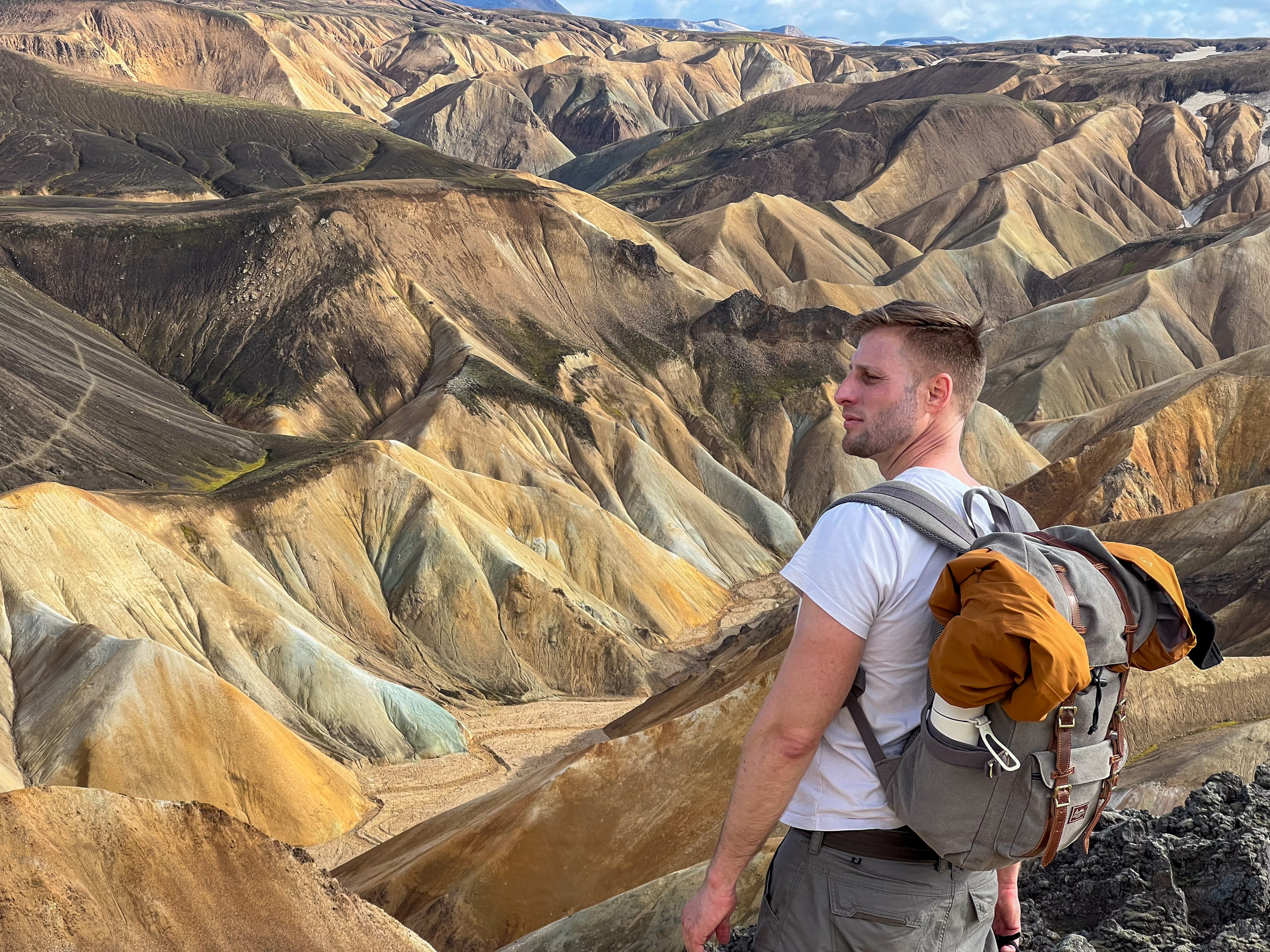 Le temps change toujours rapidement en Islande et après le ciel noir de la matinée on a le droit à un beau soleil et il commence même à faire chaud, la température atteint les 16°C. On retire donc toutes les couches que l’on avait sur nous, le surpantalon, la veste coupe vent et le pull, on fini donc en T shirt au Landmannalaugar, c’est vraiment assez inhabituel je pense.