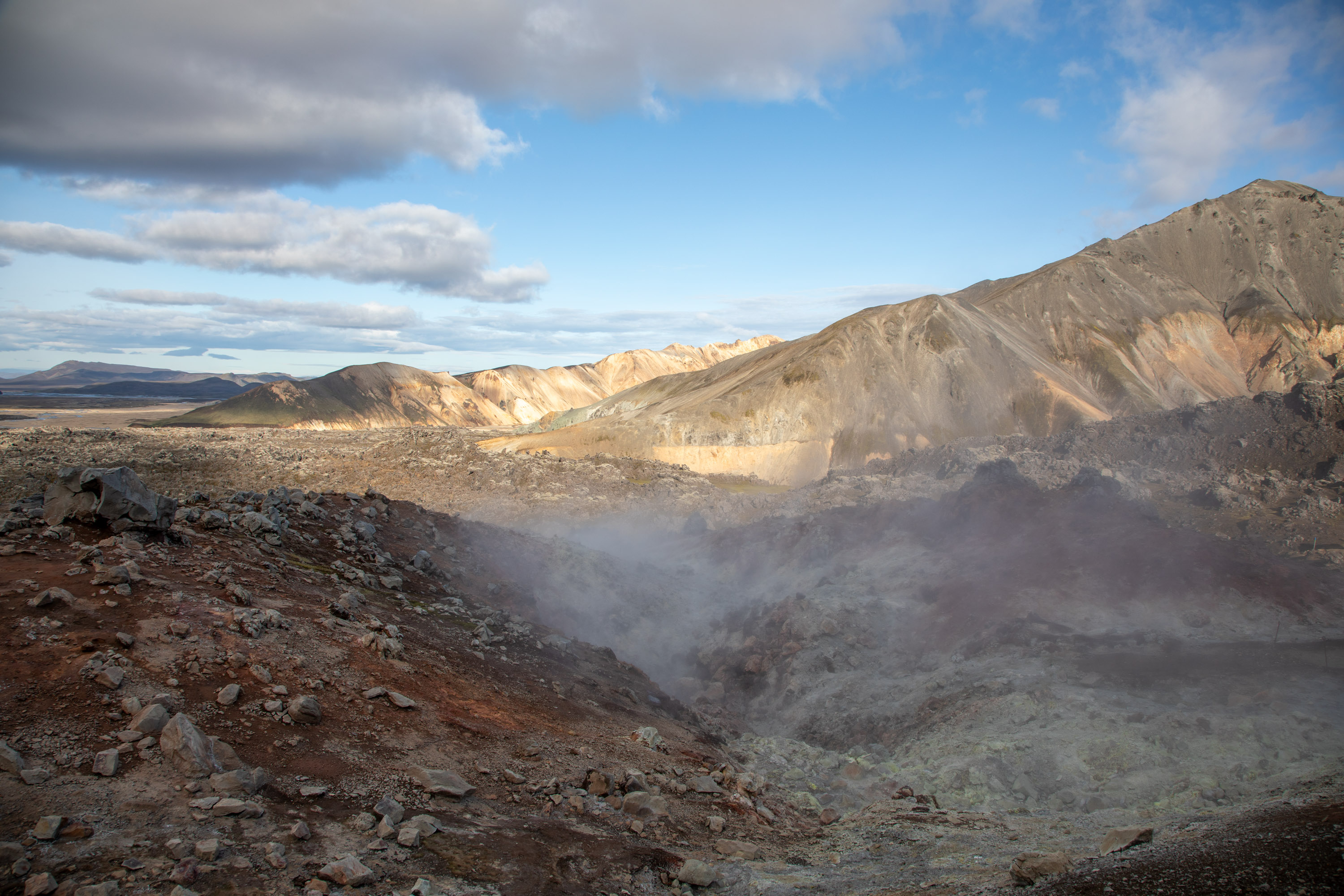 Ensuite il y a une boucle plus longue qui va jusqu’au sommet de Bláhnjúkur et une autre boucle qui va jusqu’au sommet de Brennisteinsalda, les deux montagnes du parc. Il est aussi possible de faire une grande boucle avec les deux sommets mais il faut avoir une bonne condition physique et partir le matin. Cela me semble faisable, mais je pense que ma copine ne pourrait pas suivre, et on prend tellement de temps à profiter pour observer le paysage que l’on ne serait jamais rentré avant la nuit.