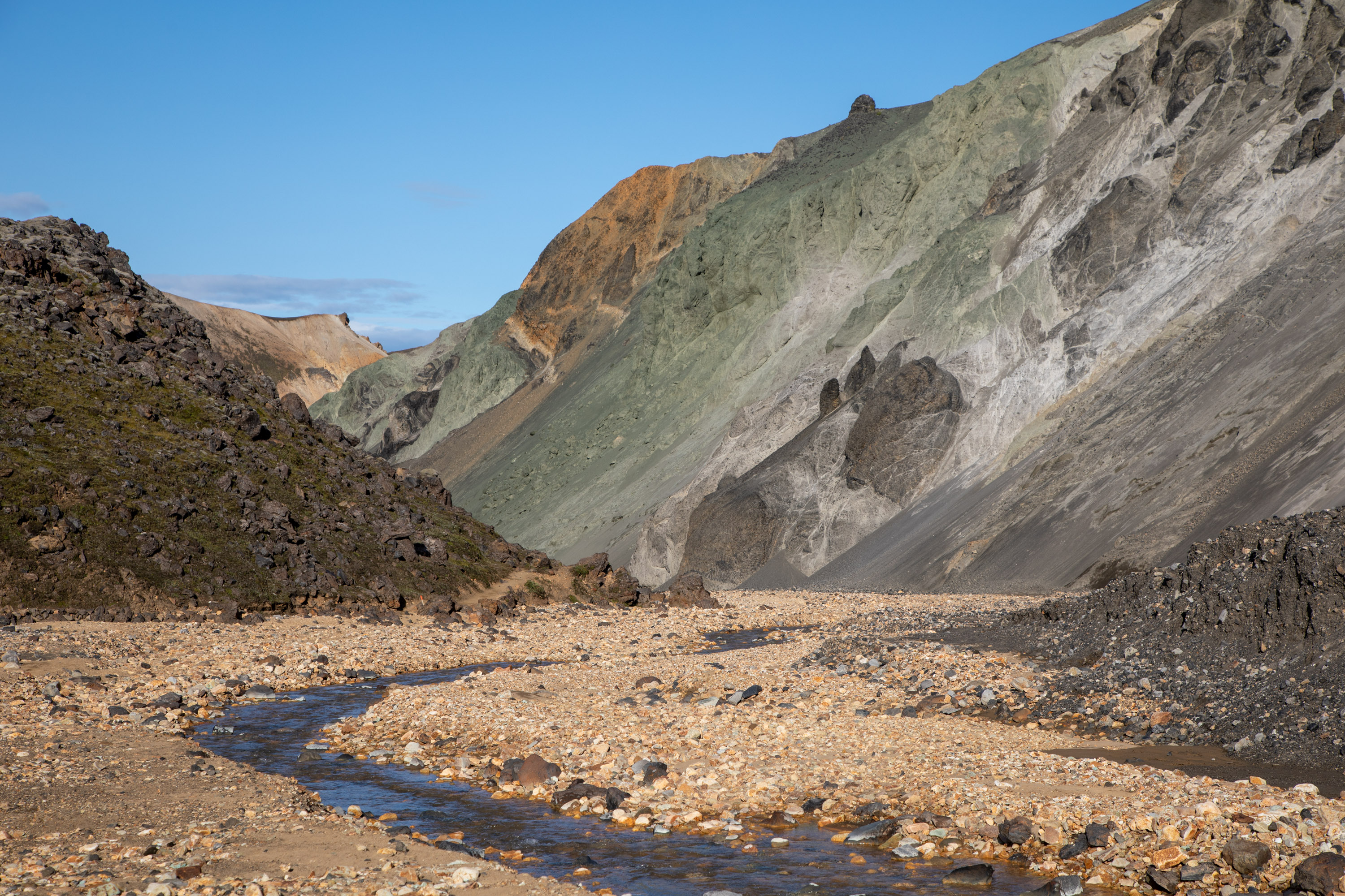 On arrive au bord de la rivière et on marche dans son lit jusqu’au camping du Landmannalaugar. On traverse des endroits où la terre a des couleurs que l’on n’avait pas encore vu comme ce vert foncé.