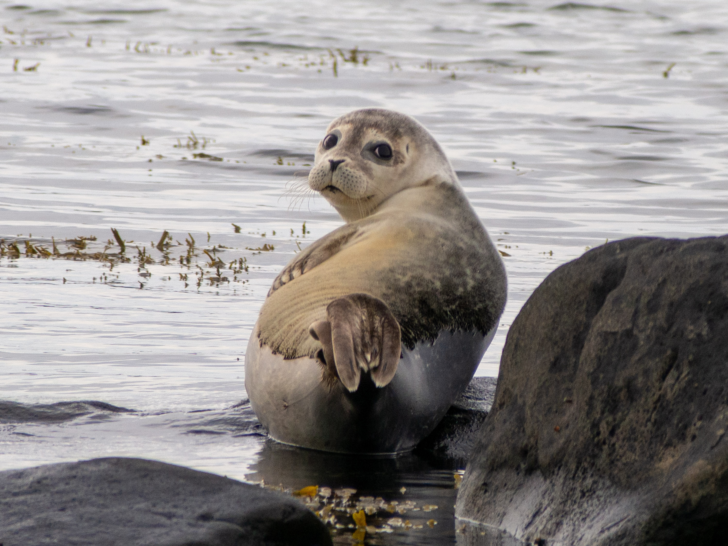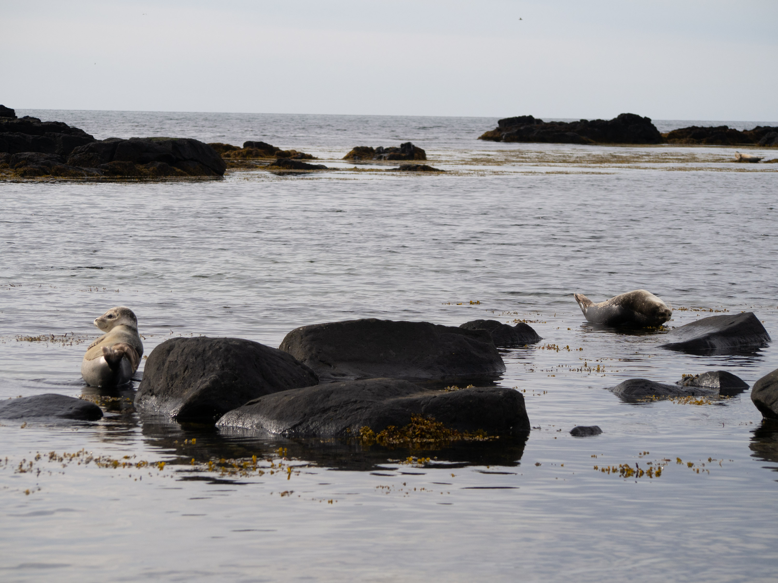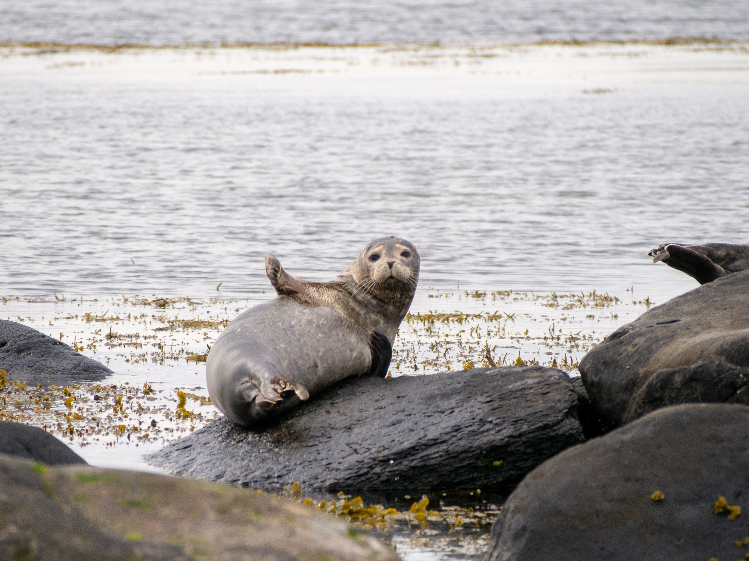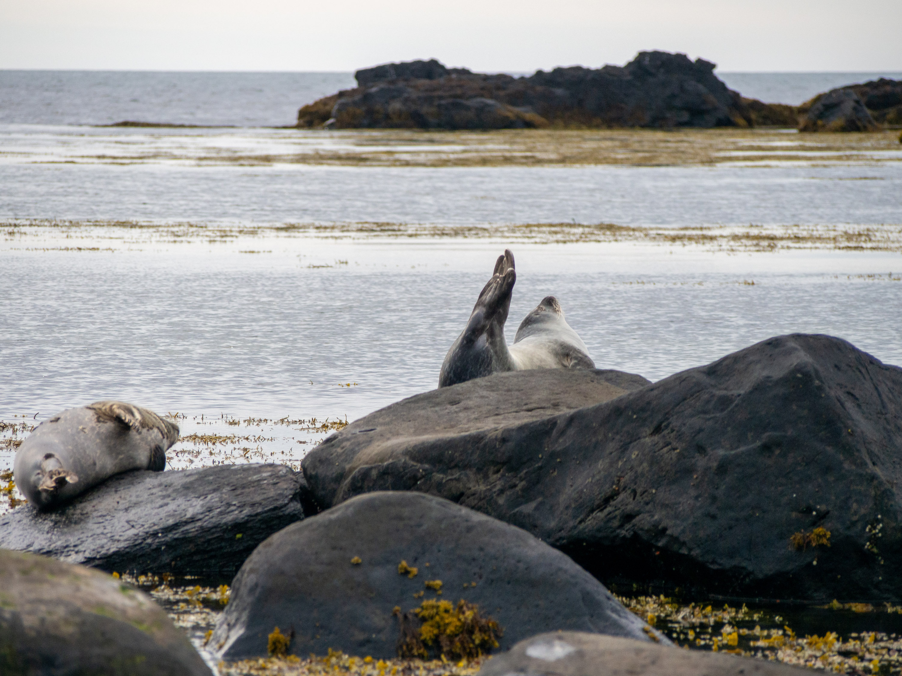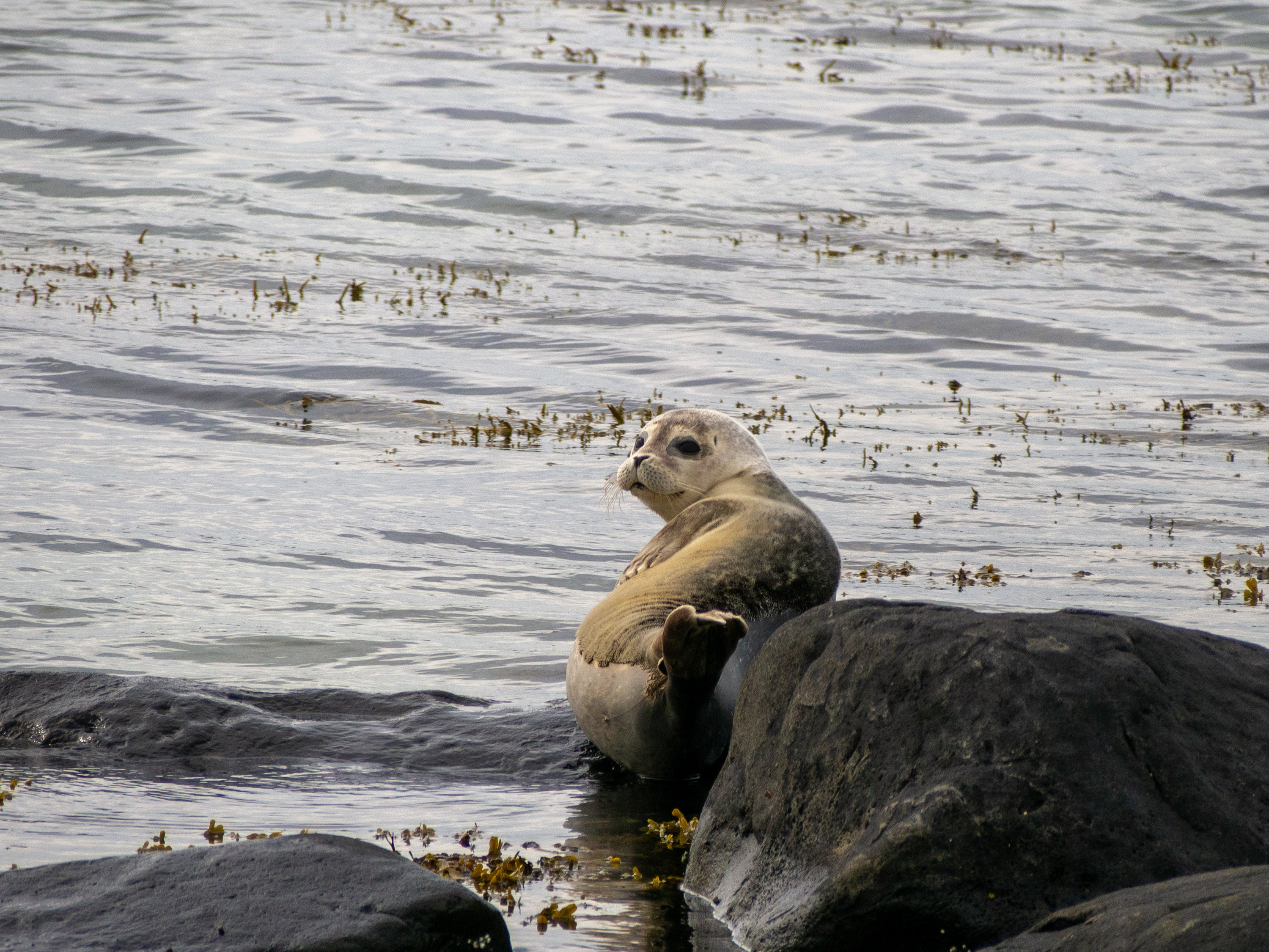 Il faut compter un peu moins de deux heures pour rejoindre la péninsule de Snæfellsnes. Nous rejoignons d’abord la plage de Ytri Tunga car ma copine veut absolument s’approcher des phoques de près. Nous avons cherché désespérément voir des phoques installés sur des rochers pendant nos jours dans le sud du pays mais nous n’avons jusqu’à présent que leur tête qui dépassait hors de l’eau rien d’autre. A Ytri Tunga, leur présence est plus massive et donc c’est presque garanti d’en voir de près installé sur la grève ou les rochers. La plage appartient à un propriétaire privé, il faut donc s’acquitter d’un droit de parking à la borne. Il est aussi demandé de garder le silence et de ne pas s’approcher pour ne pas gêner les animaux sauvages. Règles qui ne sont bien sur pas respectées par tout le monde et c’est vraiment triste. On aurait imaginé les touristes qui viennent découvrir l’Islande plus sensibilisés au respect des animaux mais ce n’est pas le cas malheureusement. Lorsque quelqu’un faisait du bruit, les phoques se tournent pour voir ce qu’il se passe, on voit qu’ils sont dérangés. Néanmoins, nous passerons une bonne partie de la matinée à les observer, ils sont vraiment mignons.
