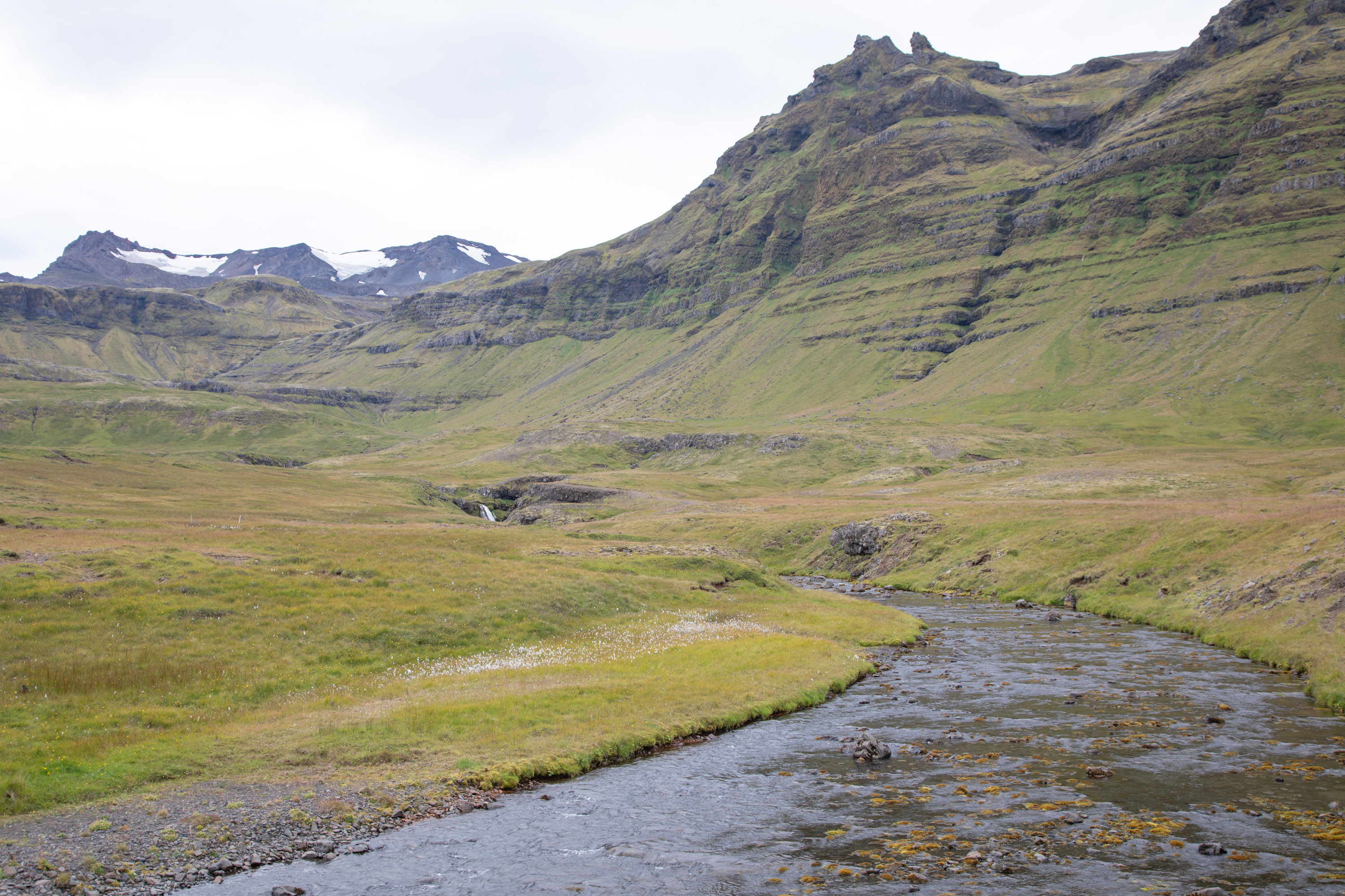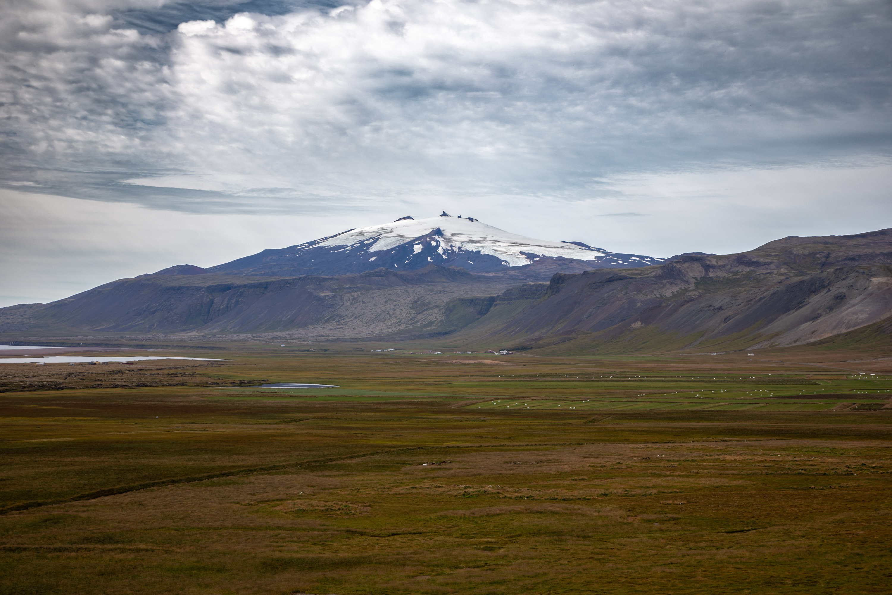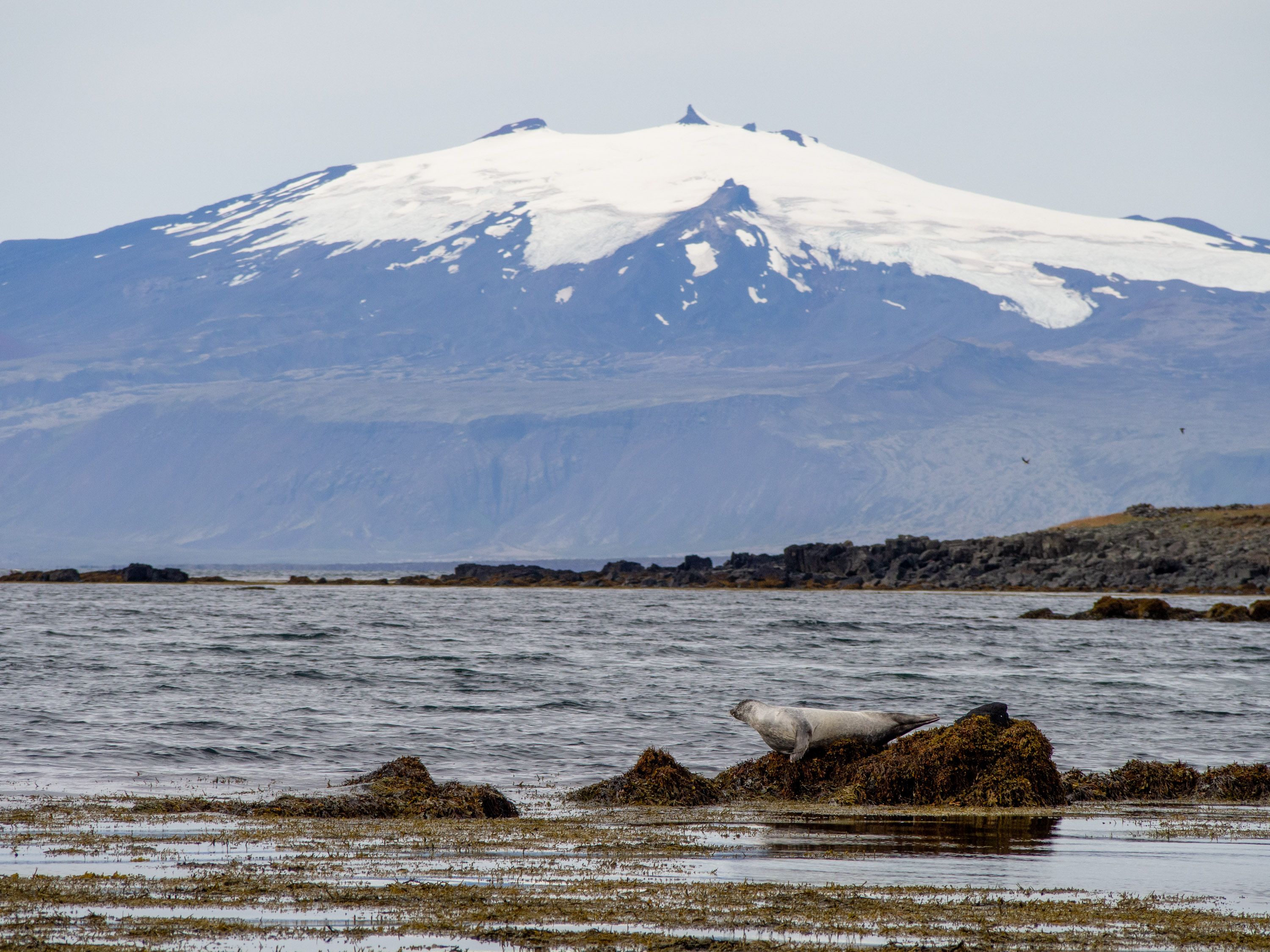 Ce qui rend la plage de Ytri Tunga tellement incroyable, c’est qu’en retrait de la colonie de phoques, il y a une montagne qui s’élève bien plus que les autres, chapeauté par un glacier blanc, c’est le Snæfellsjökull, un nom impressionnant comme une version européenne du mont Fuji. Sa forme en cône rappelle évidemment son célèbre cousin du Japon.