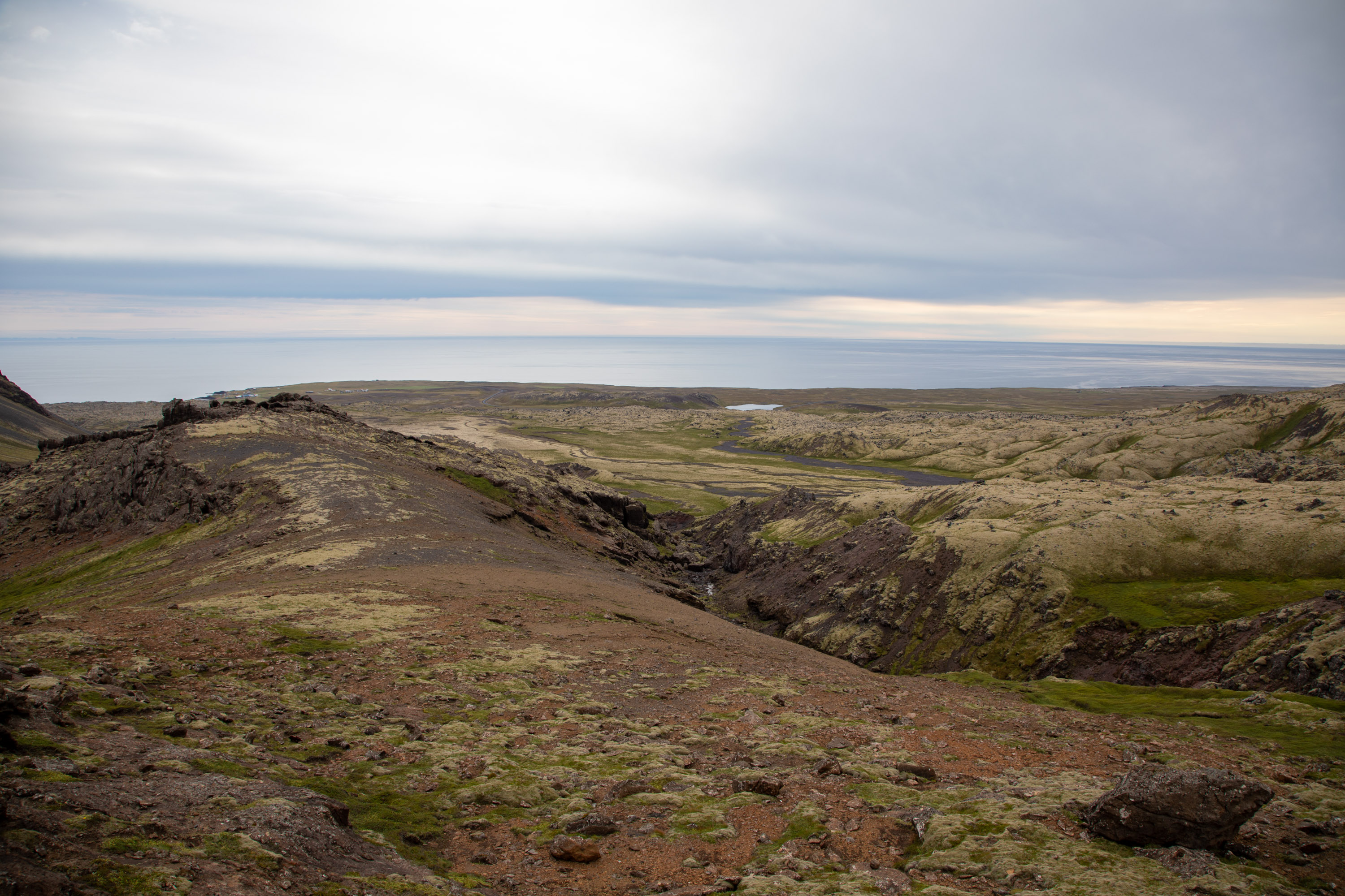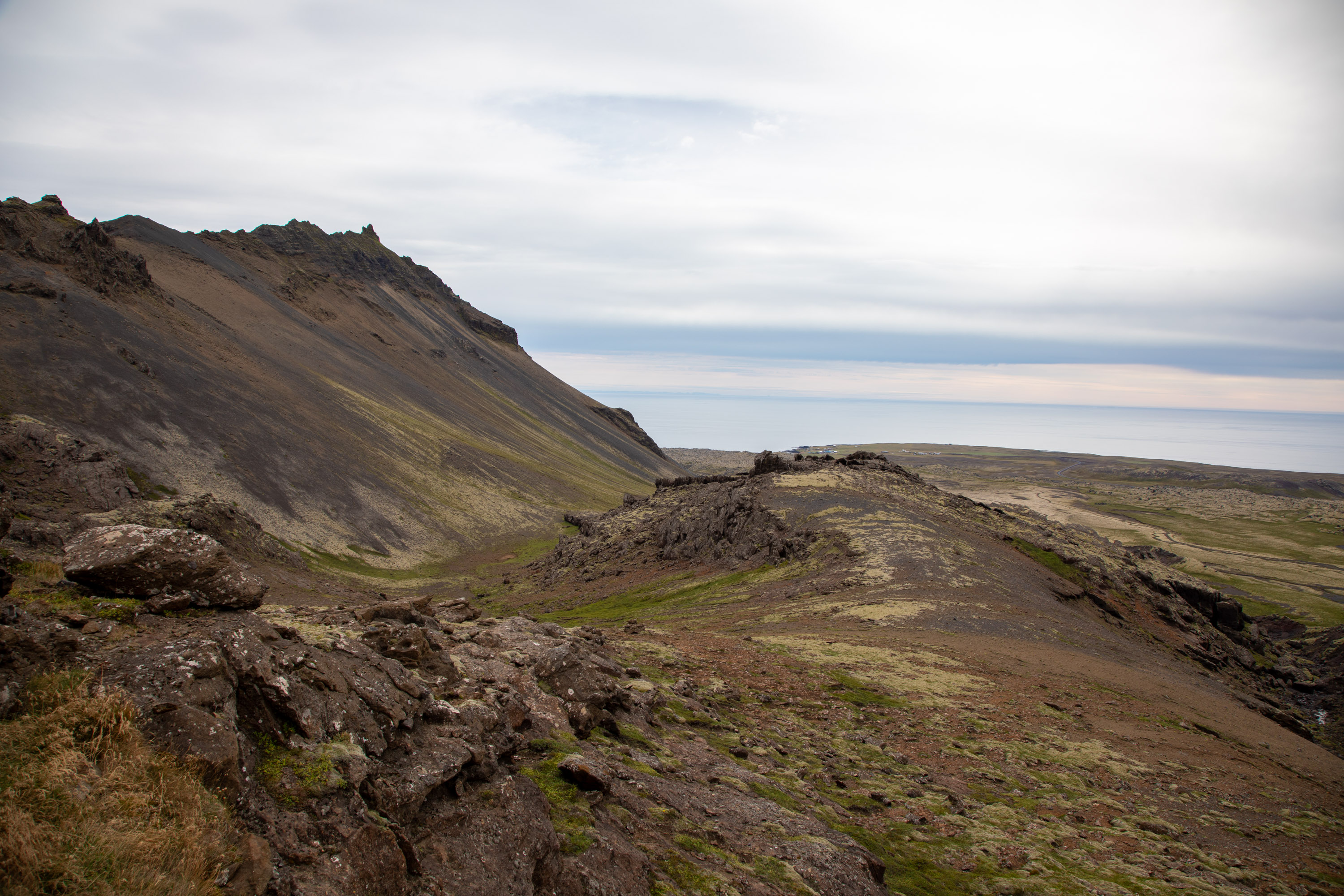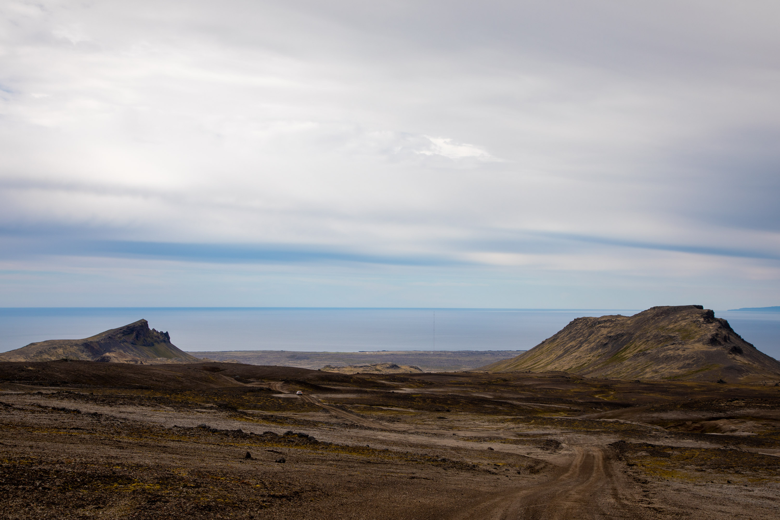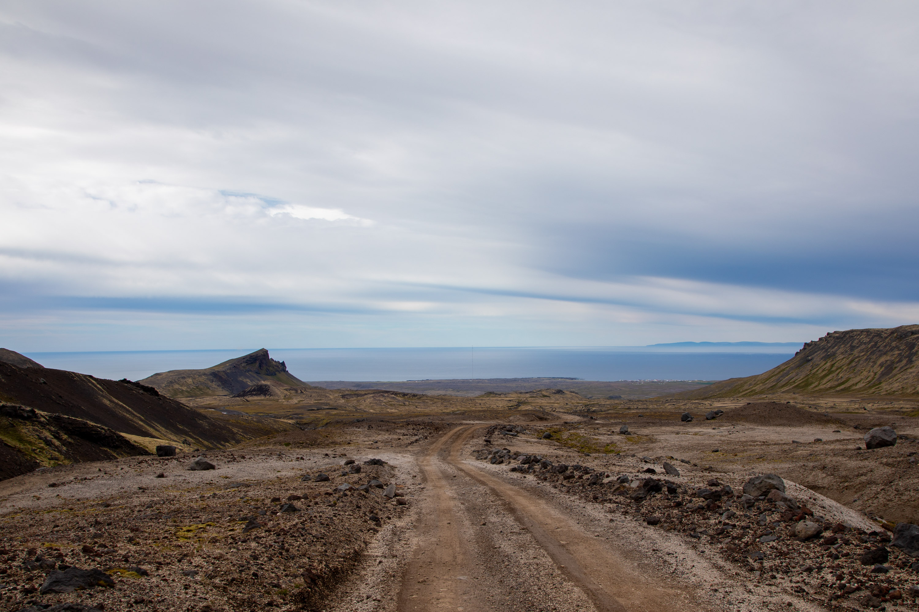 Pour la suite de la journée, on décide de rejoindre le charmant village de Hellissandur en traversant la péninsule du Sud au Nord par la F-road F570. J’avais lu qu’elle était très pittoresque sans que le niveau de difficulté soit trop important. On grimpe sur une piste agréable mais bien caillouteuse quand même jusqu’au glacier de Snæfellsjökull. On peut voir la mer au loin.