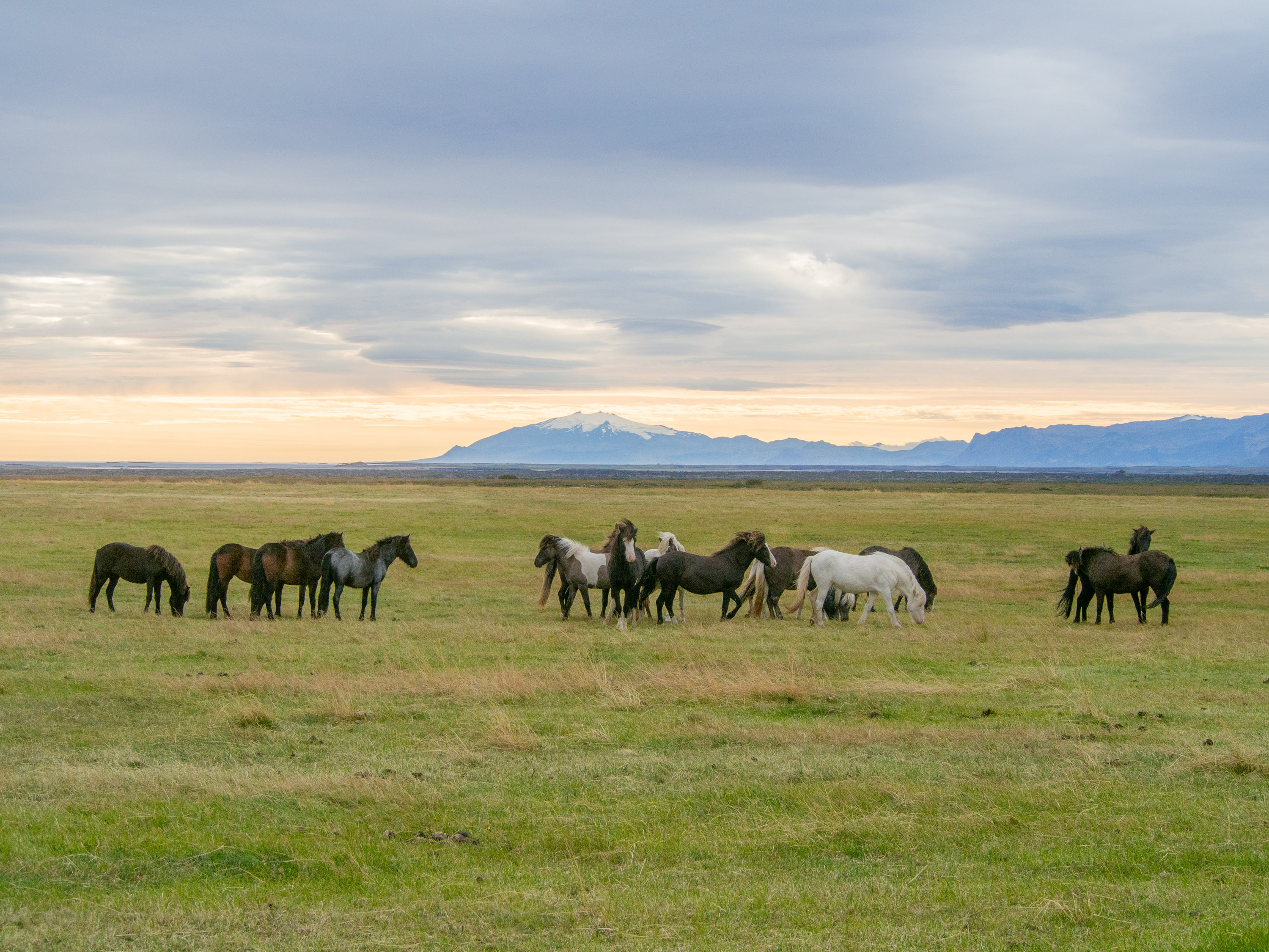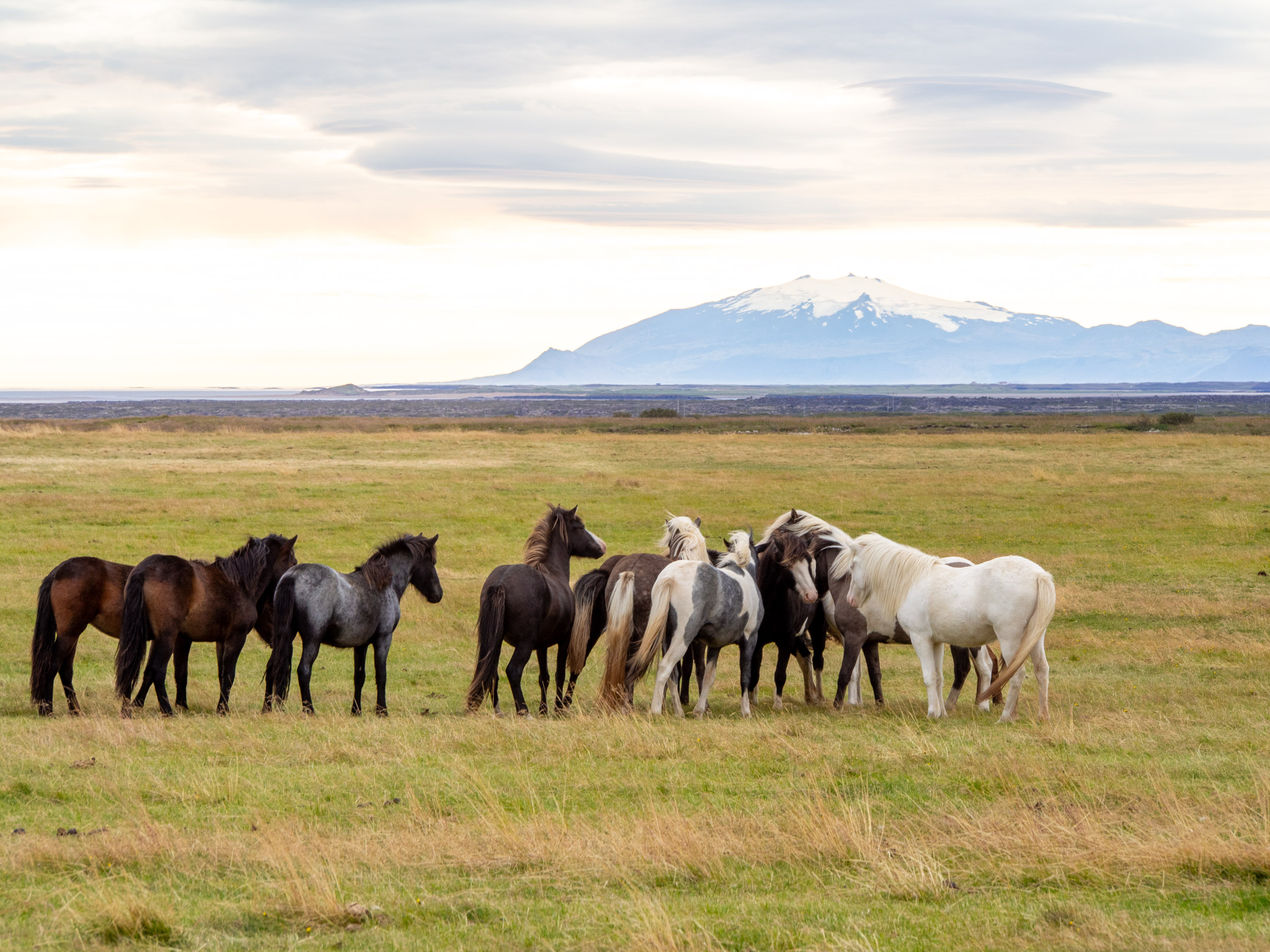 Sur le bord de la route, un groupe de chevaux broute l’herbe de la prairie, l’image est belle avec le Snæfellsjökull en arrière plan.