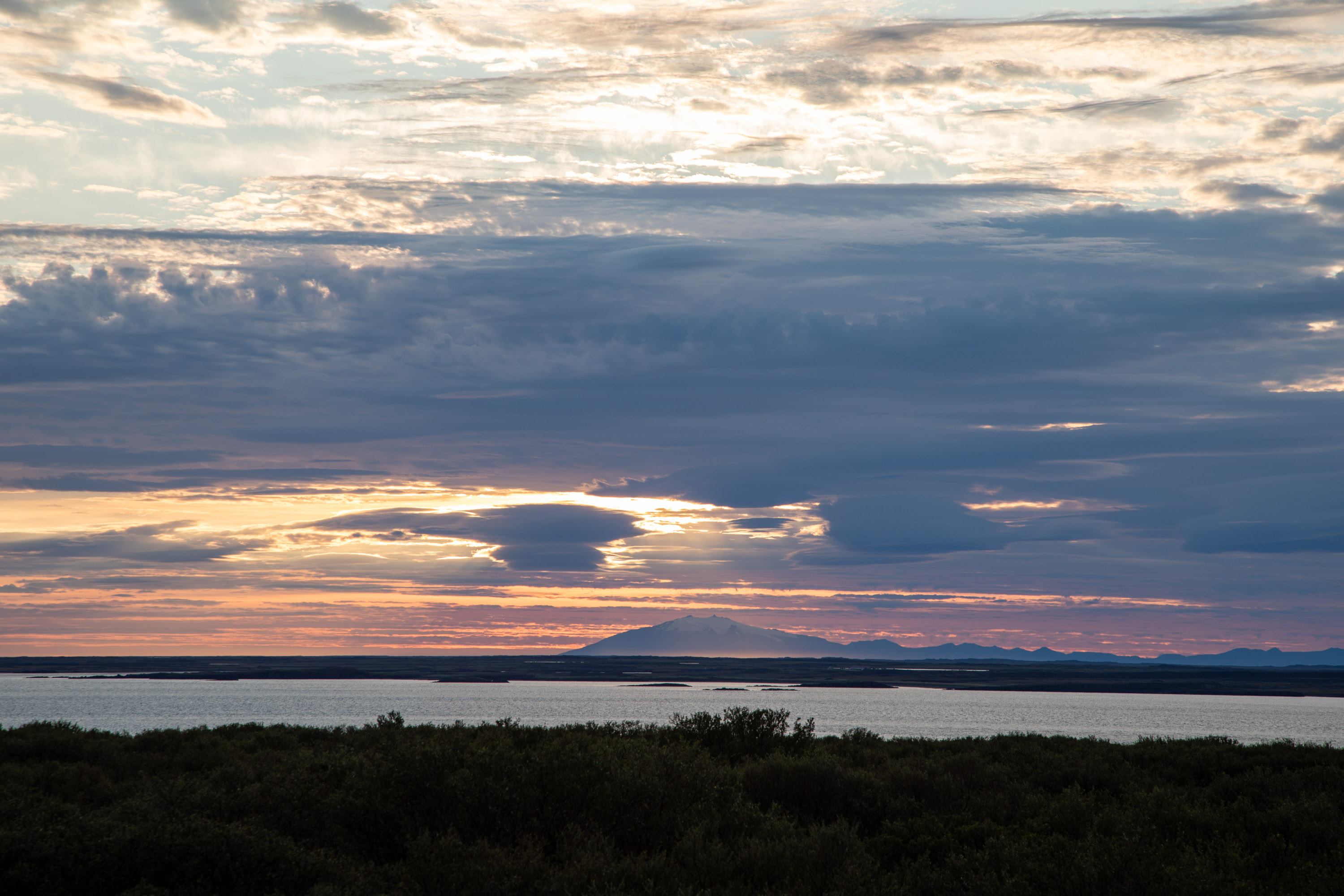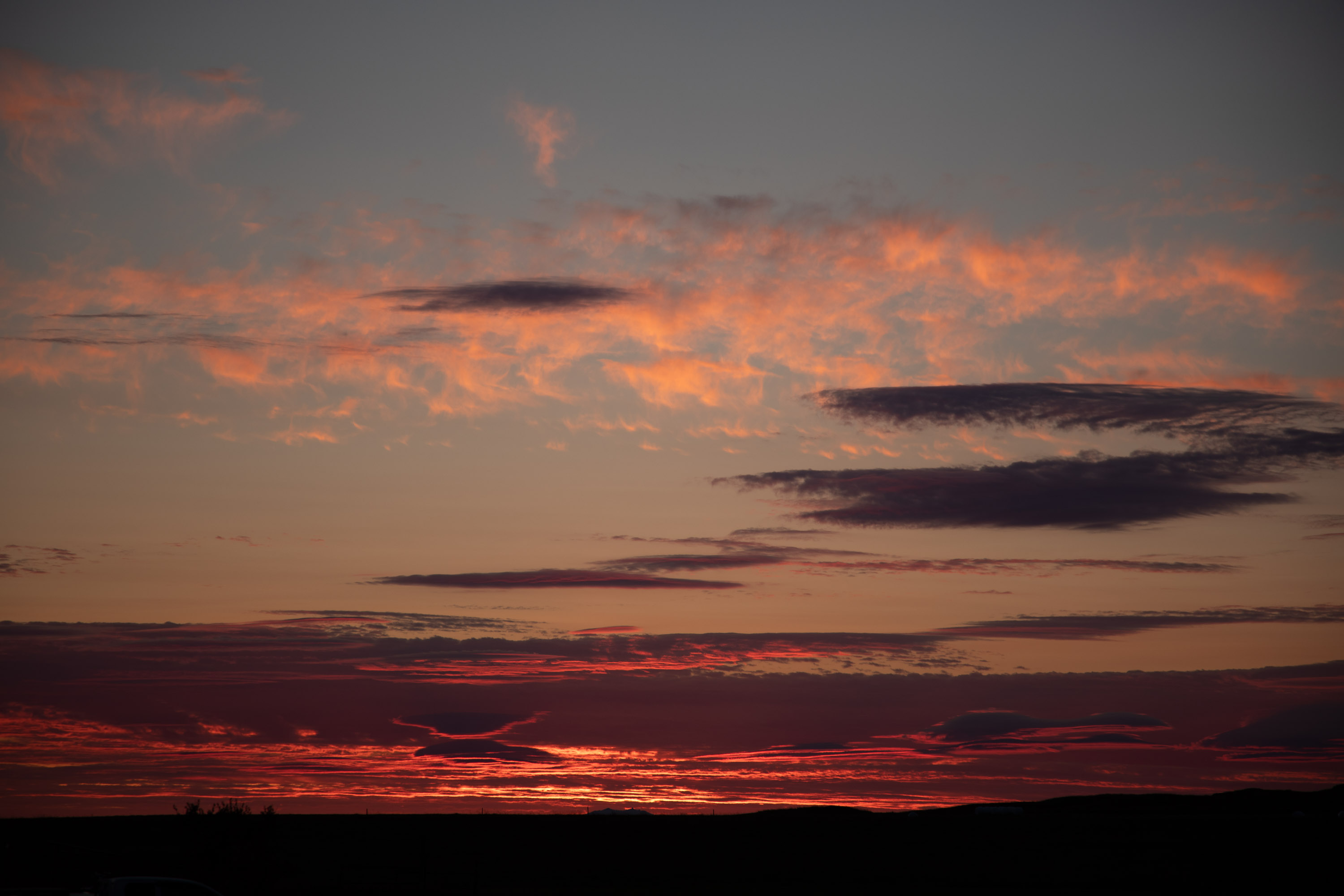 Puis plus tard sur la route de Reykjavik, on a le droit à un magnifique coucher de soleil qui dure très longtemps. Entre la première et la deuxième photo, on a eu le temps de rouler un moment jusqu’à notre hôtel qui se trouve à Akranes, dans un cadre bucolique adorable.