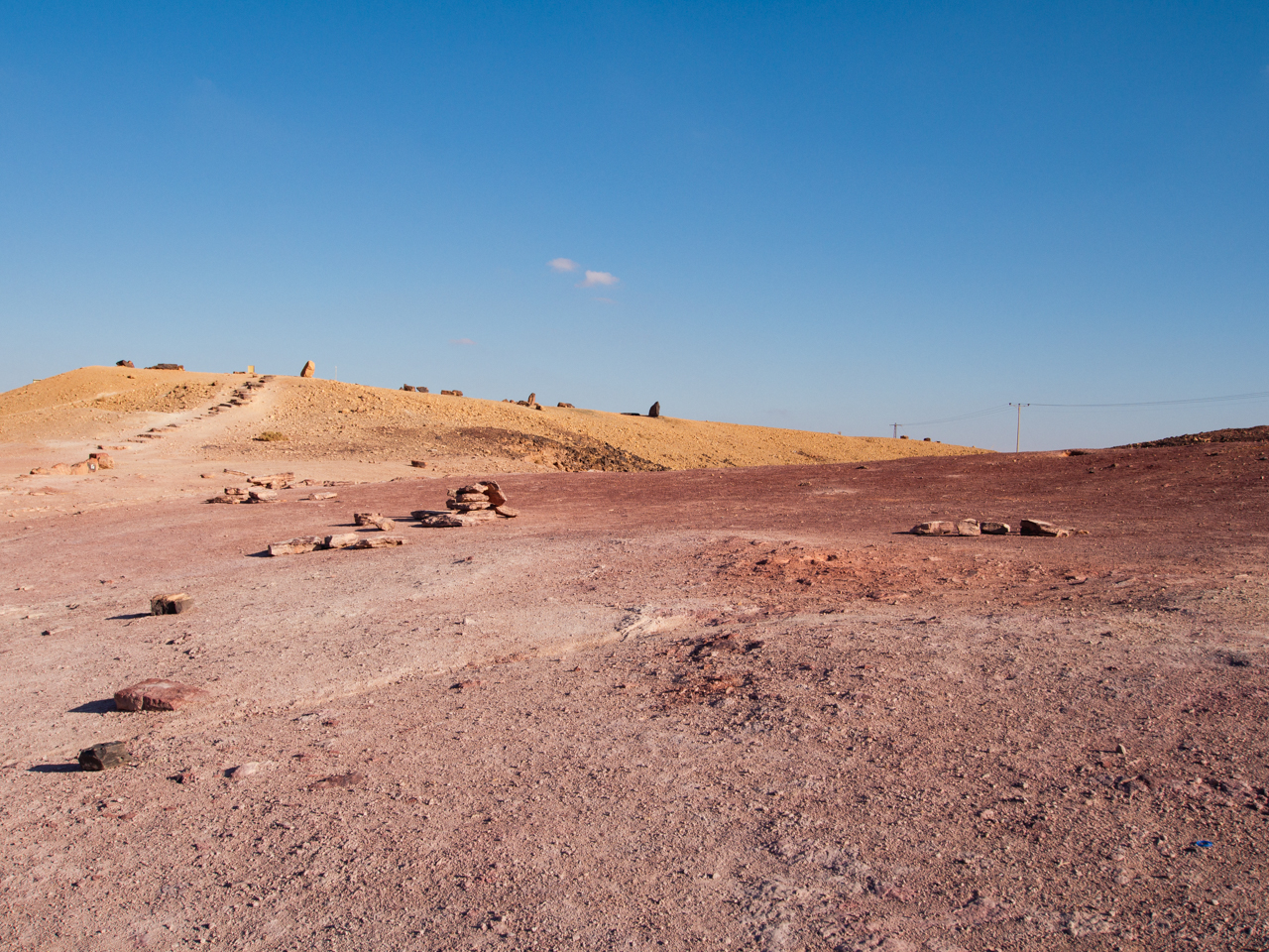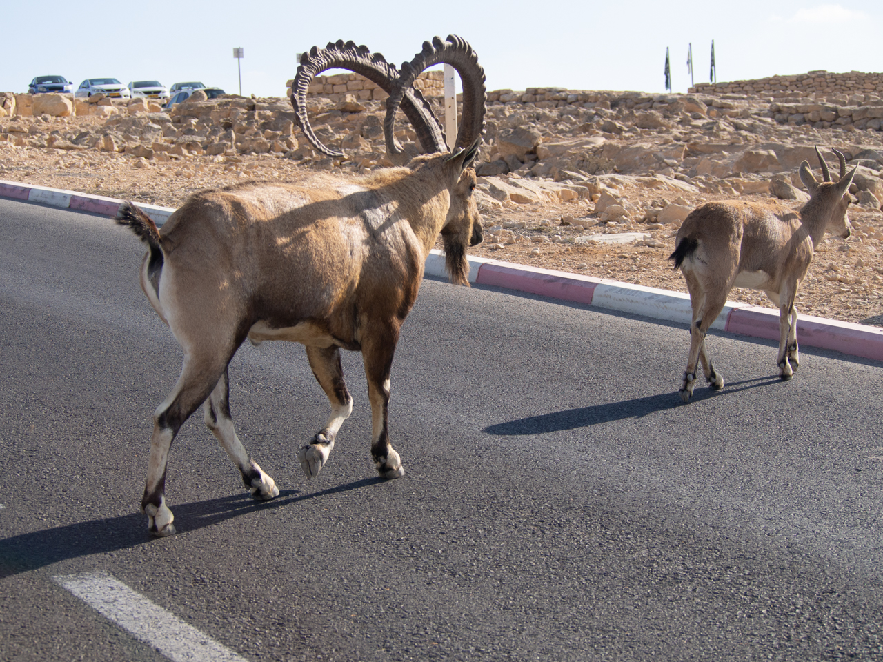On contourne ensuite le complexe de recherche nucléaire de Neguev, ici les panneaux indiquent qu’il est interdit de s’arrêter sur le bord de la route, de filmer. On ne peut voir qu’au loin à l’horizon derrière les barbelés des grandes cheminées qui fument. La zone est immense, la route est interminable. Après 2 heures de route depuis la Mer Morte on arrive finalement à Mitpze Ramon. On est accueilli dans cette petite ville de province par un troupeau d’ibex qui traverse la route nonchalamment.