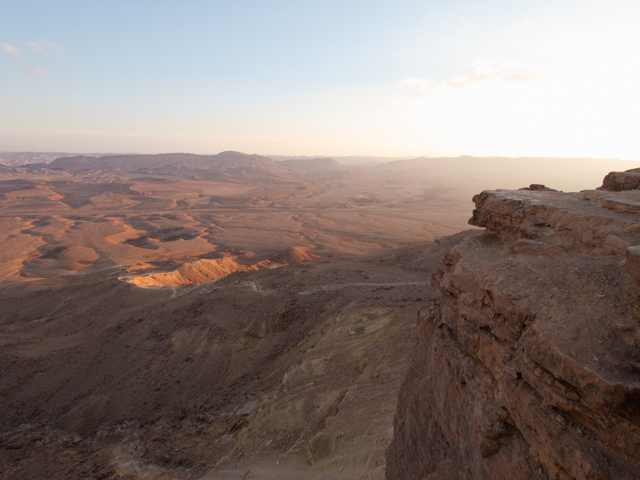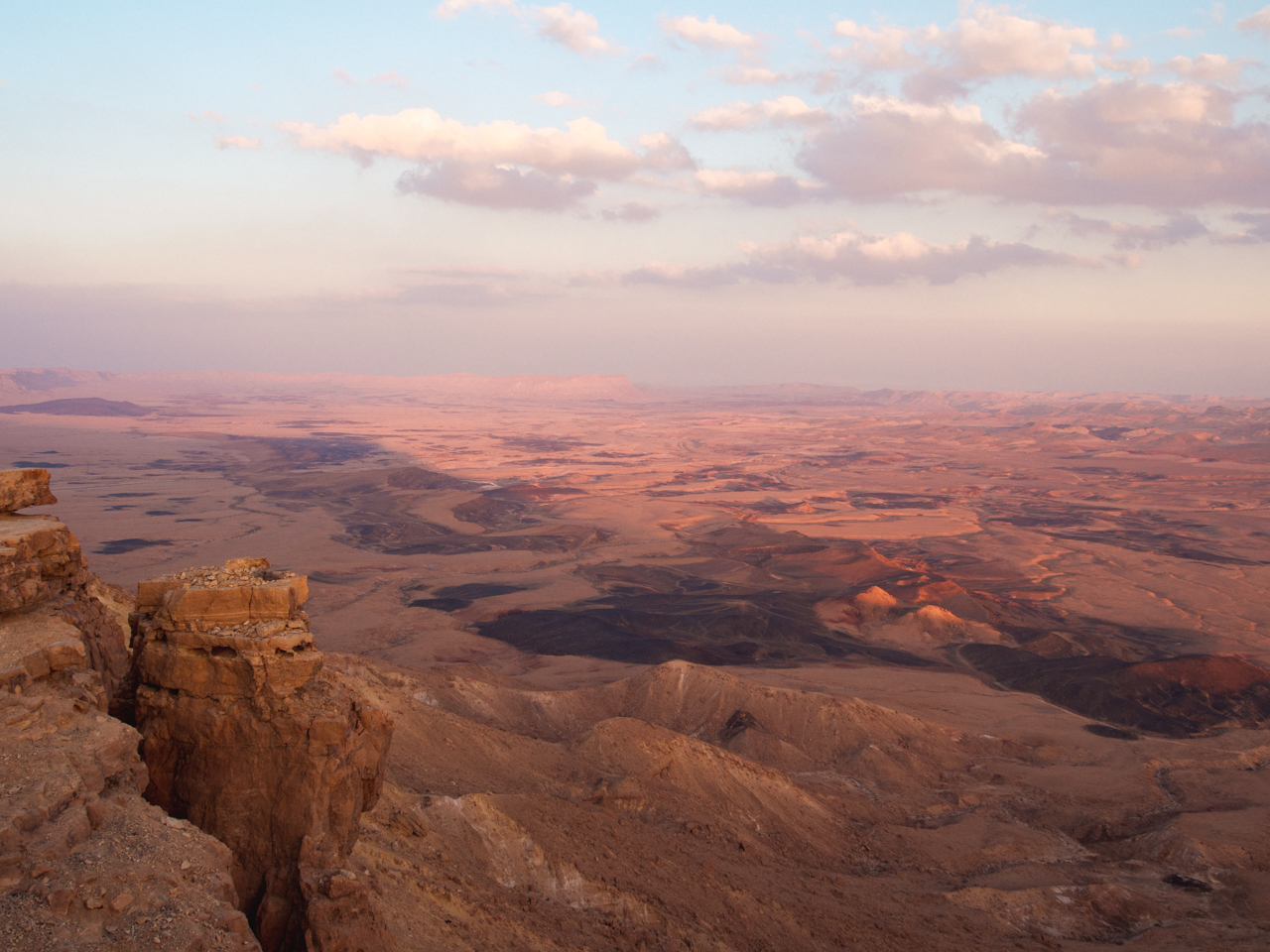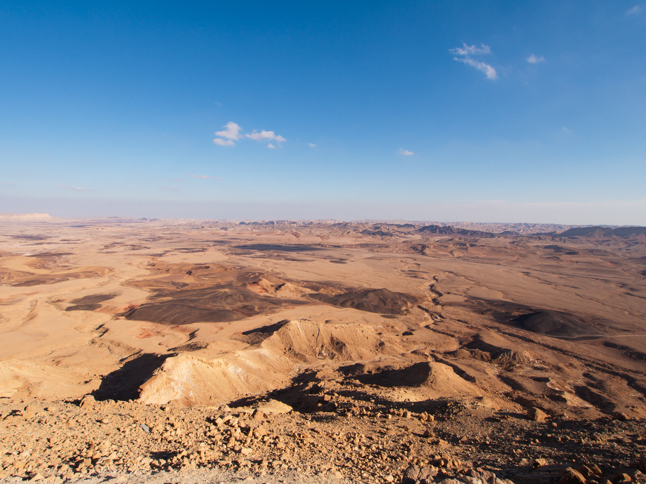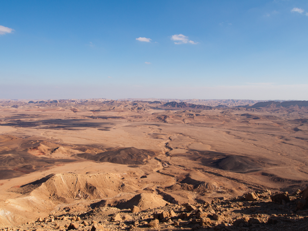 En partant de la Mer Morte, on se dirige vers la partie la plus méridionale du pays, pas loin de la frontière égyptienne pour découvrir le cratère de Mitpze Ramon. Le Mitpze Ramon est un phénomène d’érosion gigantesque, une curiosité géologique aux couleurs ocres, où vit pourtant une faune riche que l’on aura la chance de voir de nos propres yeux. Nous traversons alors le Sud Israélien désertique avant d'arriver à notre dernière étape de notre séjour, une conclusion en forme d'apothéose, avec ce paysage minéral étonnant qui nous fait penser à la surface de Mars plutôt qu'à notre Planète Bleue.