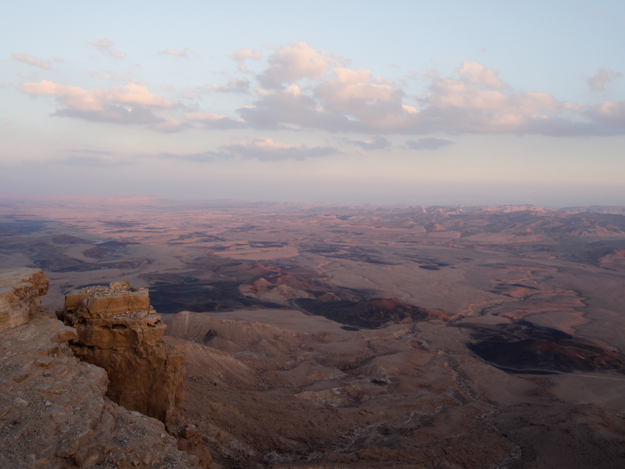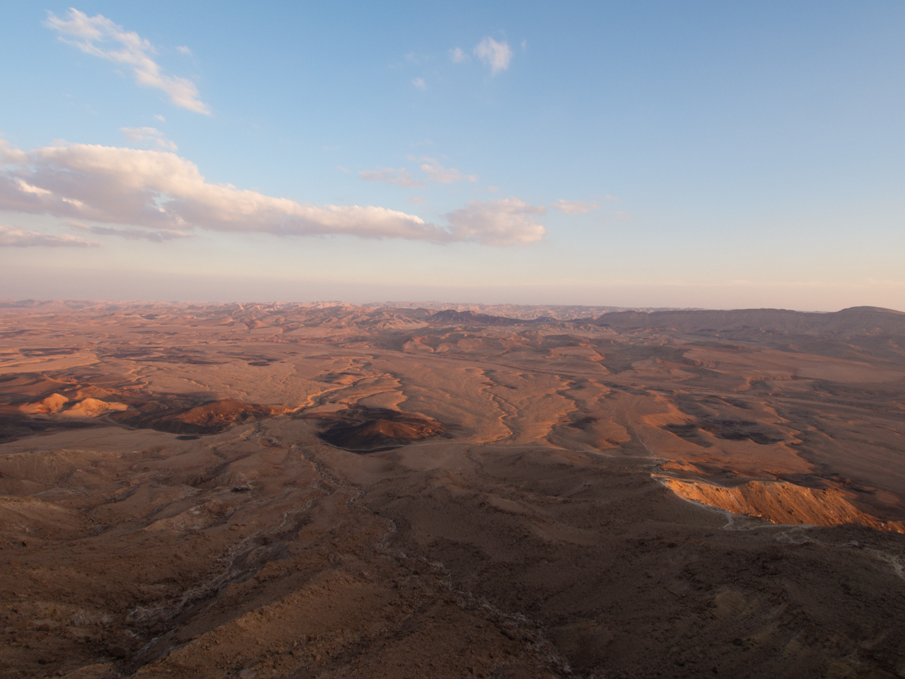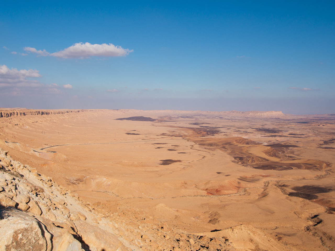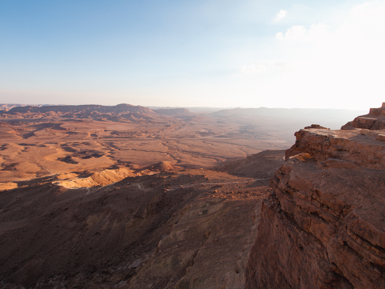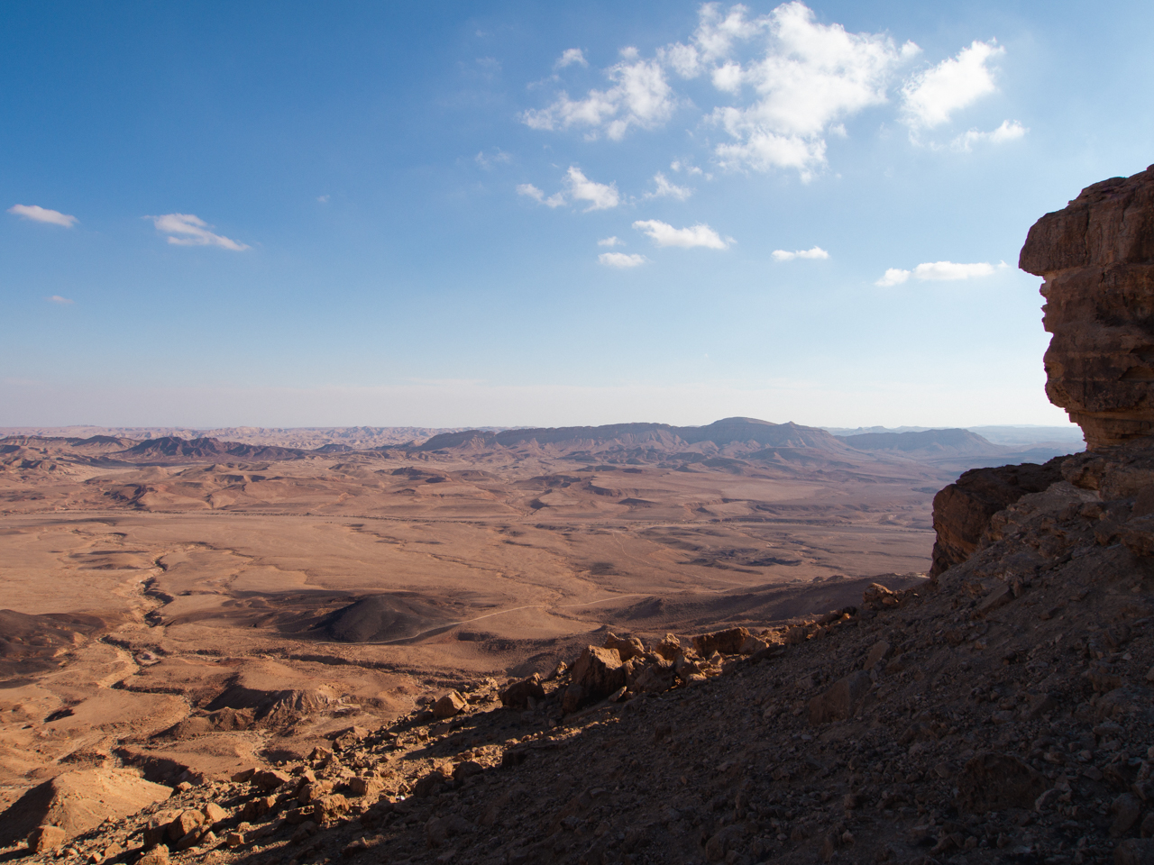 En partant de la Mer Morte, on se dirige vers la partie la plus méridionale du pays, pas loin de la frontière égyptienne pour découvrir le cratère de Mitpze Ramon. Le Mitpze Ramon est un phénomène d’érosion gigantesque, une curiosité géologique aux couleurs ocres, où vit pourtant une faune riche que l’on aura la chance de voir de nos propres yeux. Nous traversons alors le Sud Israélien désertique avant d'arriver à notre dernière étape de notre séjour, une conclusion en forme d'apothéose, avec ce paysage minéral étonnant qui nous fait penser à la surface de Mars plutôt qu'à notre Planète Bleue.