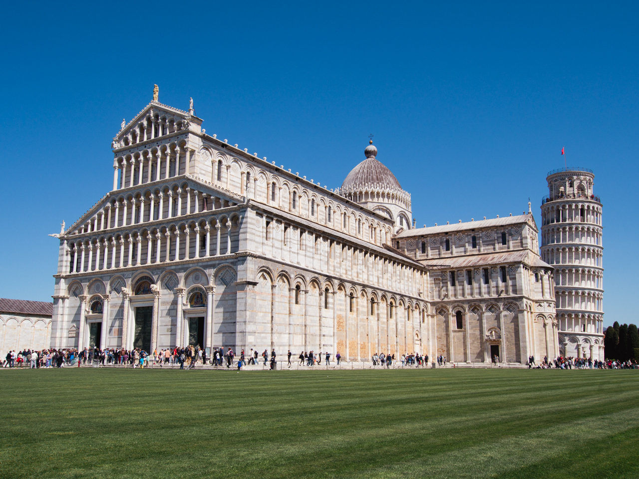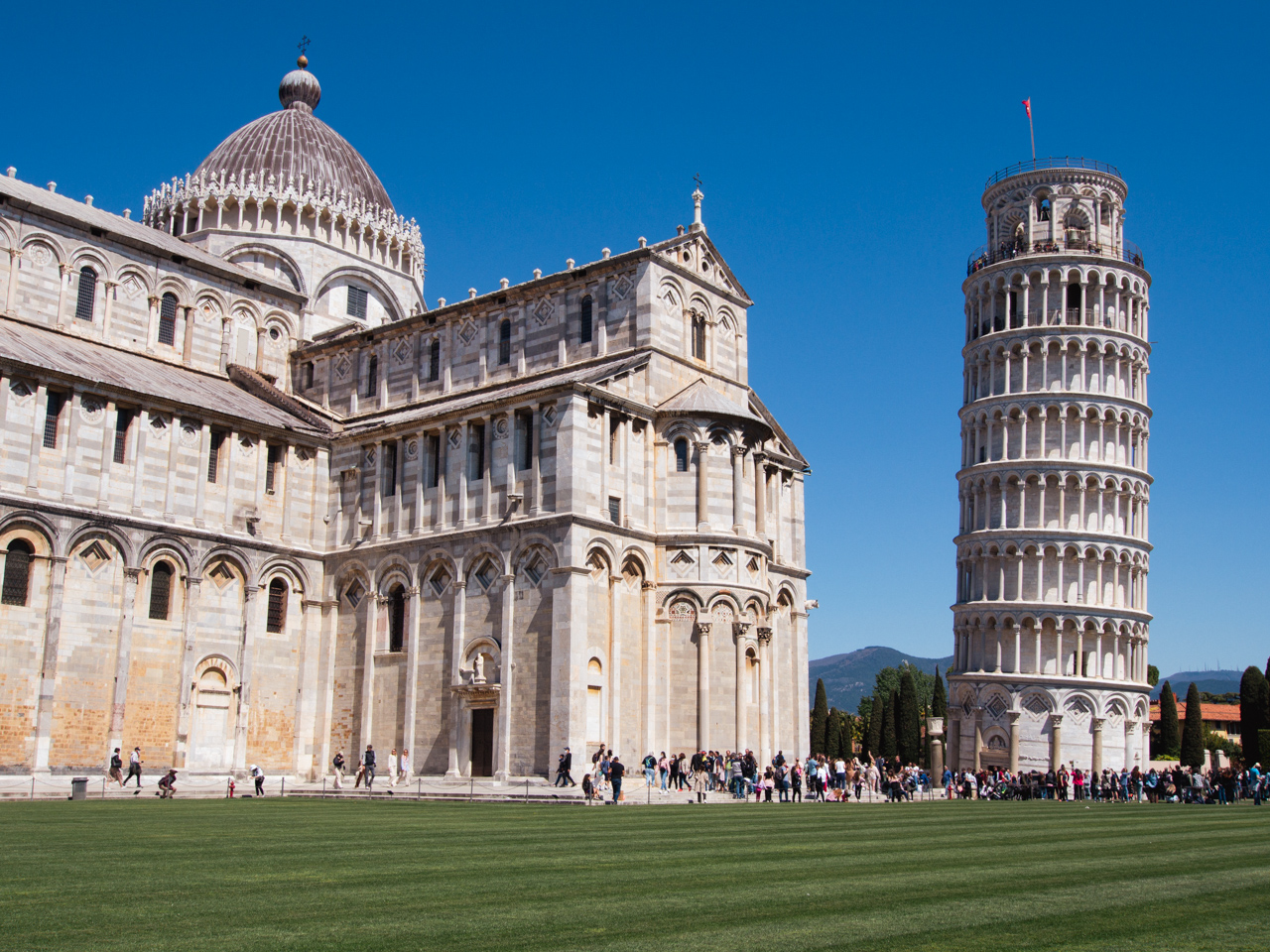 La tour de Pise est en fait à l’origine destinée à servir de clocher pour la cathédrale de la ville qui se trouve à côté. Ce bâtiment majestueux a une grande façade avec de nombreux détails et colonnes.
