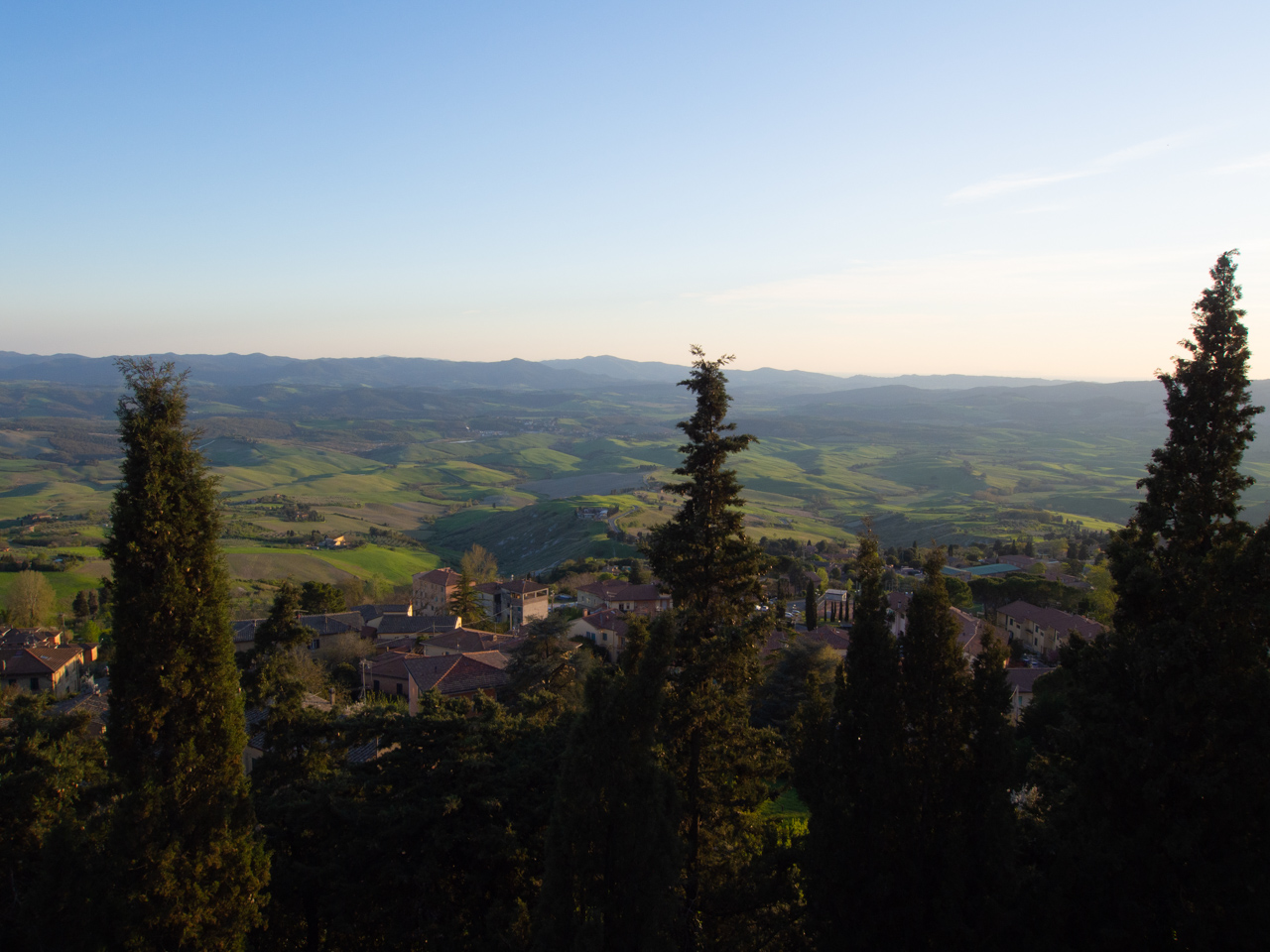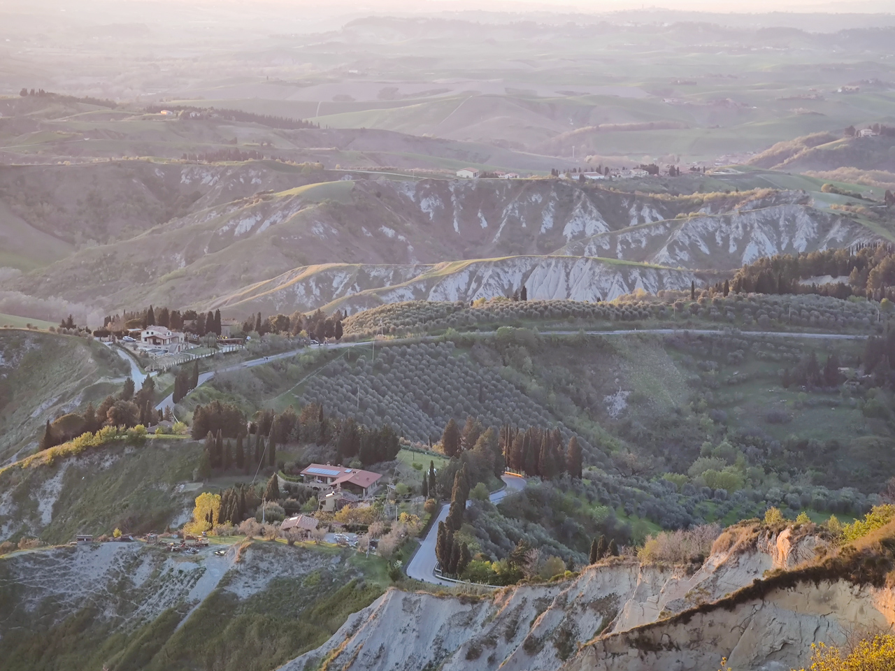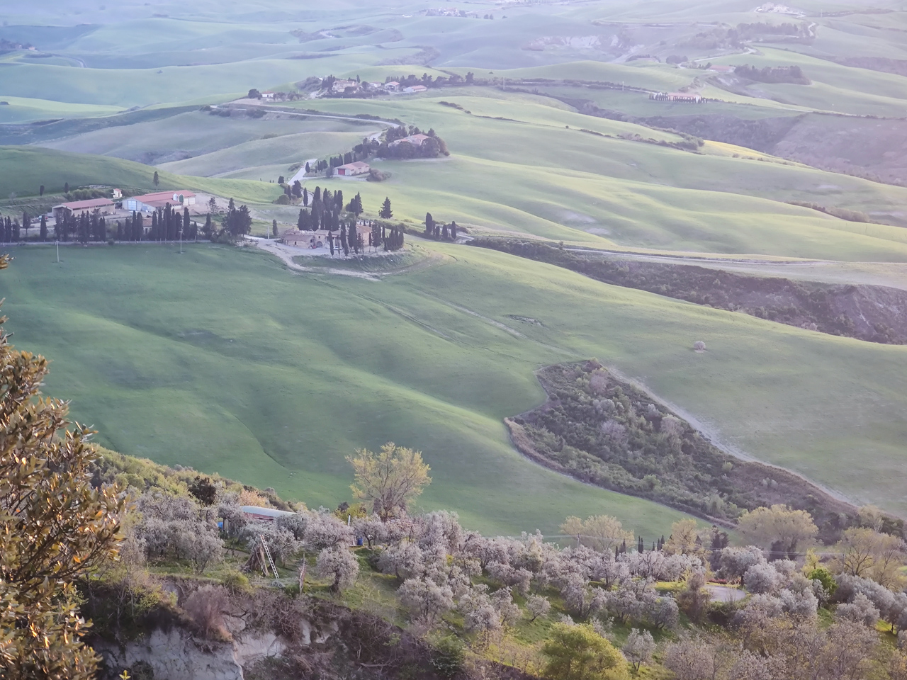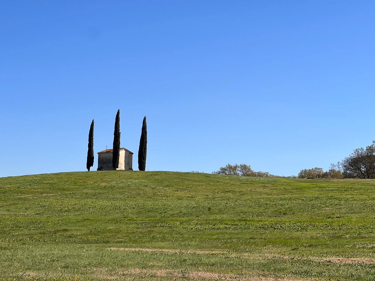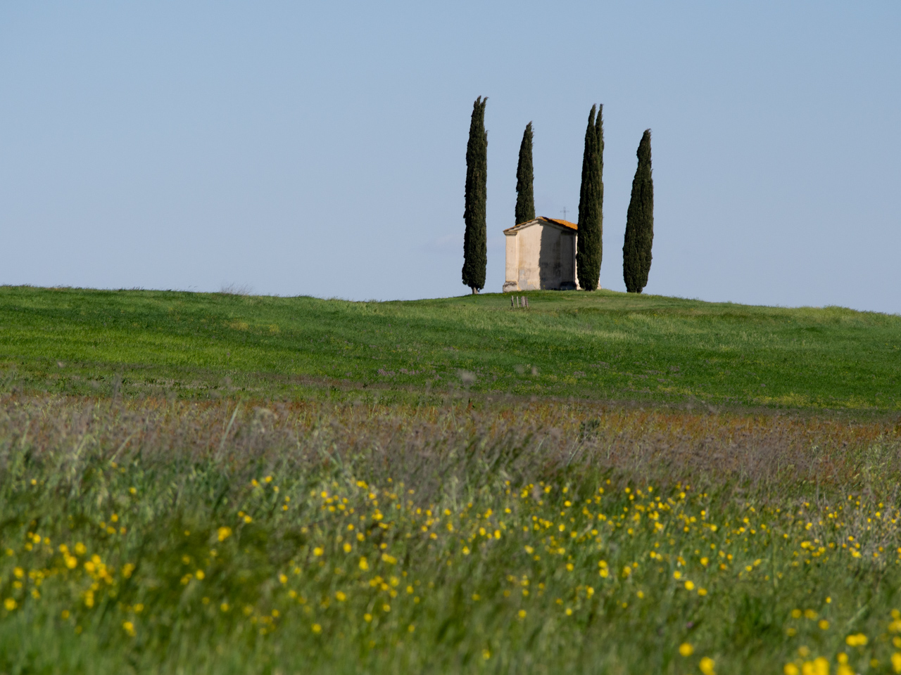 Sur la route, nous traversons des paysages typiques de la Toscane au printemps, si verte avec des allées bordées de cyprès, des églises isolées au milieu des près.