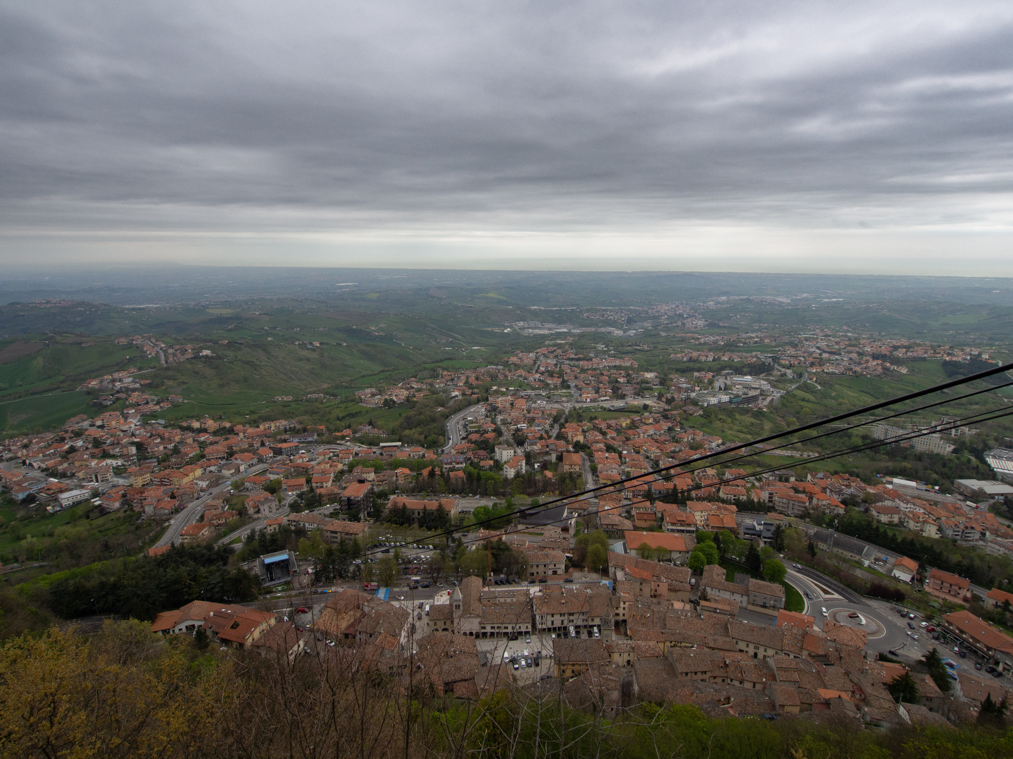 On se lève avec malheureusement un ciel bien gris aujourd’hui pour cette visite de San Marino. Perché tout en haut d’un éperon rocheux qui surplombe la vallée vers Rimini et l’Adriatique, le vent souffle très fort et l’humidité rend la ballade beaucoup moins agréable. La ville fortifiée est accessible depuis le téléphérique qui dessert d’autres quartiers de San Marino sous les falaises de la montagne.