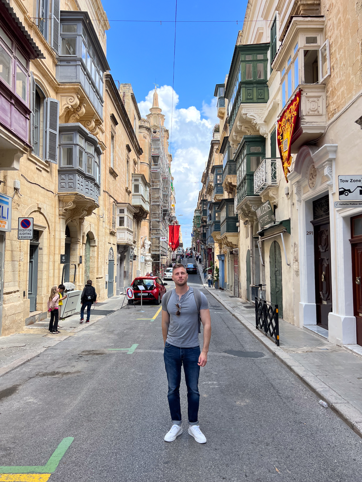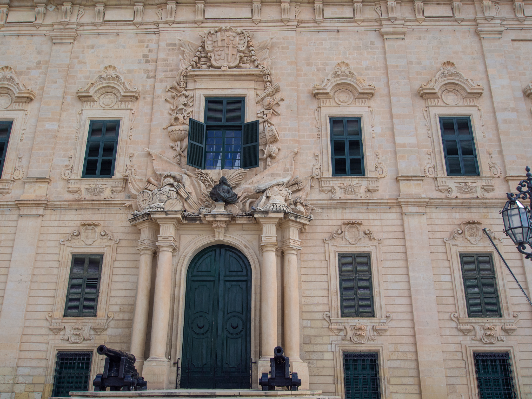 Après avoir fait le plein d'énergie, on prend un taxi pour rejoindre la capitale. On roule une vingtaine de minutes sur des routes très étroites et chargées, il y a une grande densité de population dans cette partie de l’île, qui nous rappellent plus les villes du Maghreb qu’Européennes. En arrivant à La Valette, on traverse les impressionnantes défenses de la ville, puis le taxi nous dépose sur la place à l’entrée de la cité, face à l’auberge de castille, demeure du premier ministre maltais.