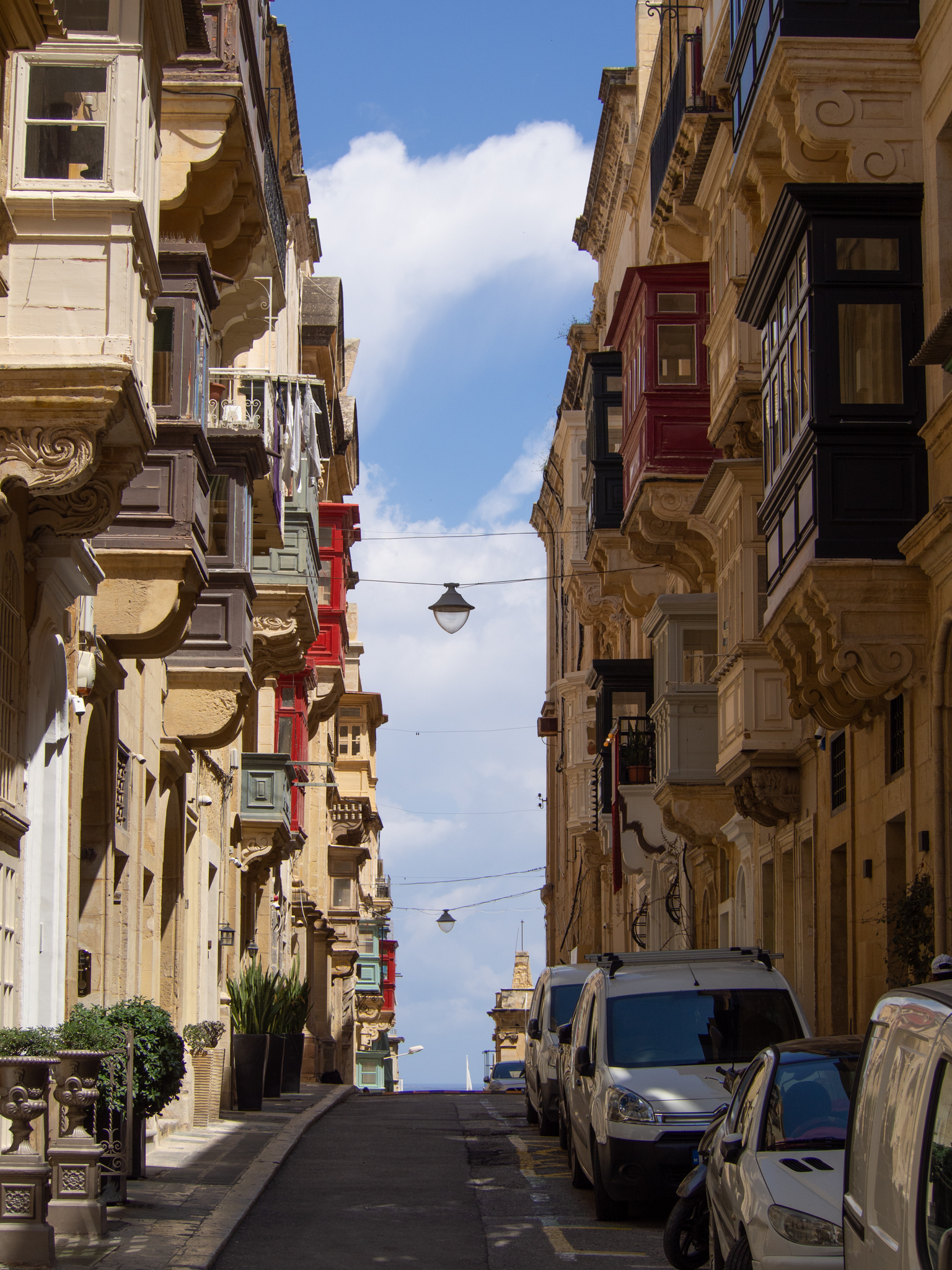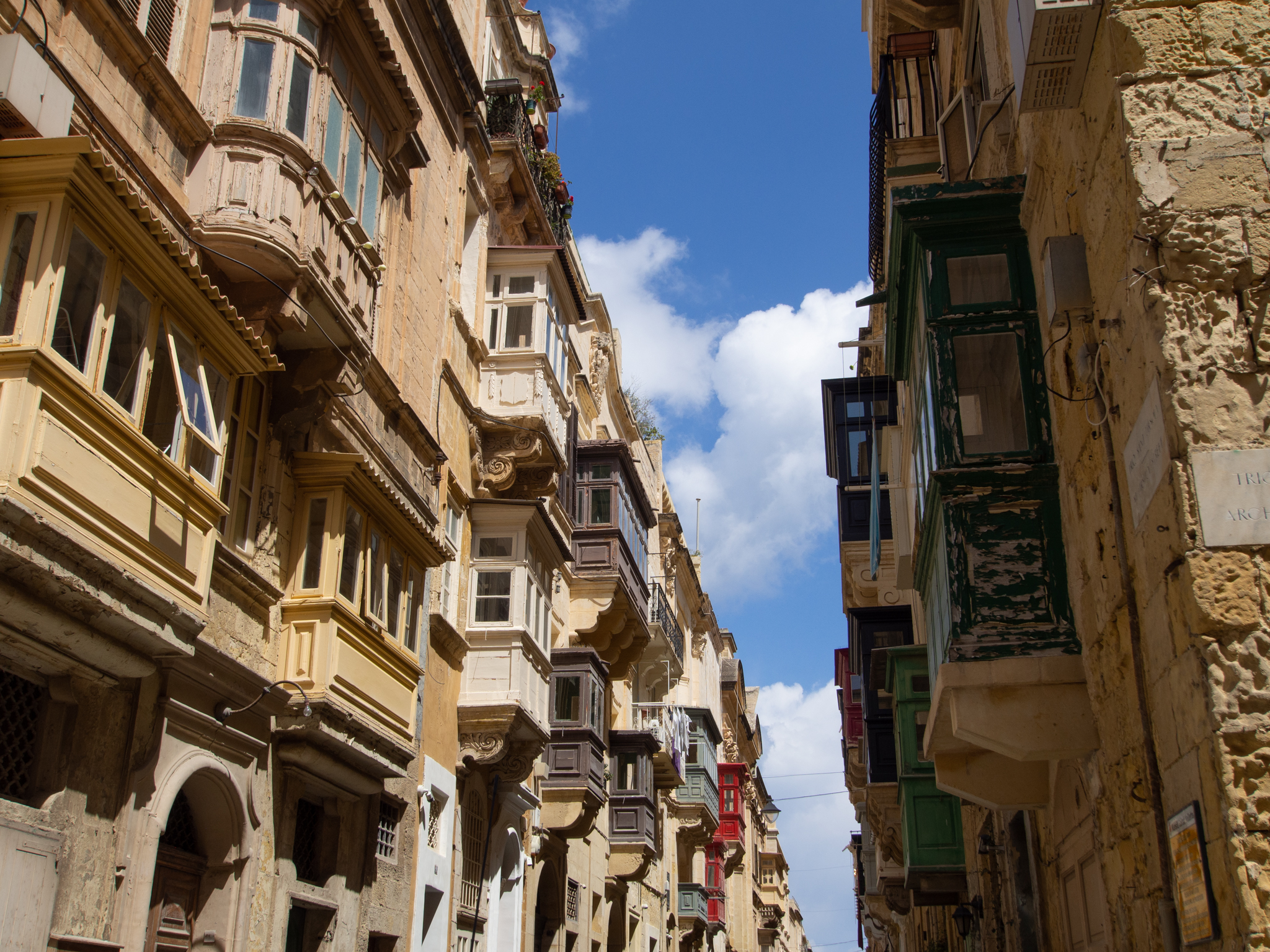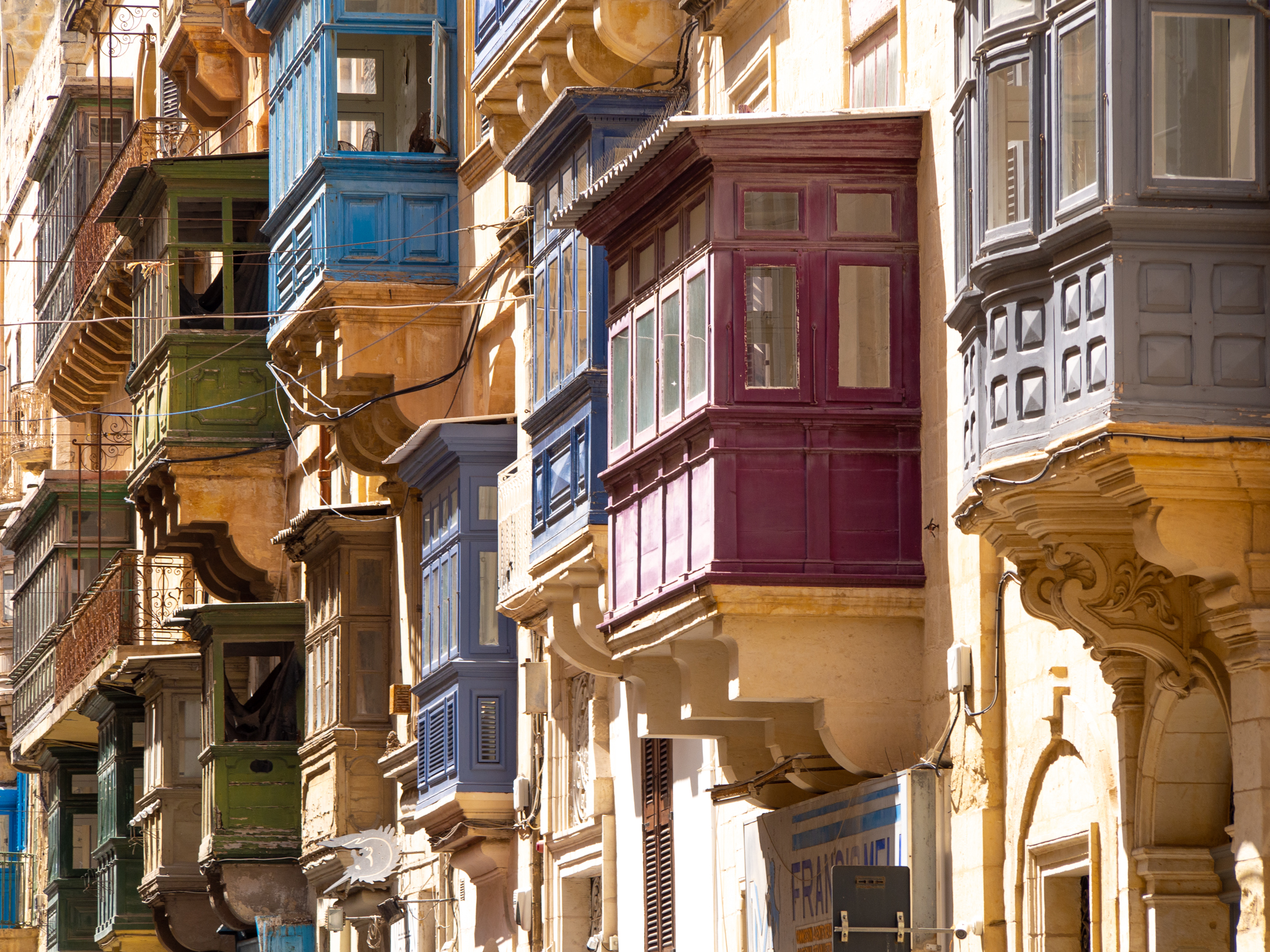 On est frappé par le nombre d’appartements qui ont des balcons couverts, souvent peints avec de belles couleurs. Il y en a un nombre incroyable dans les rues de La Valette.