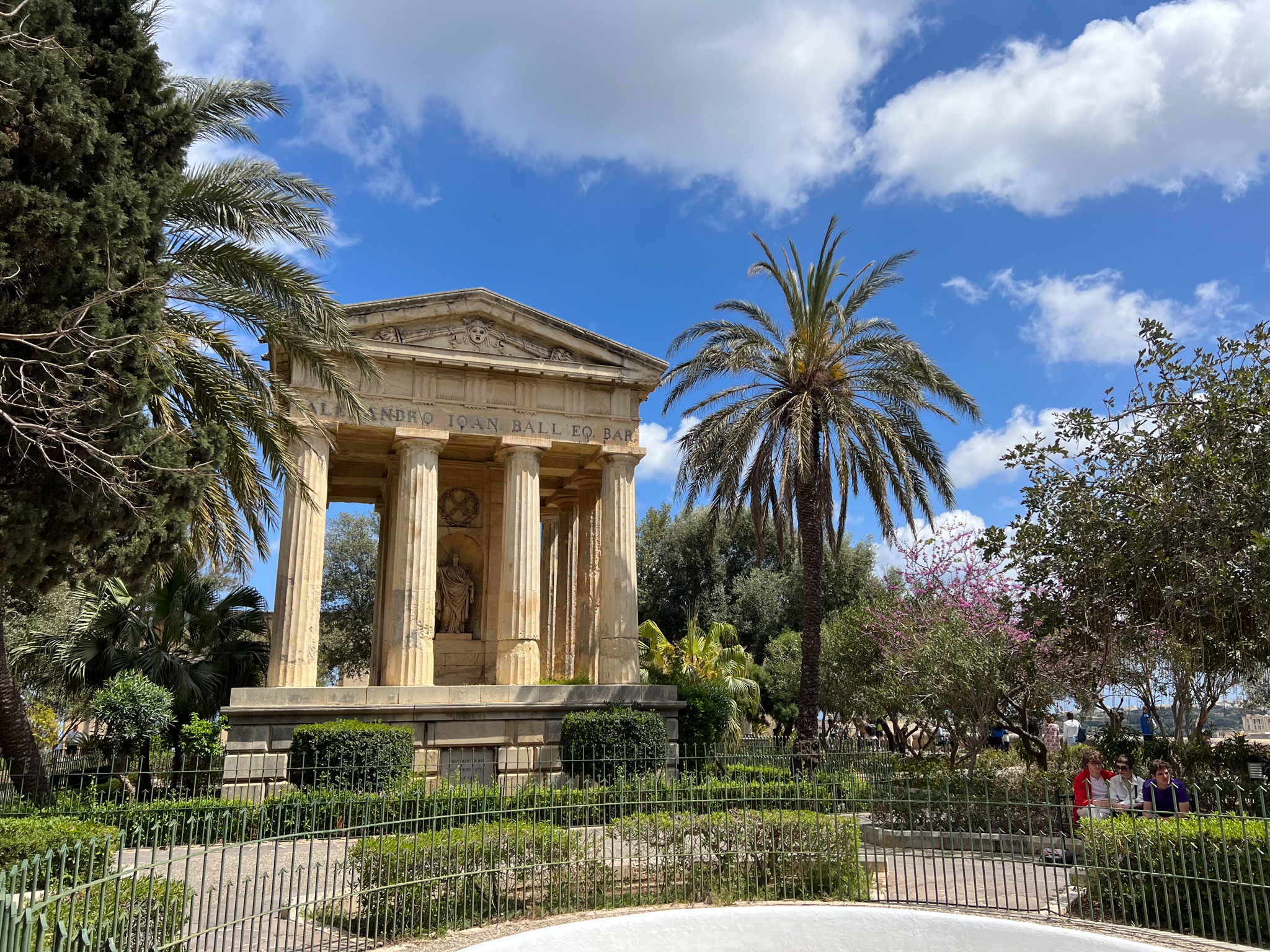 On arrive au bout de la péninsule au niveau des Lower Barrakka Gardens, un petit parc qui fait face à la mer avec de nombreux bancs publics où l’on peut faire une pause en s’installant face à la vue. Le parc est très arboré avec un monument qui s’inspire des temples grecs.