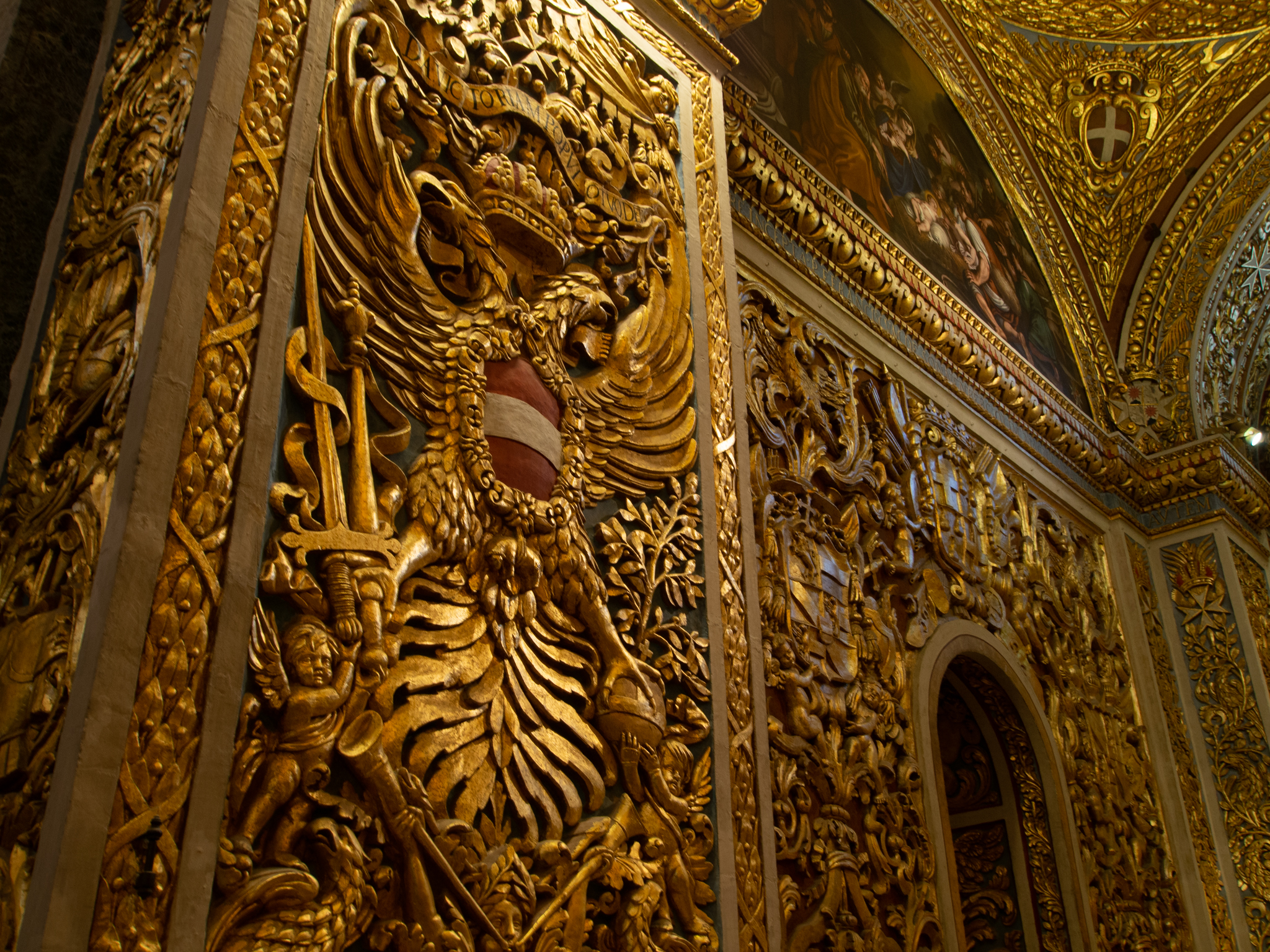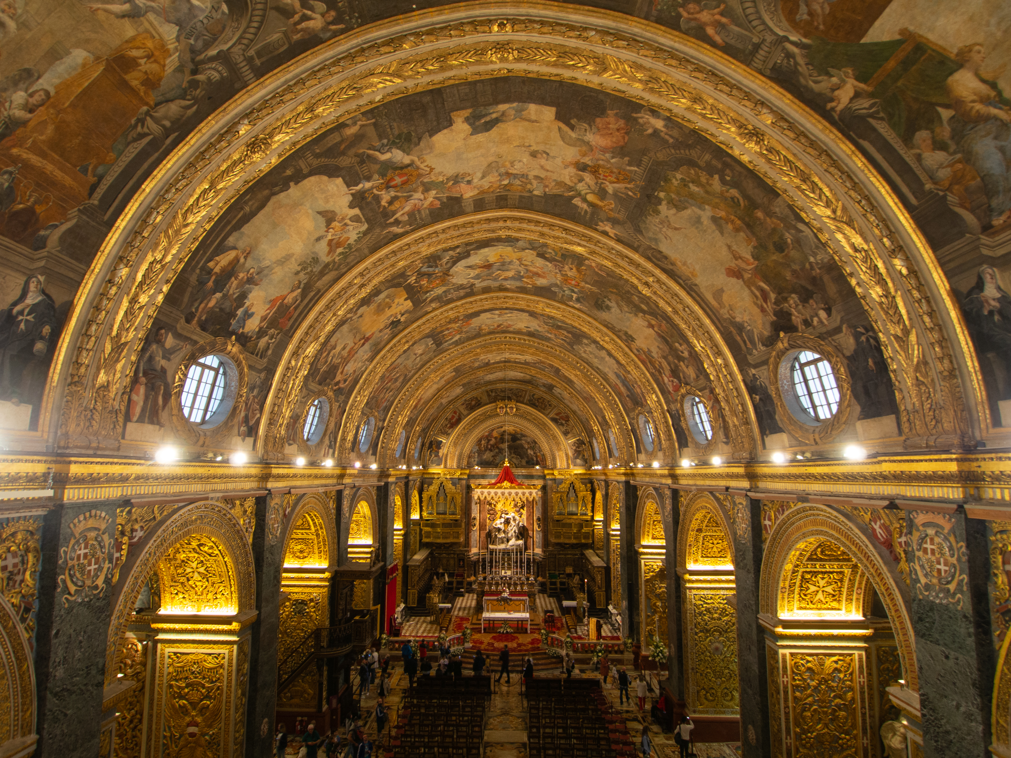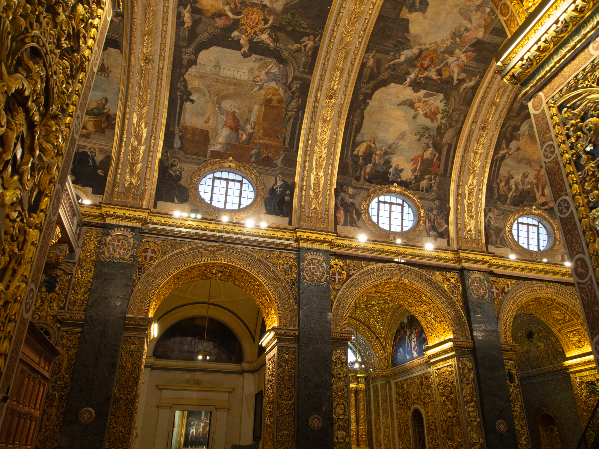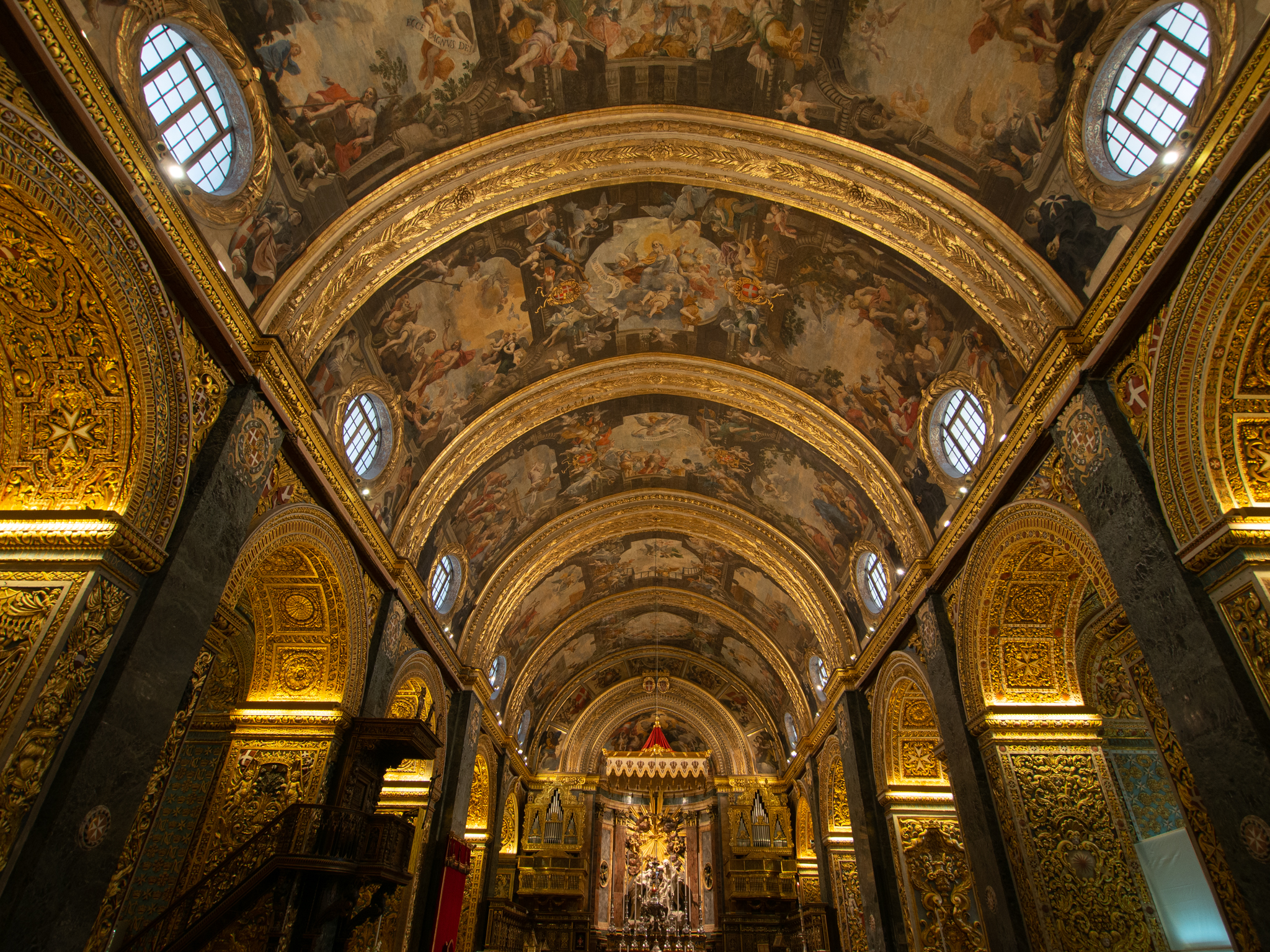 Le monument le plus remarquable de La Valette est sans doute la Co-Cathédrale de Saint Jean construite au coeur de la ville. Cette cathédrale qui a été construite au XVIe siècle ne paye pas de mine depuis l’extérieur, mais ni le ticket d’entrée ni la longue file d’attente pour entrer ne doit empêcher d’aller la découvrir. On ne savait pas à quoi nous attendre car nous n’avions pas vu de photos avant, seulement tous les guides parlaient de ce monument comme un immanquable à Malte et on comprend pourquoi, l’intérieur de la cathédrale est décoré dans un style baroque qui détonne avec toutes ces dorures et peintures magnifiques.