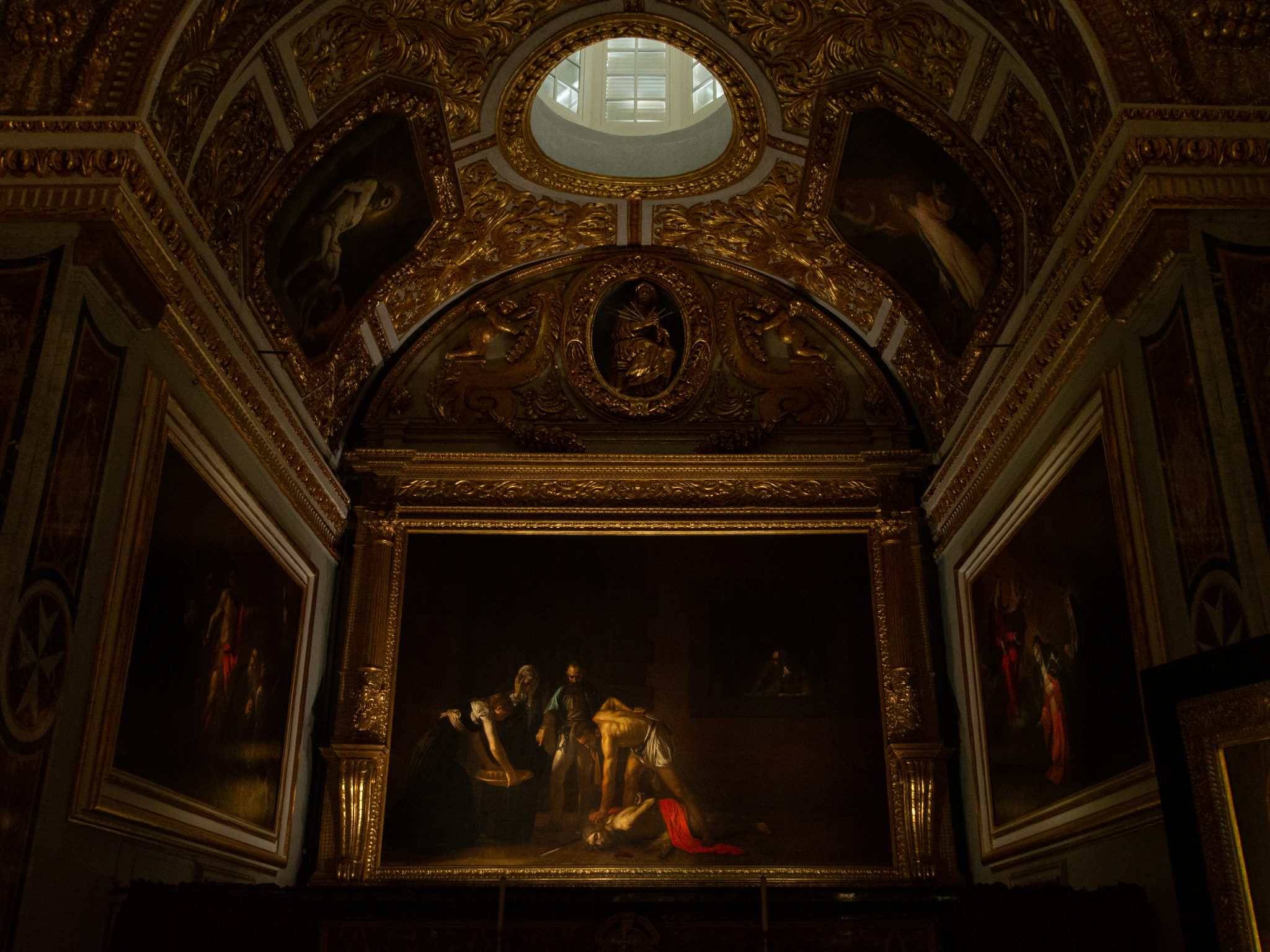 Dans la dernière chapelle, on trouve une des oeuvres les plus précieuses conservées dans la cathédrale, il s’agit de la peinture du Caravage, la Decollazione di san Giovanni Battista, qui joue brillamment avec la lumière dans un tableau tellement ténébreux.