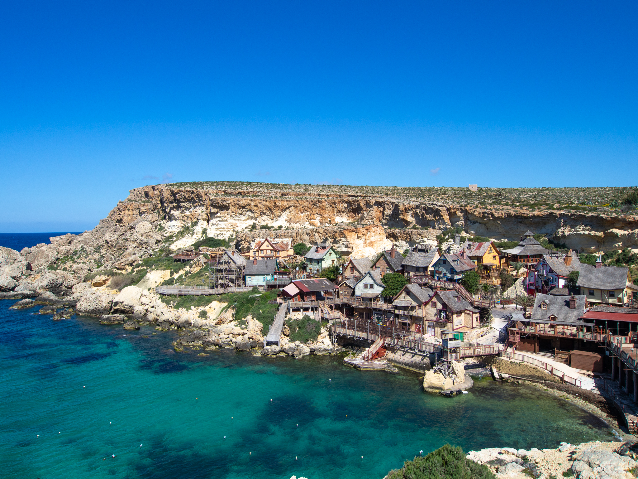 On passe par une partie plus sauvage et agricole de l’île après être sorti de la zone urbaine de La Valette. On arrive au premier arrêt de la journée, le Popeye village. C’est en fait le lieu de tournage d’une comédie musicale anglaise qui a été conservé et aujourd’hui attire beaucoup les touristes pour son emplacement au bord d’une crique à l’eau bleue.